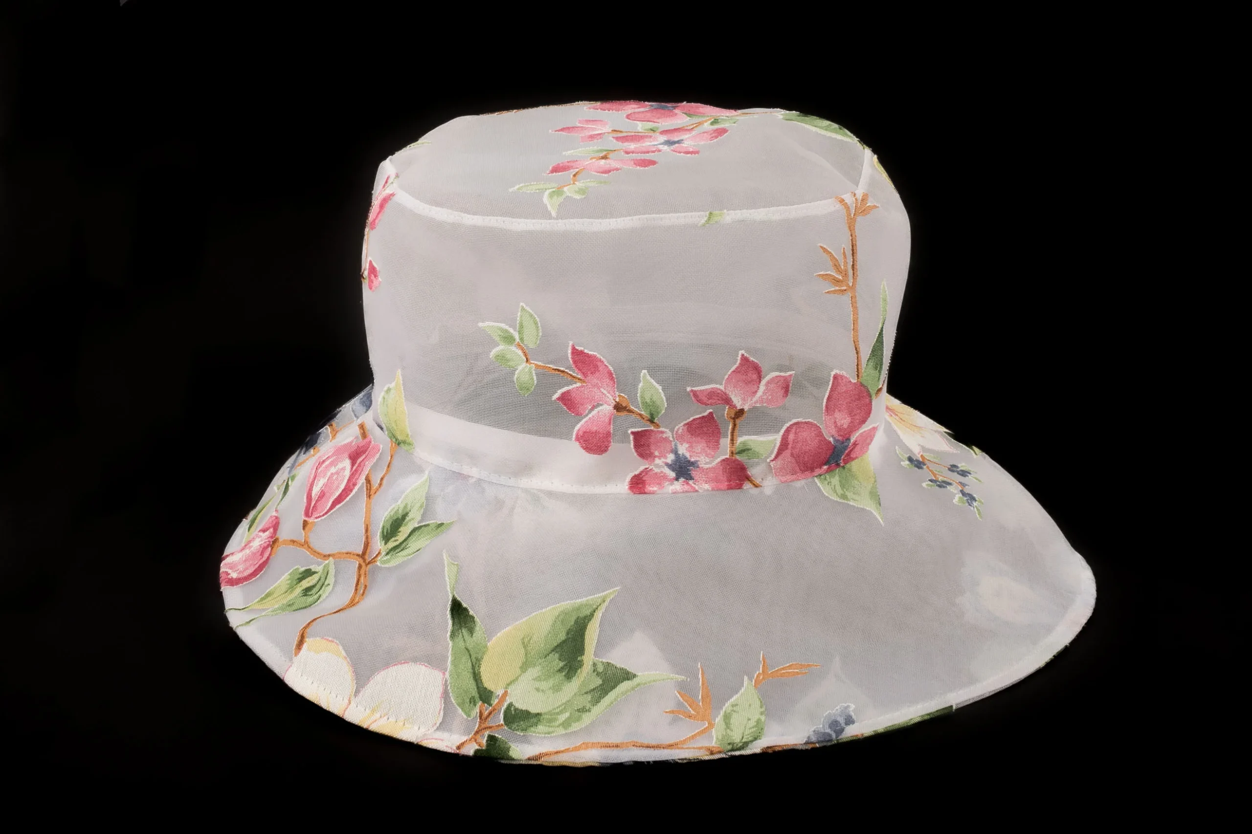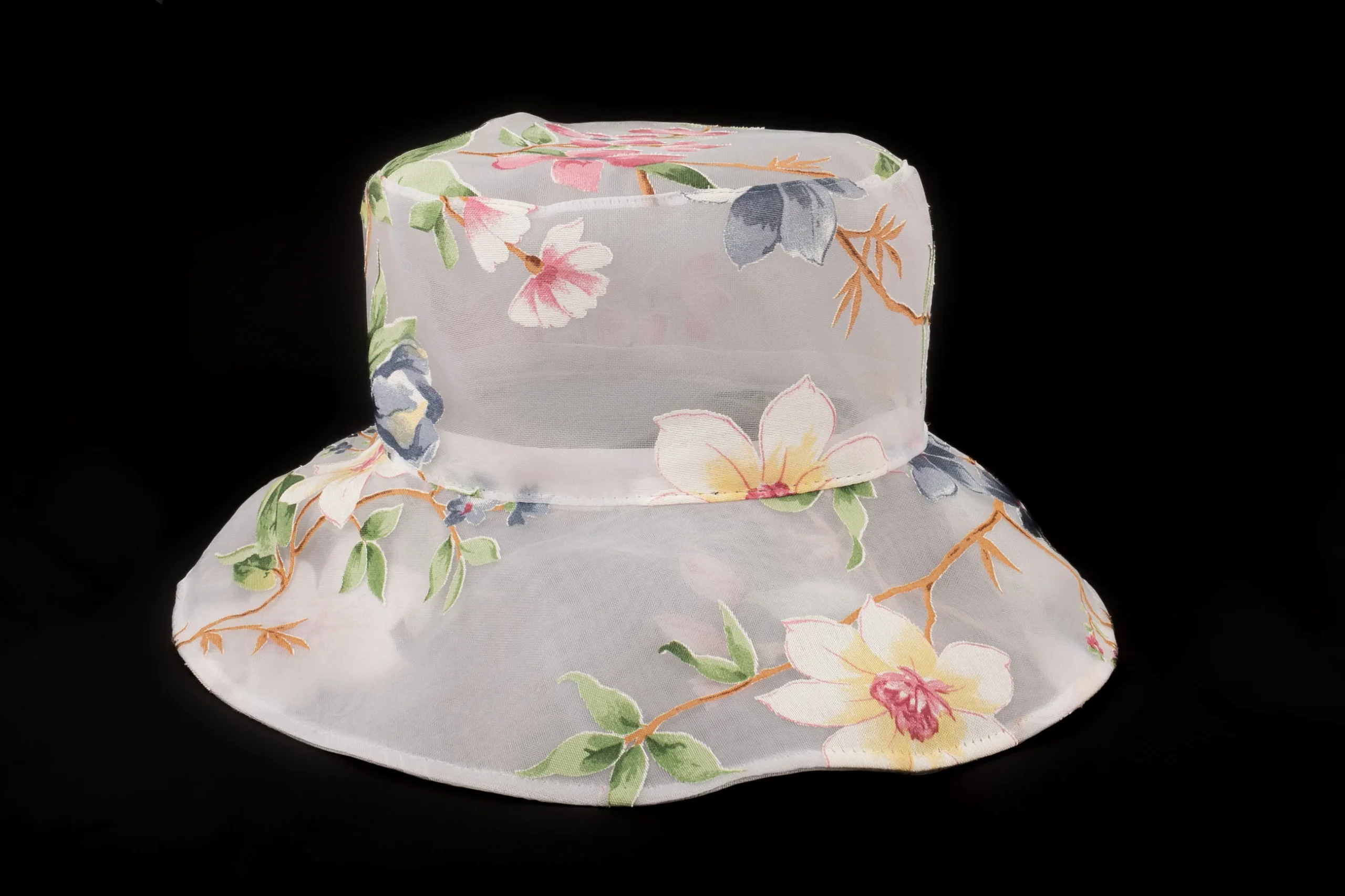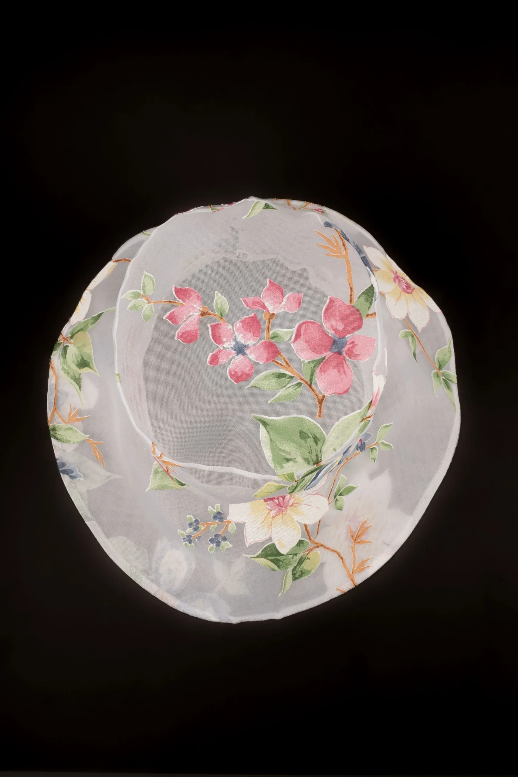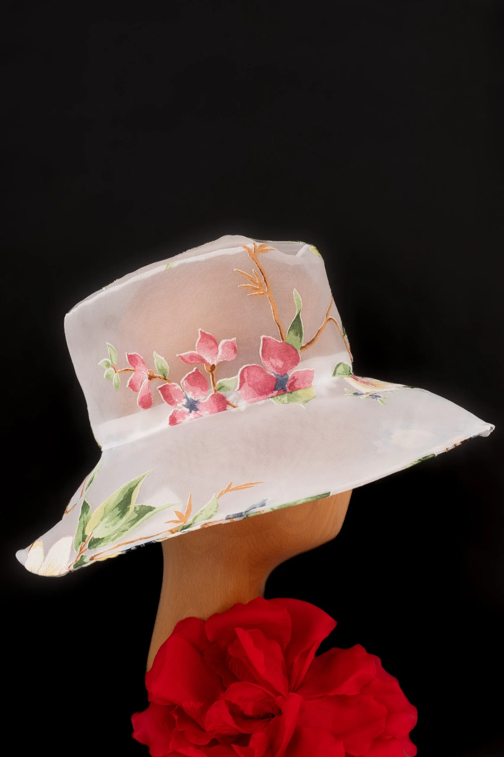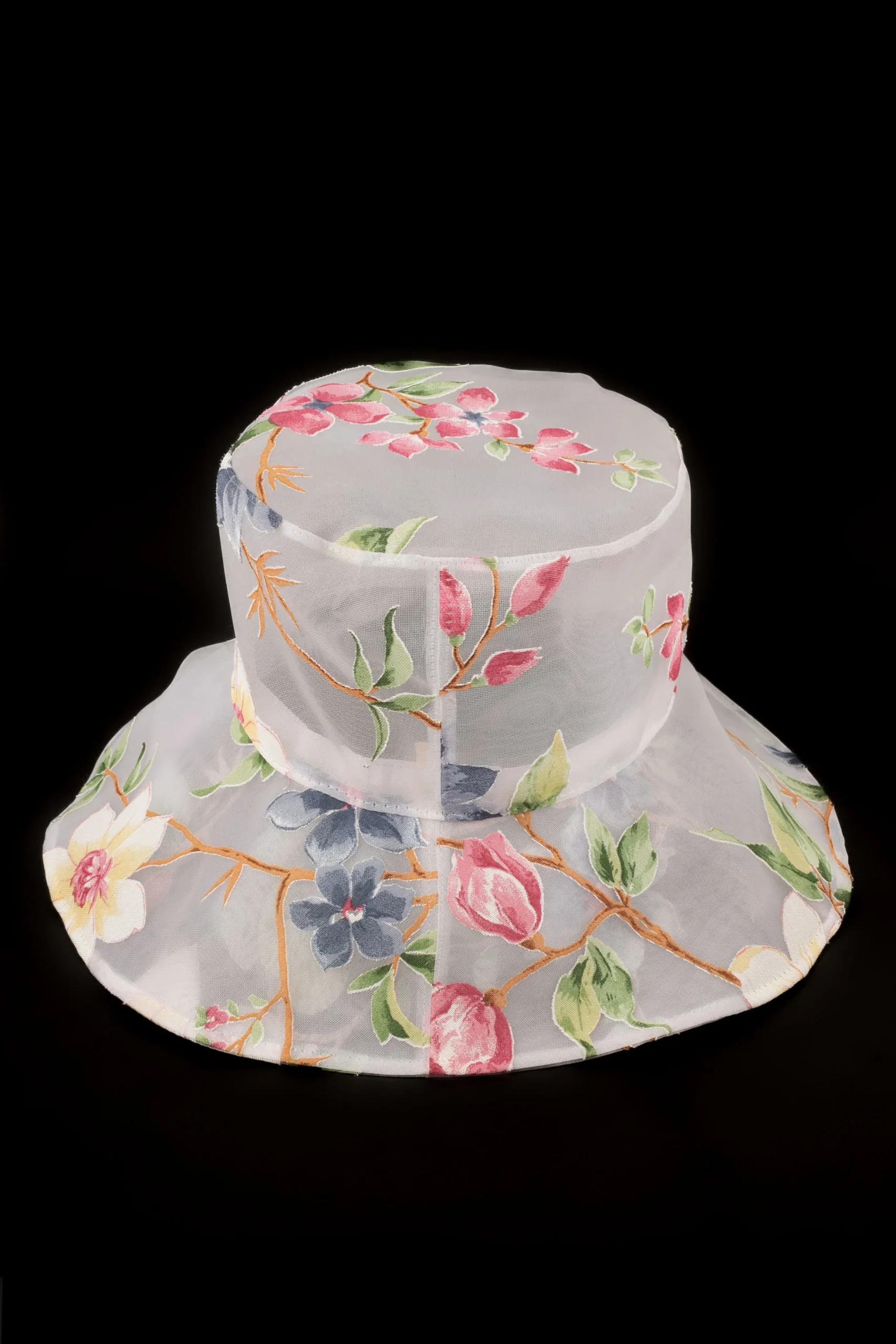 MARIE MERCIà -(Made in France) Chapeau en organdi blanc peint de fleurs. Condition : Très bon état Dimensions : Taille 57