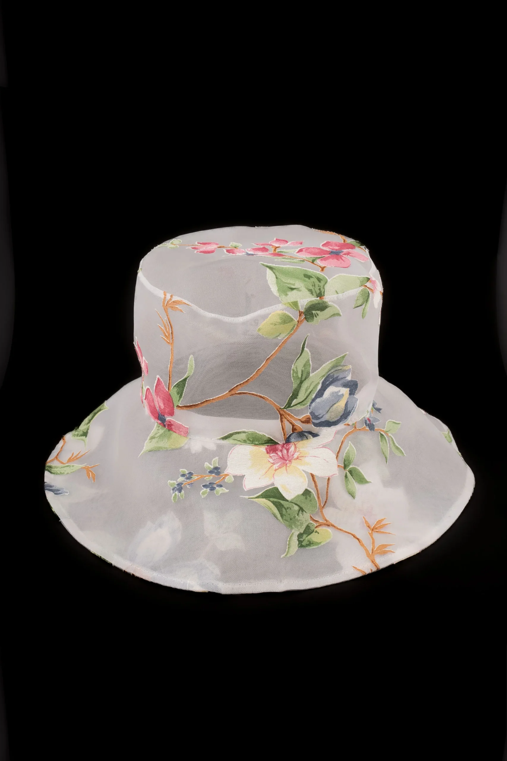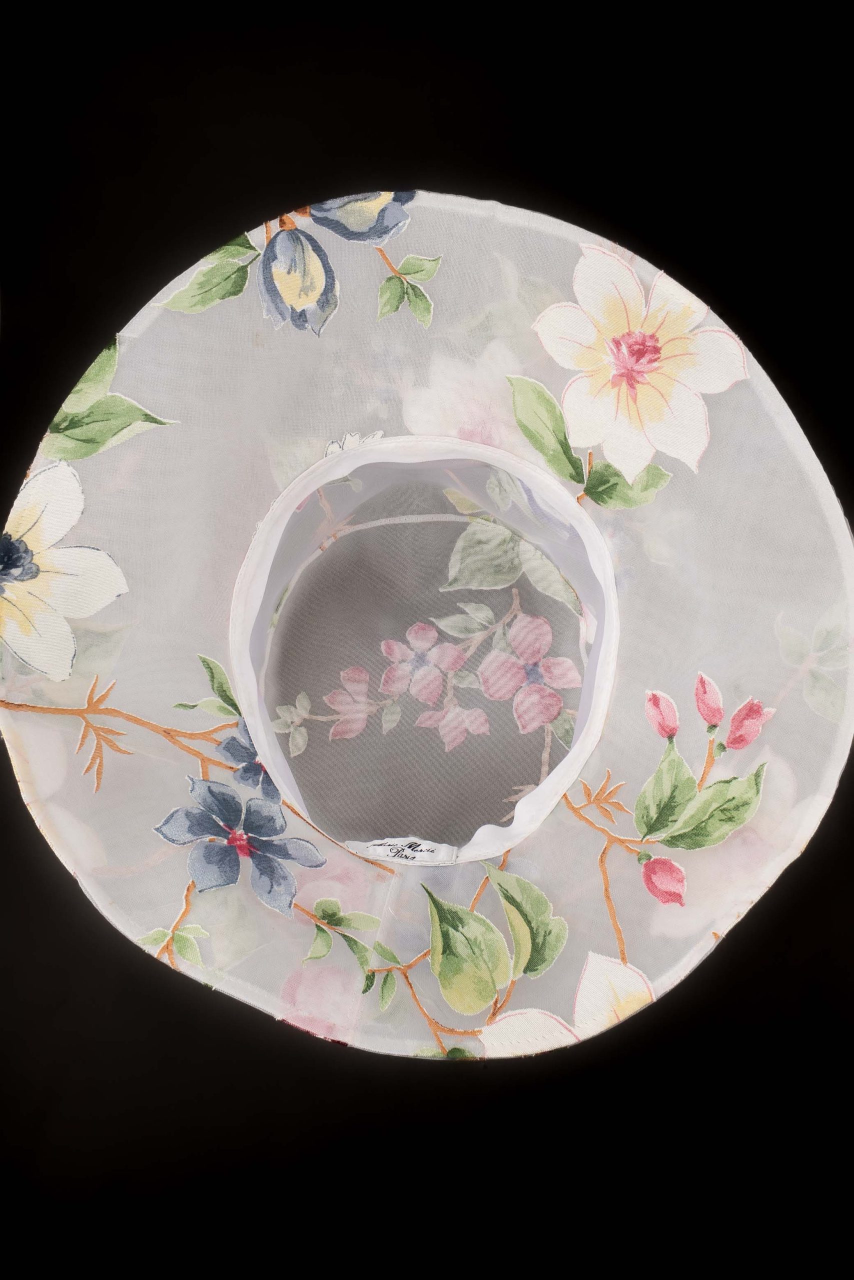 MARIE MERCIĆ -(Made in France) Chapeau en organdi blanc peint de fleurs.