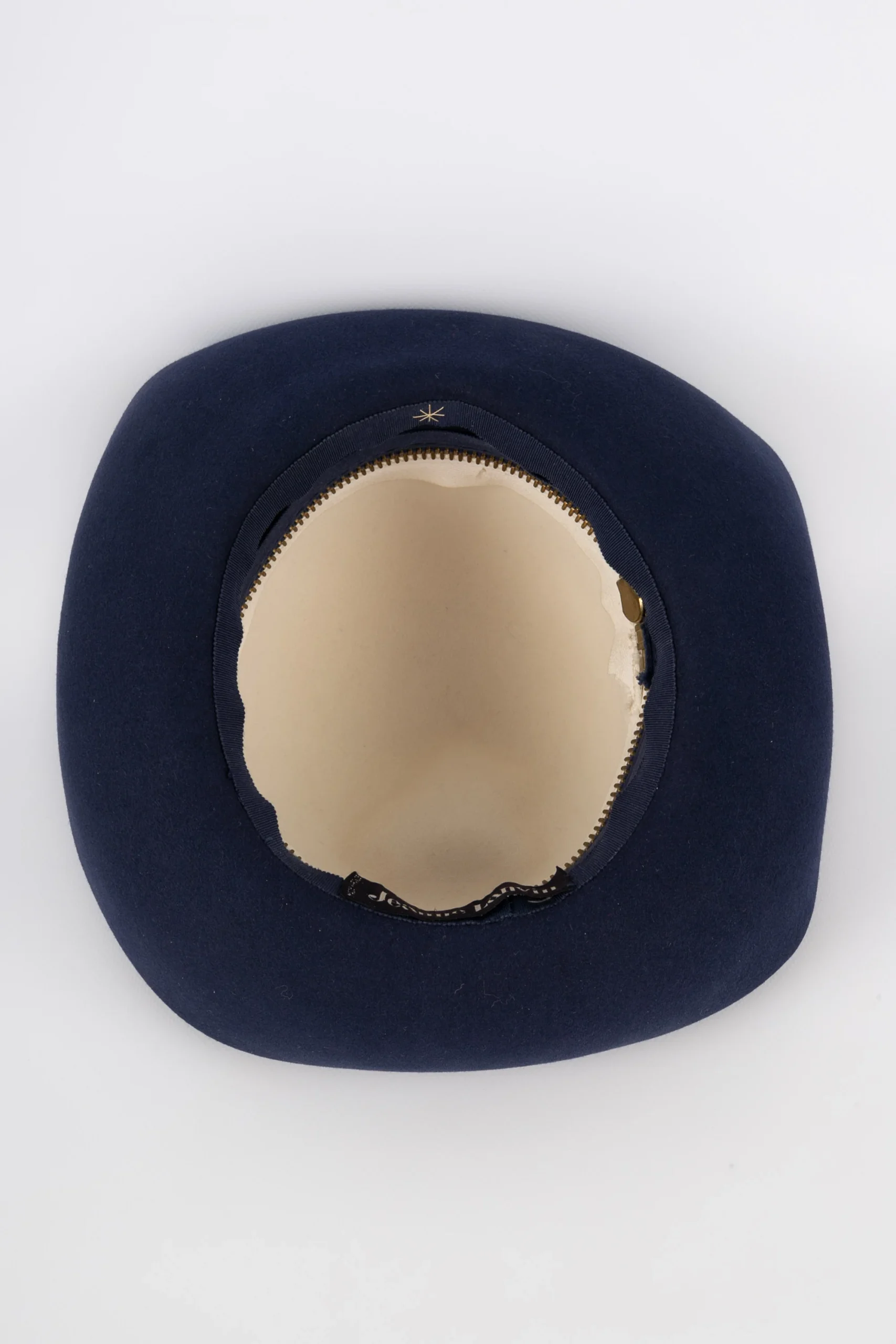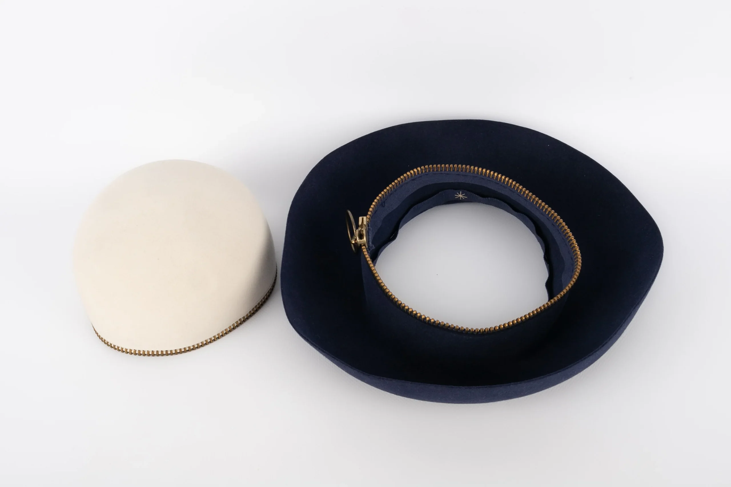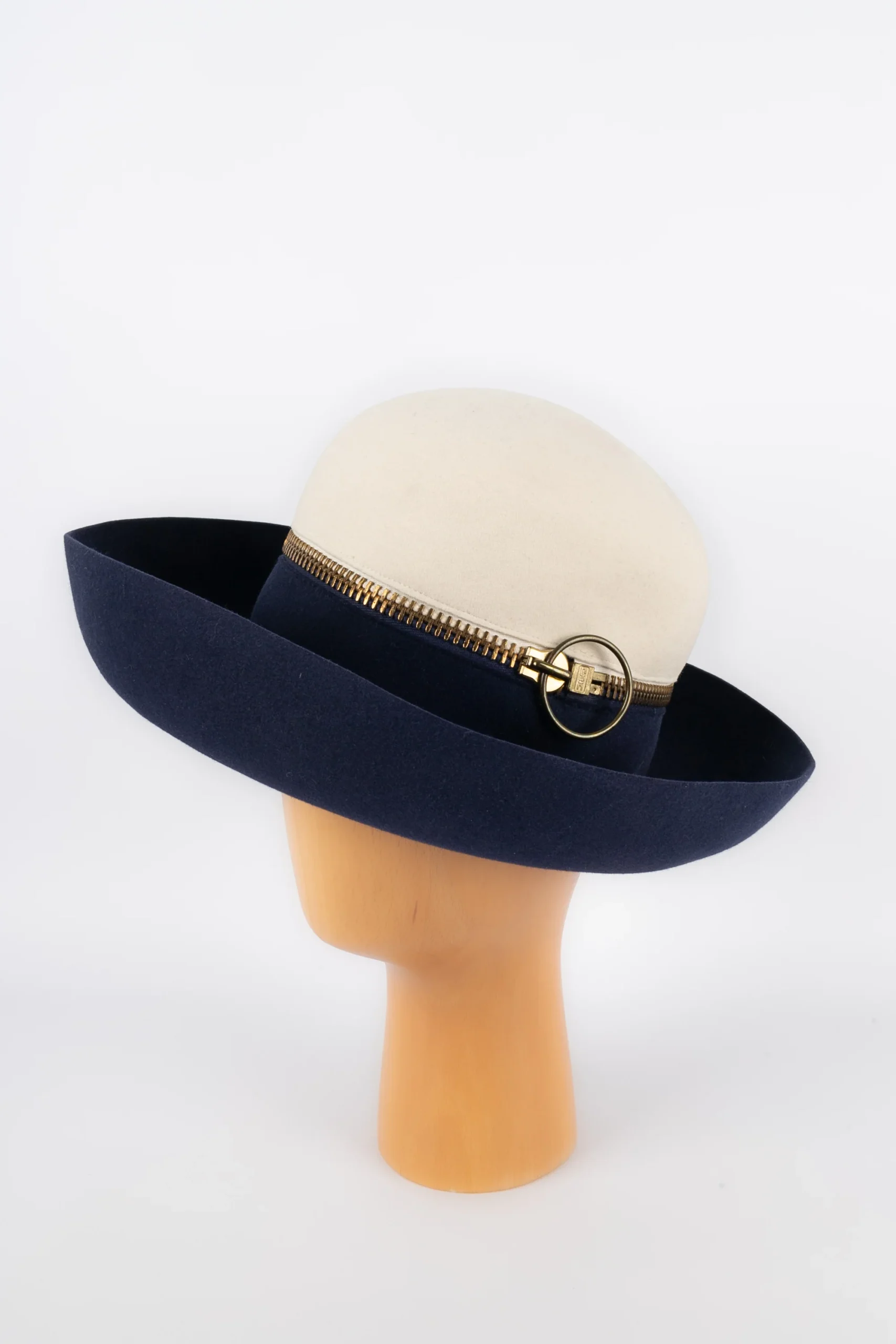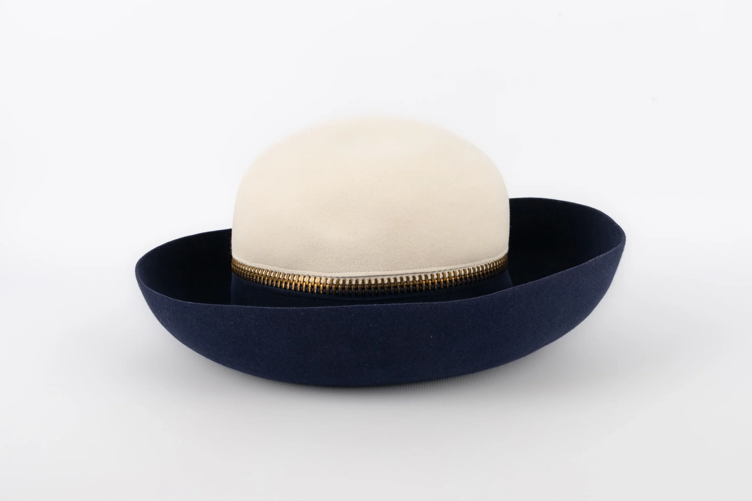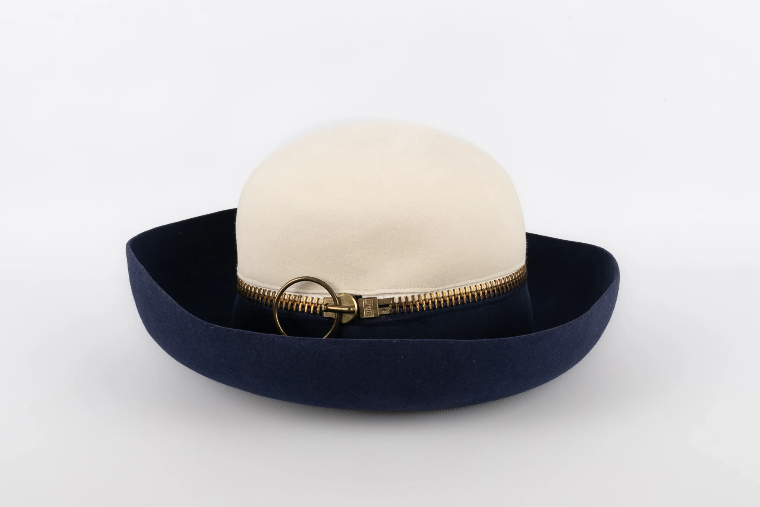 LANVIN -(Made in France) Chapeau en feutre blanc et bleu agrémenté d’un zip en métal doré.
