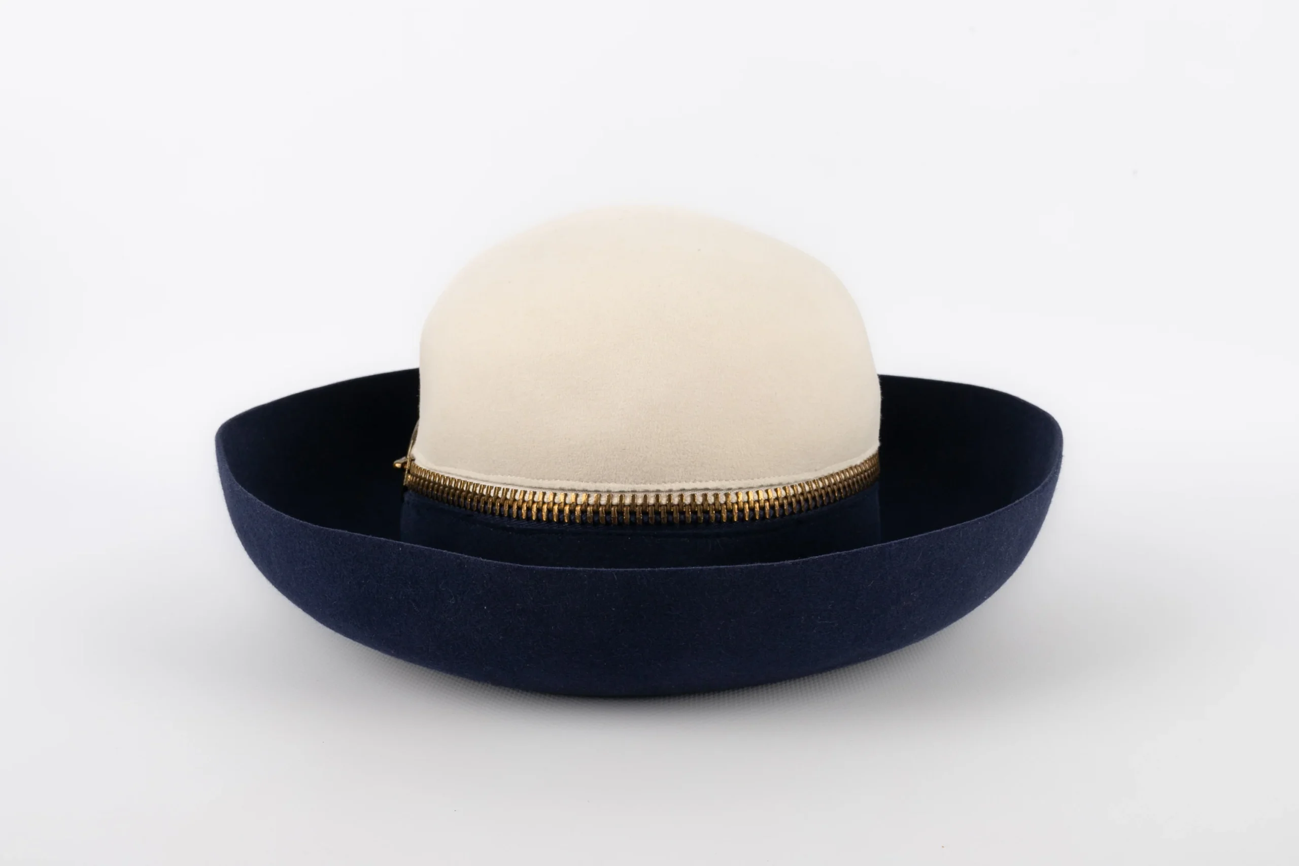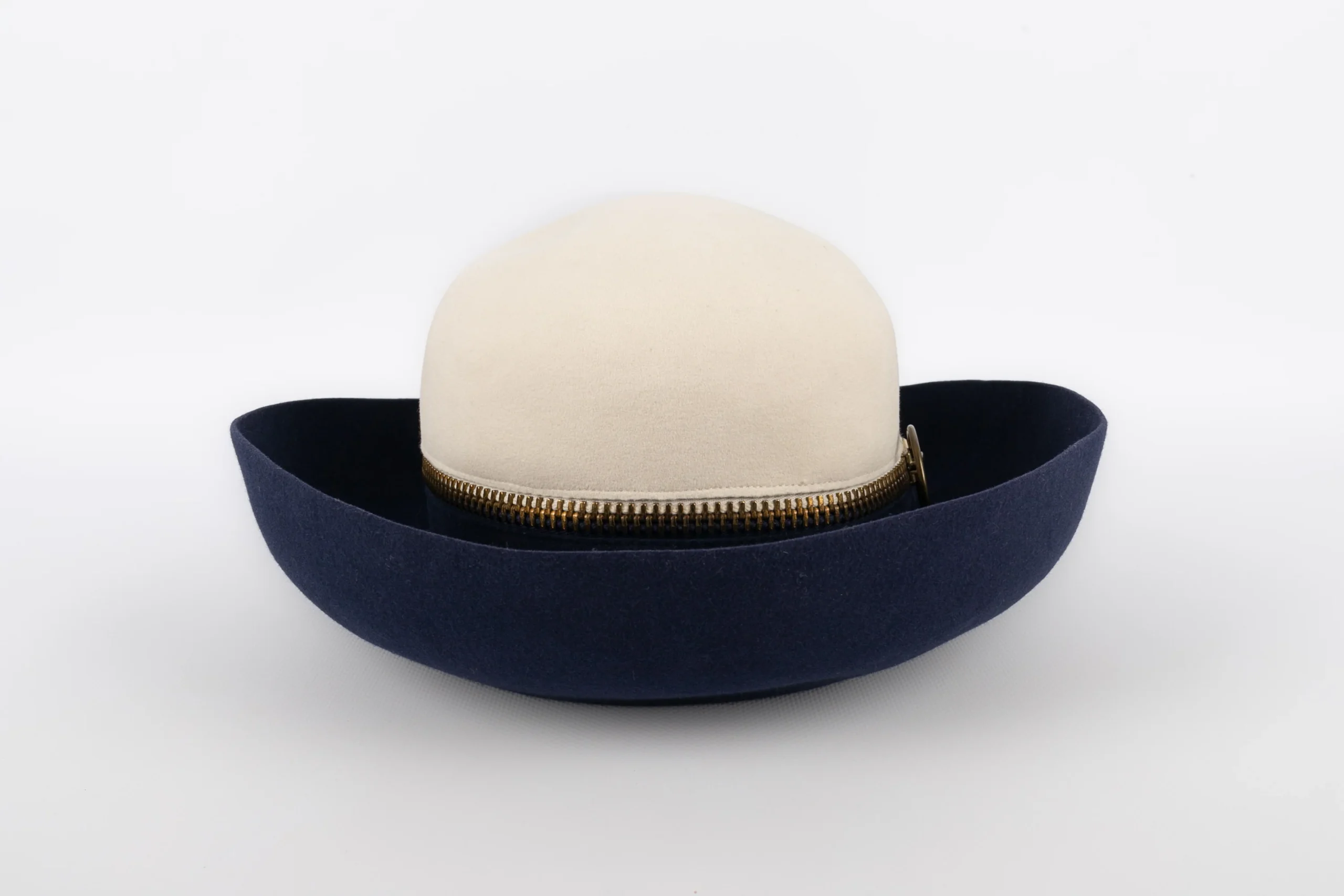 LANVIN -(Made in France) Chapeau en feutre blanc et bleu agrémenté d’un zip en métal doré. Condition : Très bon état Dimensions : Tour de tête : 51 cm