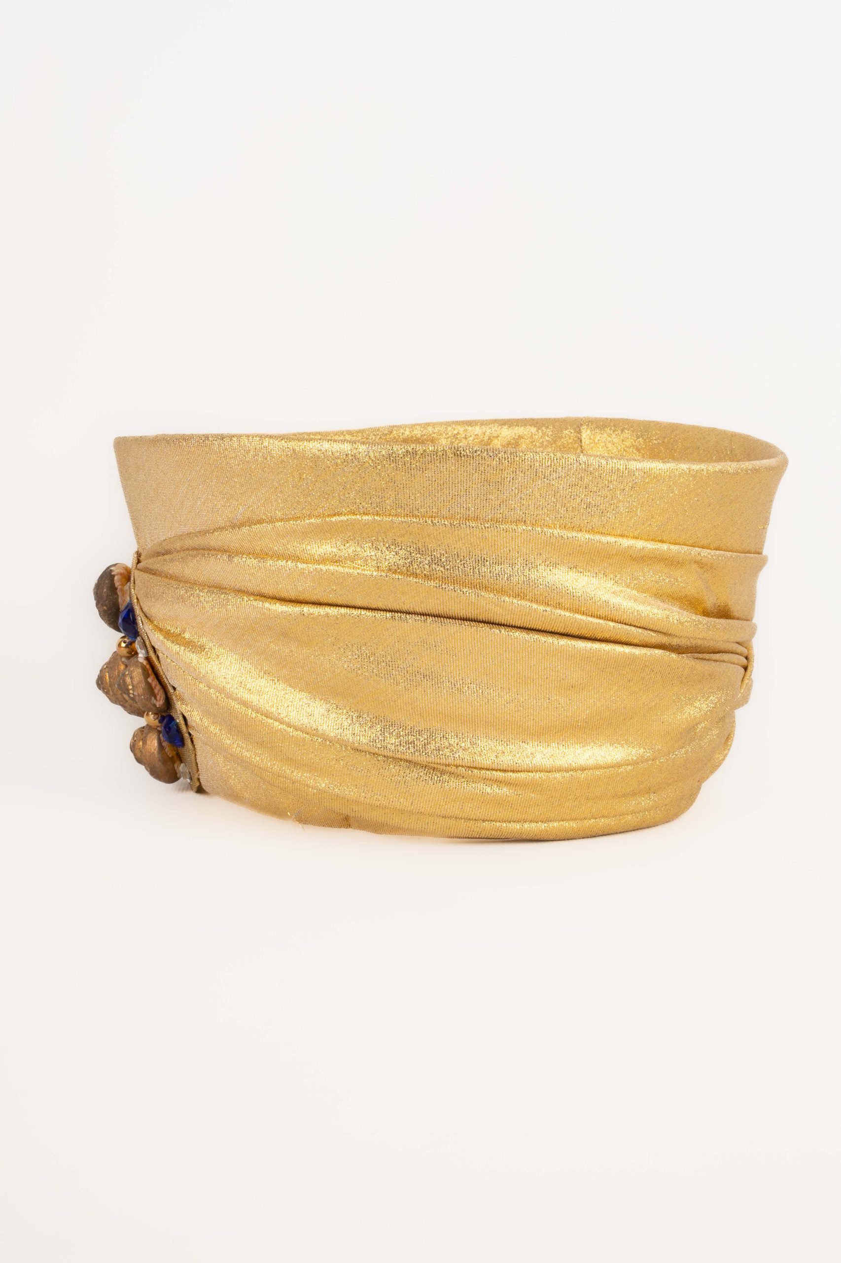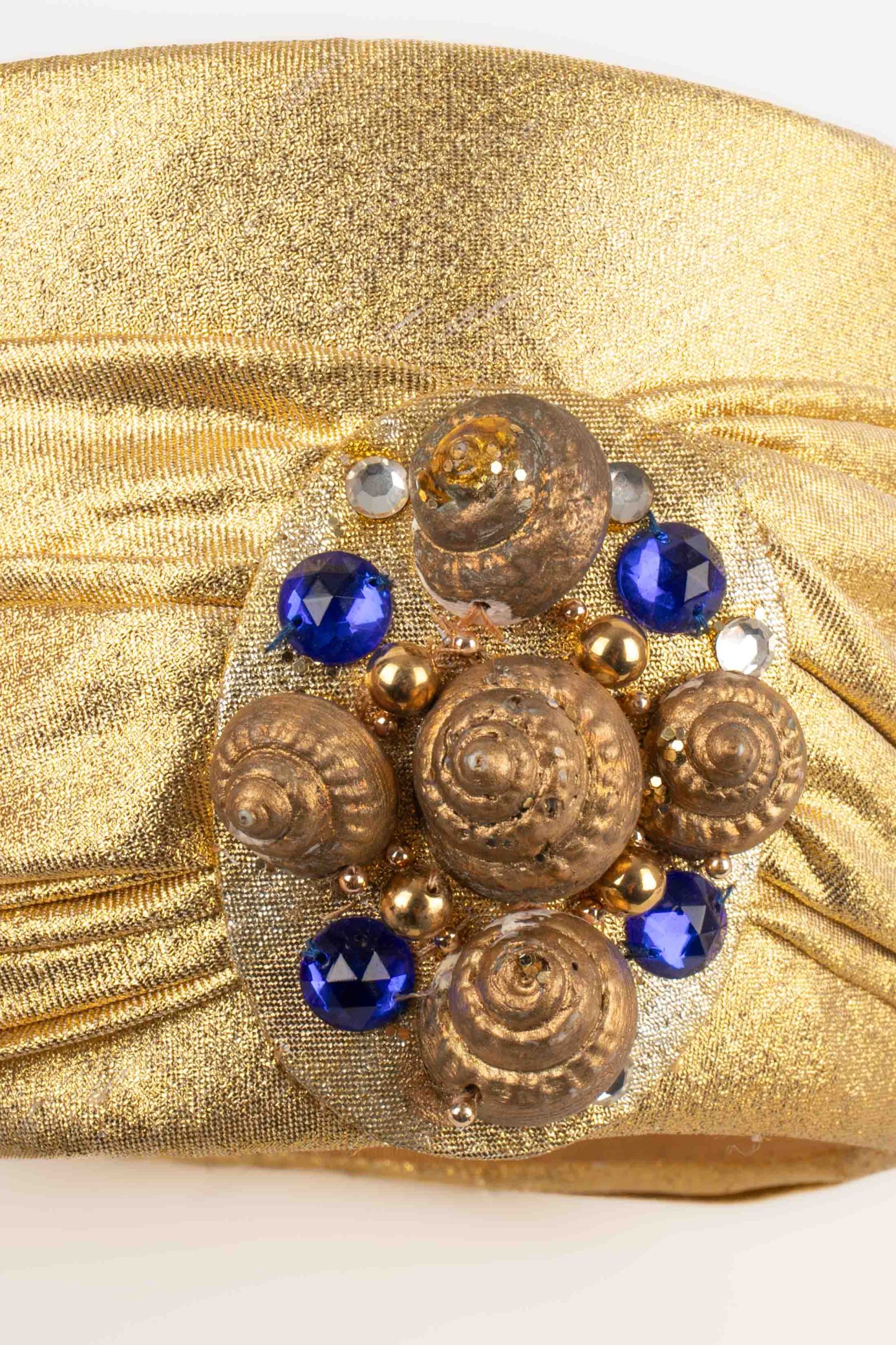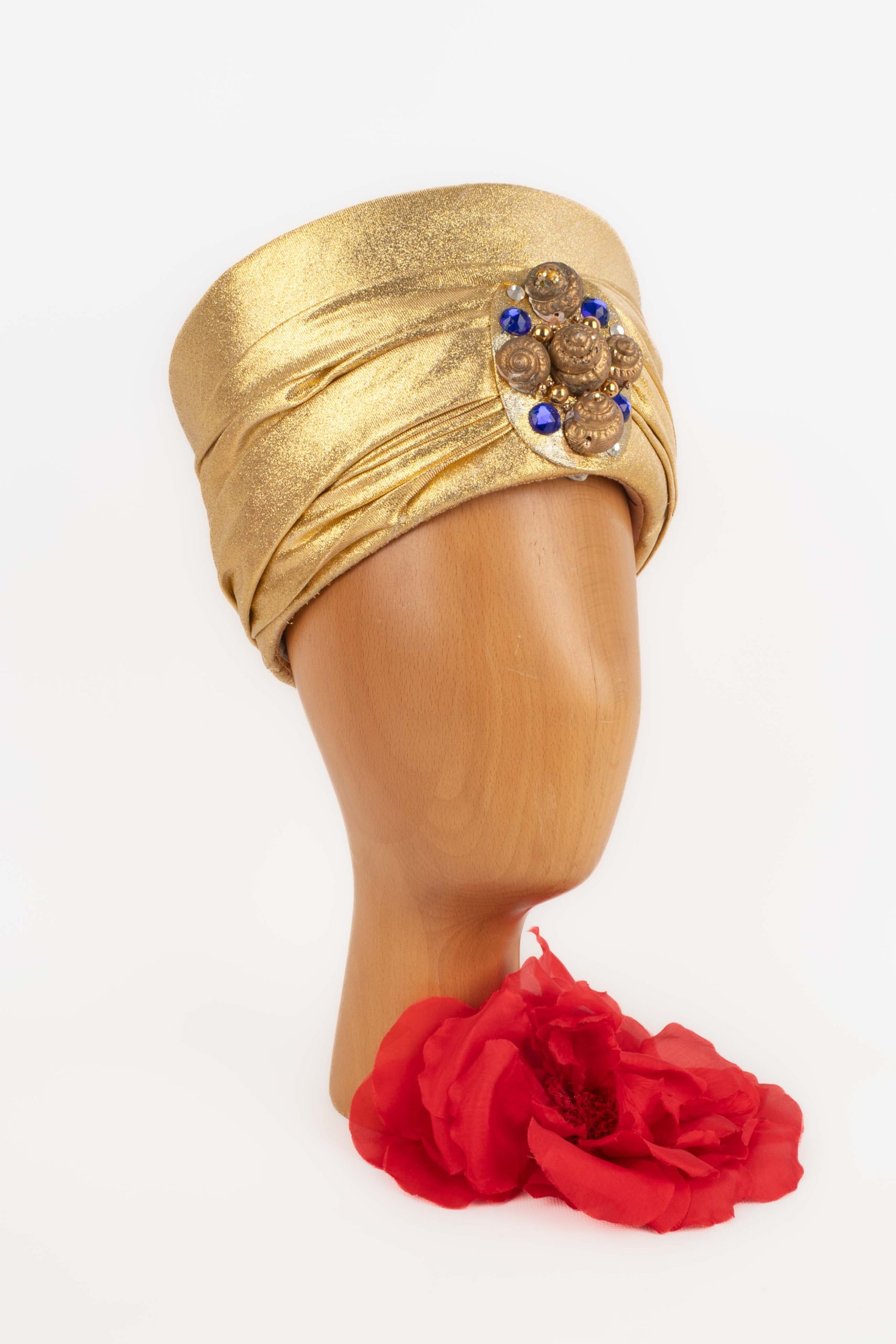 PAULETTE -Chapeau en fils lurex doré décoré au centre de strass et d’escargots en métal doré. Condition : Bon état Dimensions : Tour de tête : 52 cm