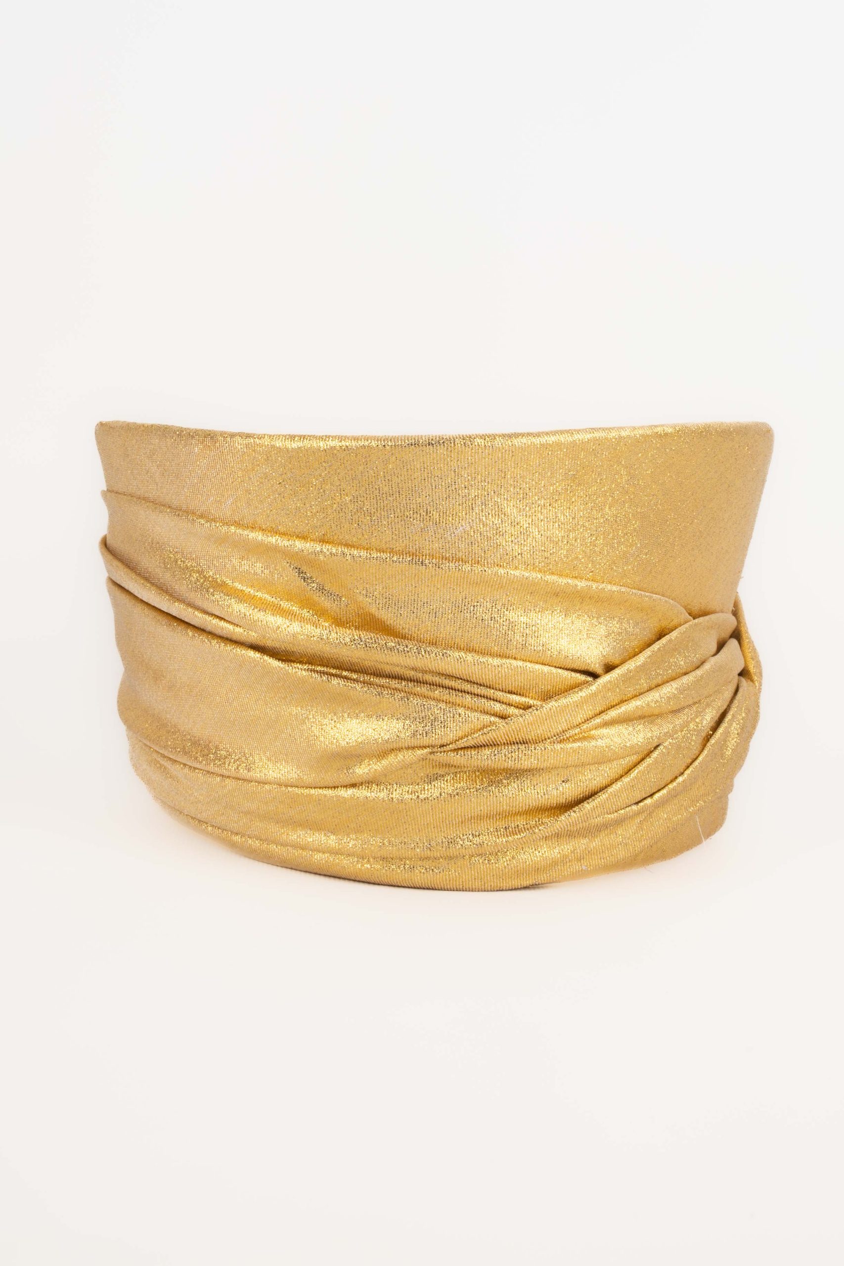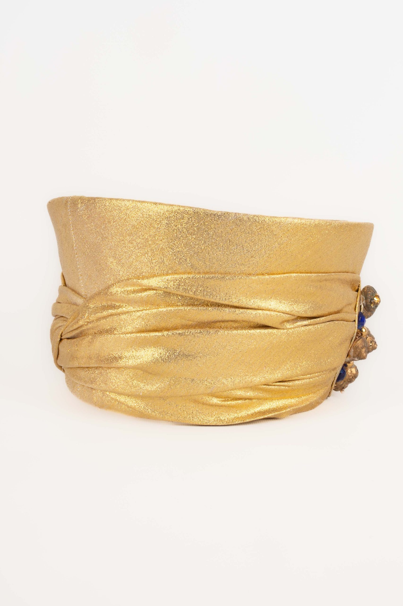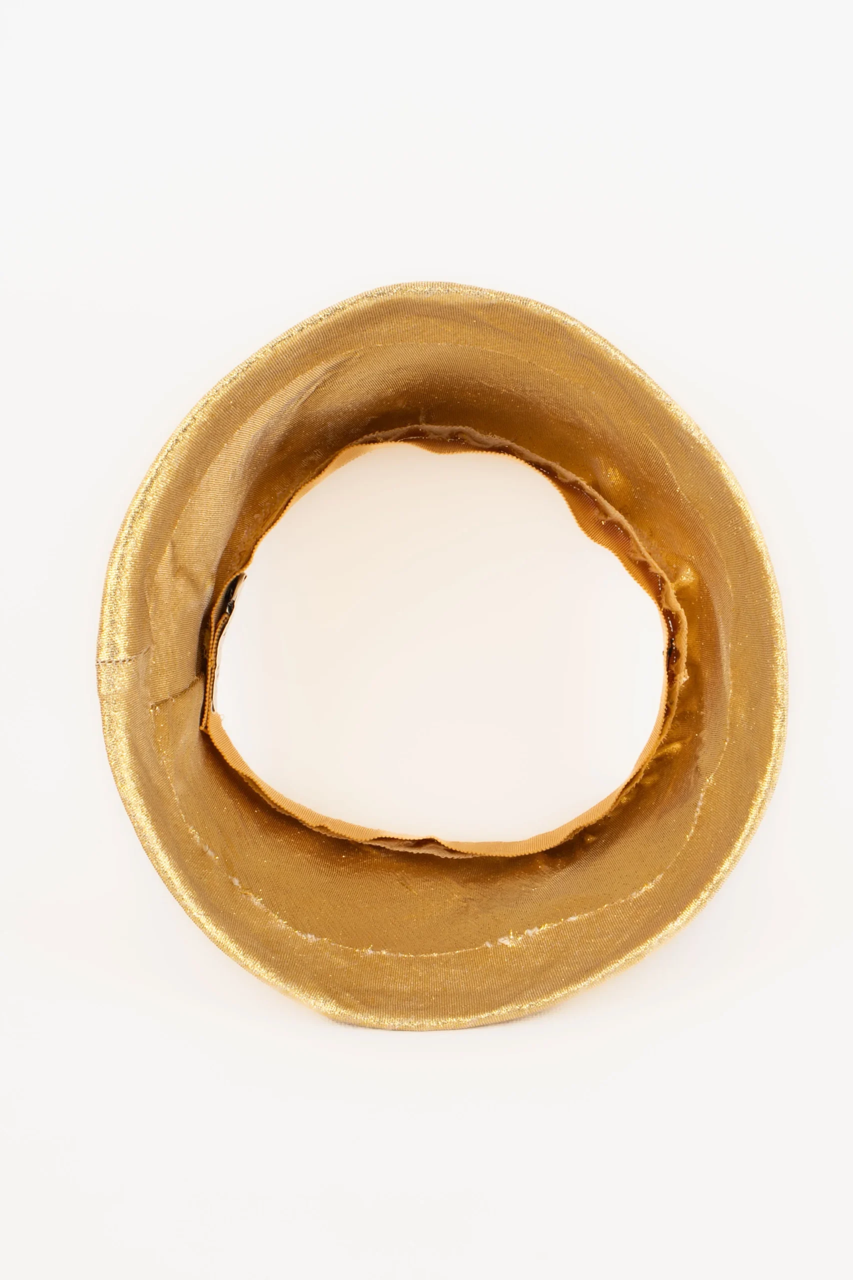 PAULETTE -Chapeau en fils lurex doré décoré au centre de strass et d’escargots en métal doré. Condition : Bon état Dimensions : Tour de tête : 52 cm
