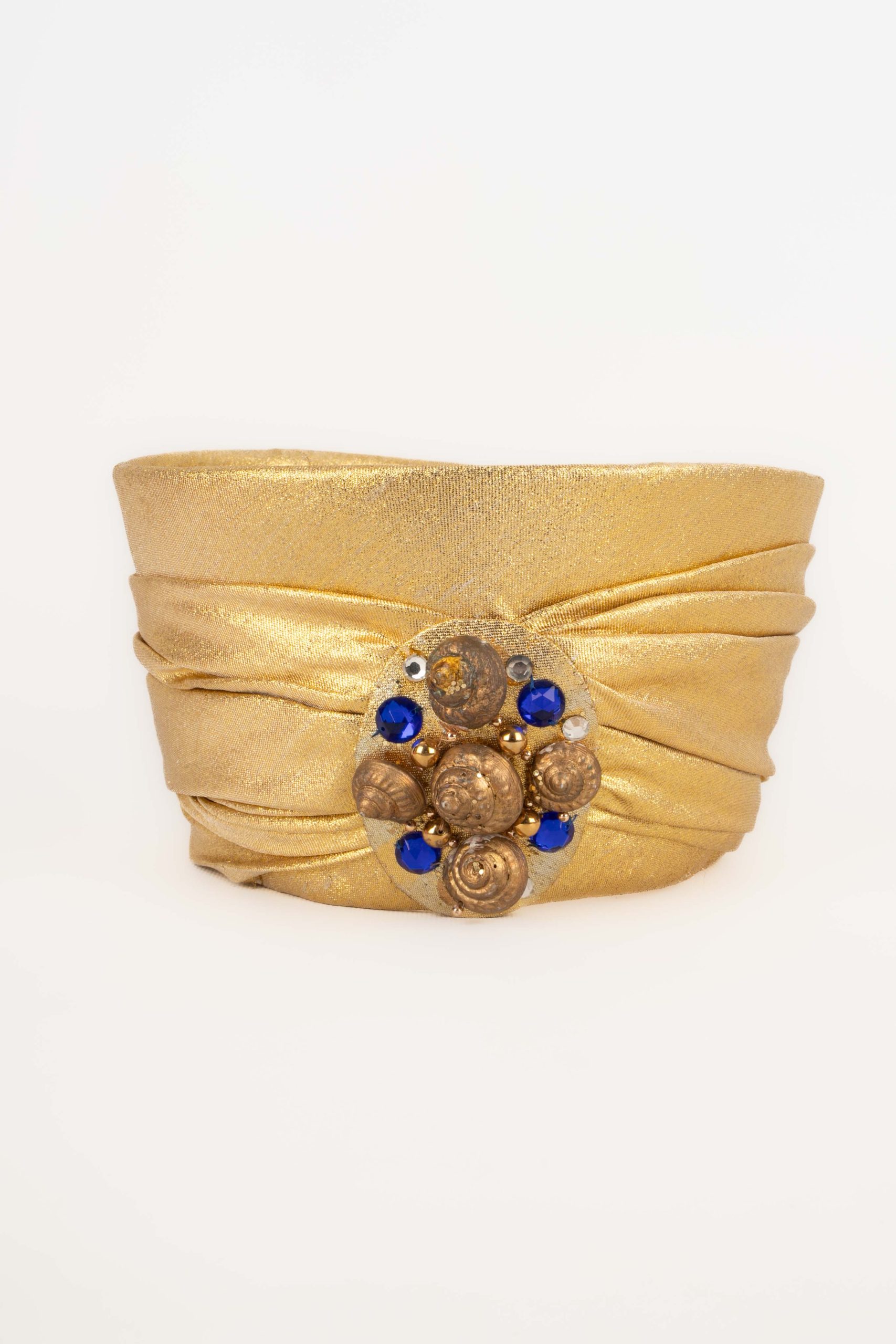 PAULETTE -Chapeau en fils lurex doré décoré au centre de strass et d’escargots en métal doré.