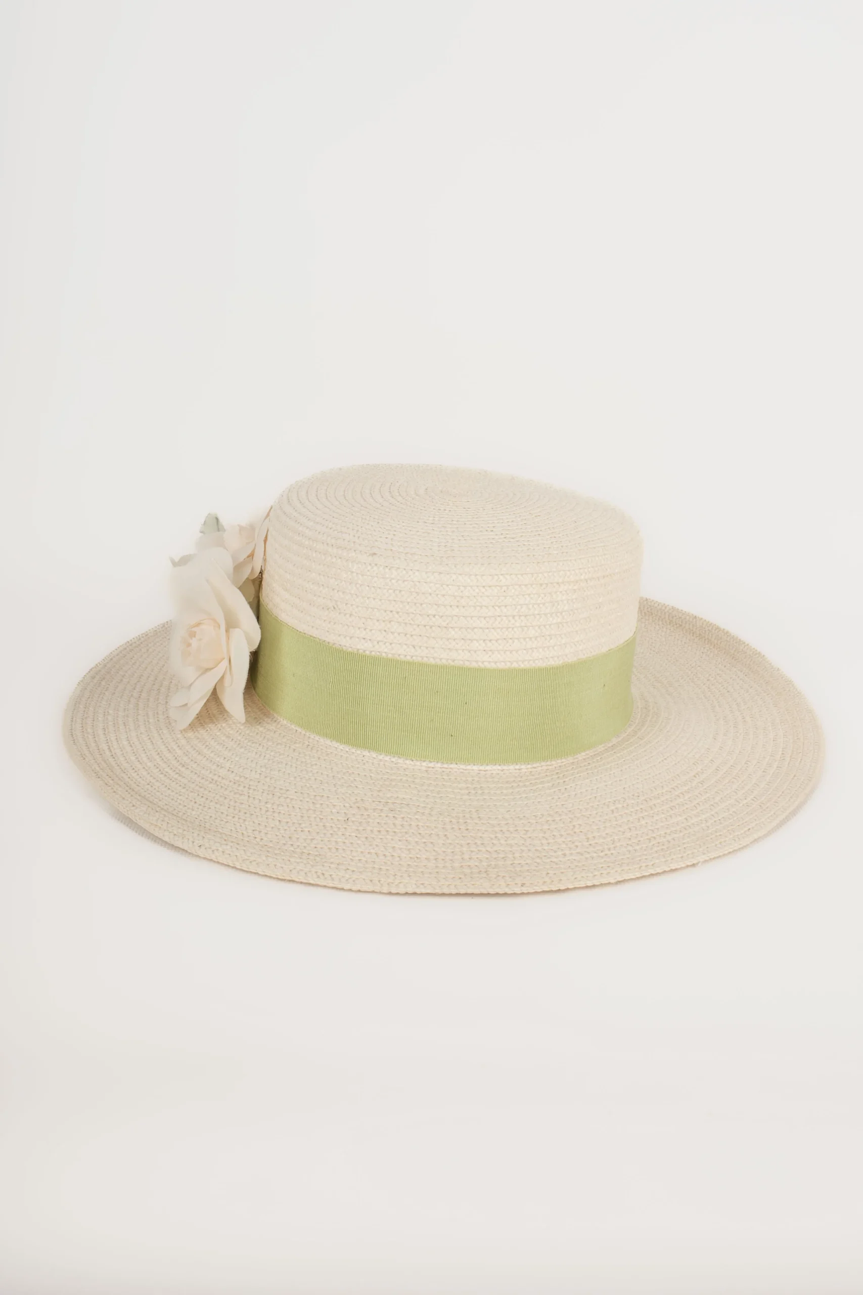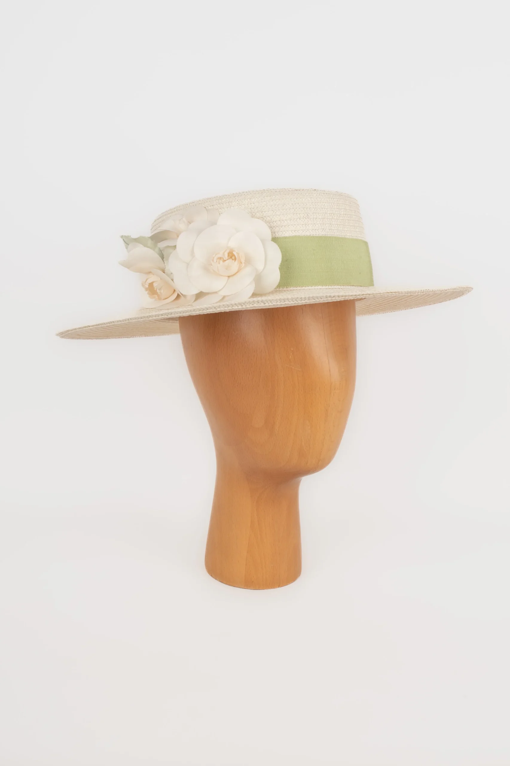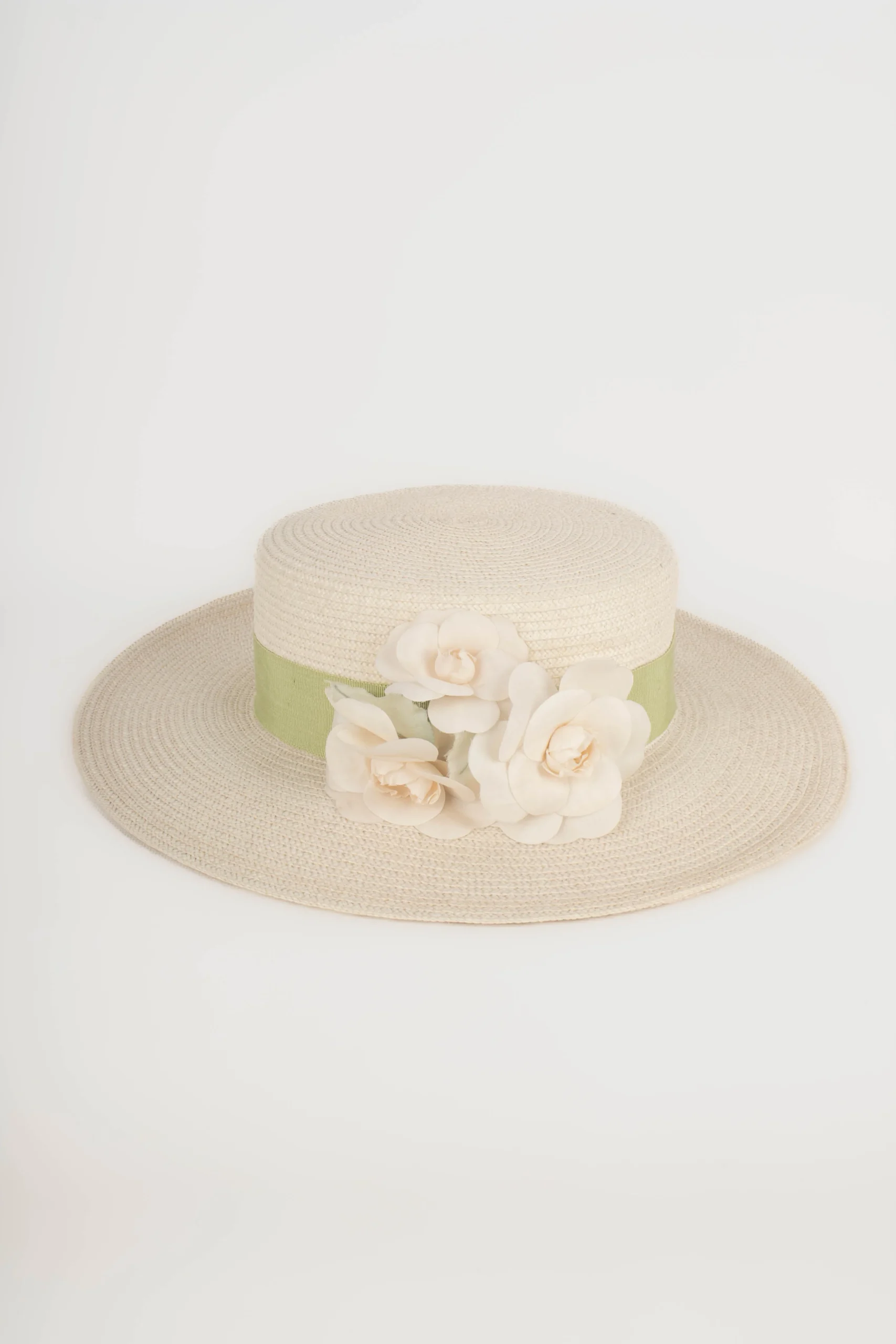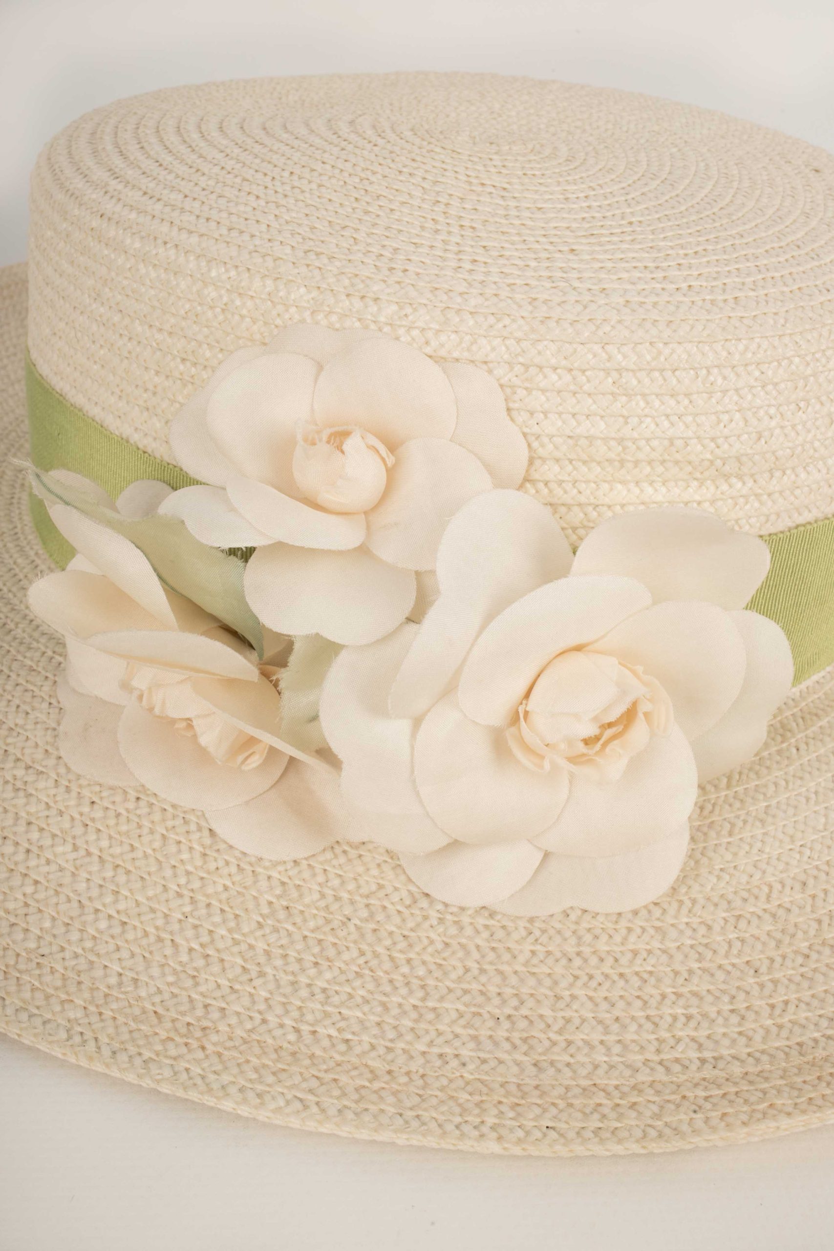 CHANEL -Chapeau canotier blanc décoré d’une bande verte claire et de broches camélias. Chapeau non signé attribué à Chanel.
