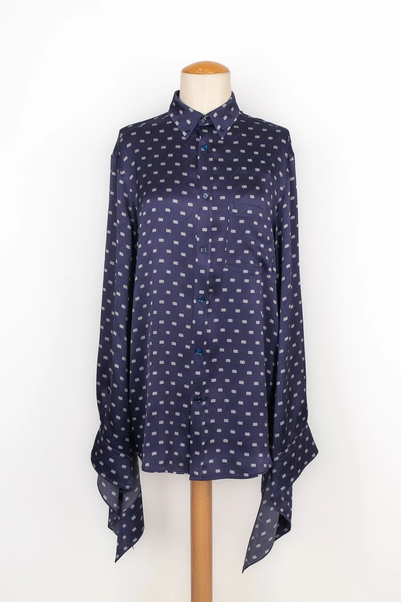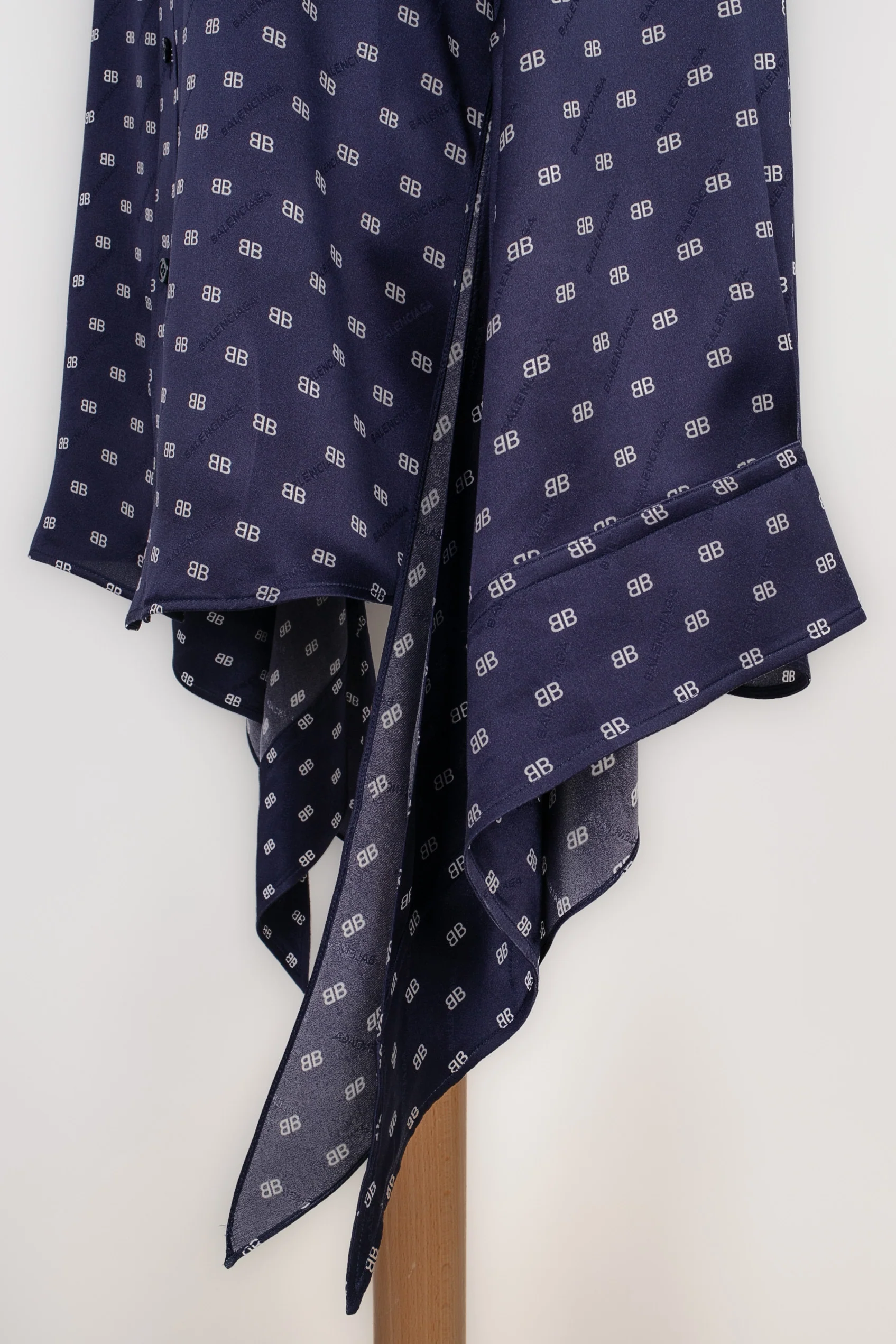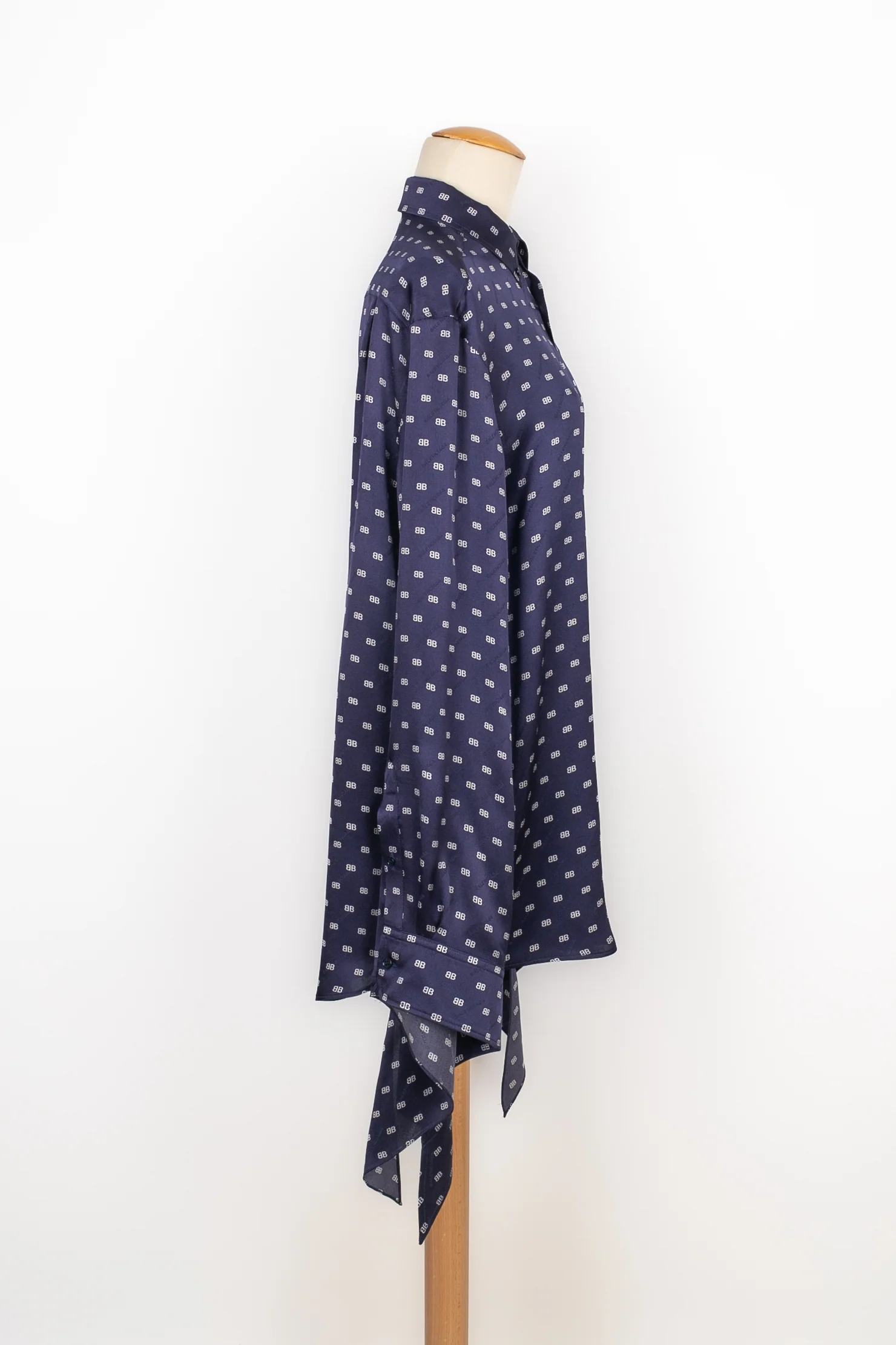 BALENCIAGA -Chemise en soie bleue imprimée de monogrammes blancs. Taille indiquée 38FR. Condition : Très bon état Dimensions : Largeur d’épaules : 48 cm – Poitrine : 55 cm – Longueur des manches : 70 cm – Longueur : 75 cm