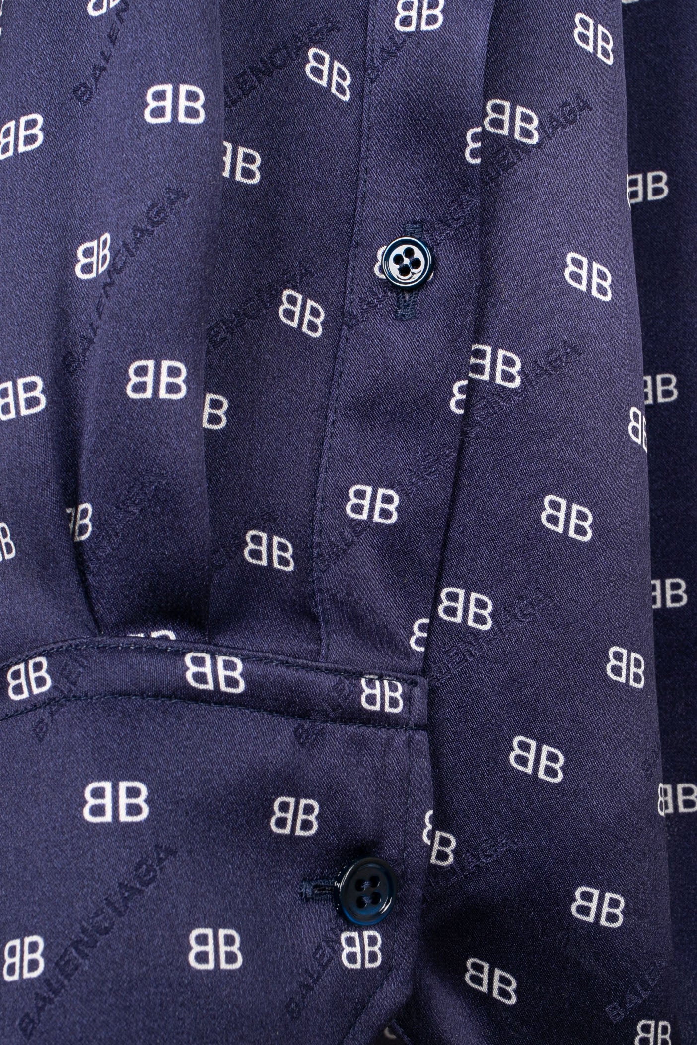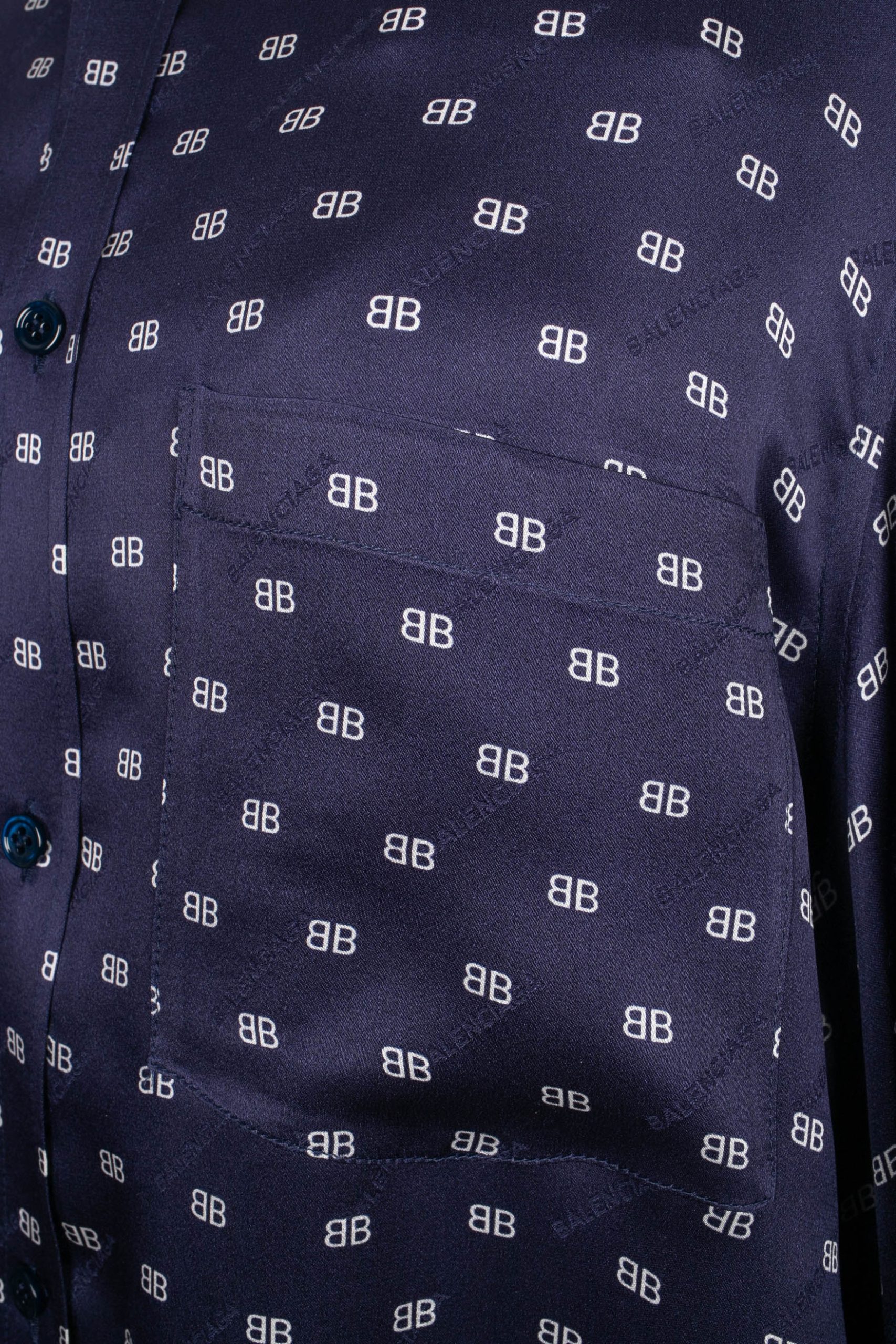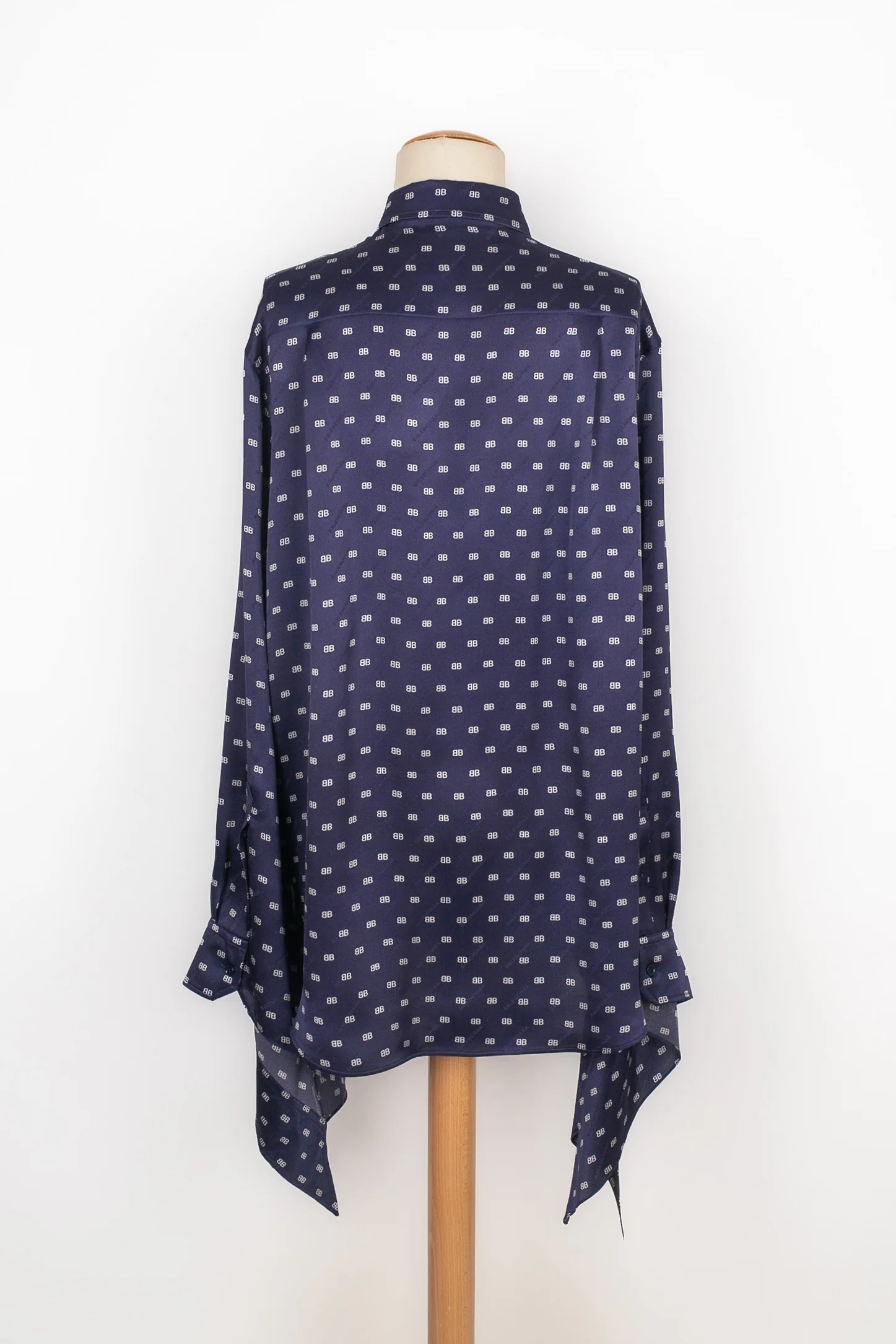 BALENCIAGA -Chemise en soie bleue imprimée de monogrammes blancs. Taille indiquée 38FR. Condition : Très bon état Dimensions : Largeur d’épaules : 48 cm – Poitrine : 55 cm – Longueur des manches : 70 cm – Longueur : 75 cm