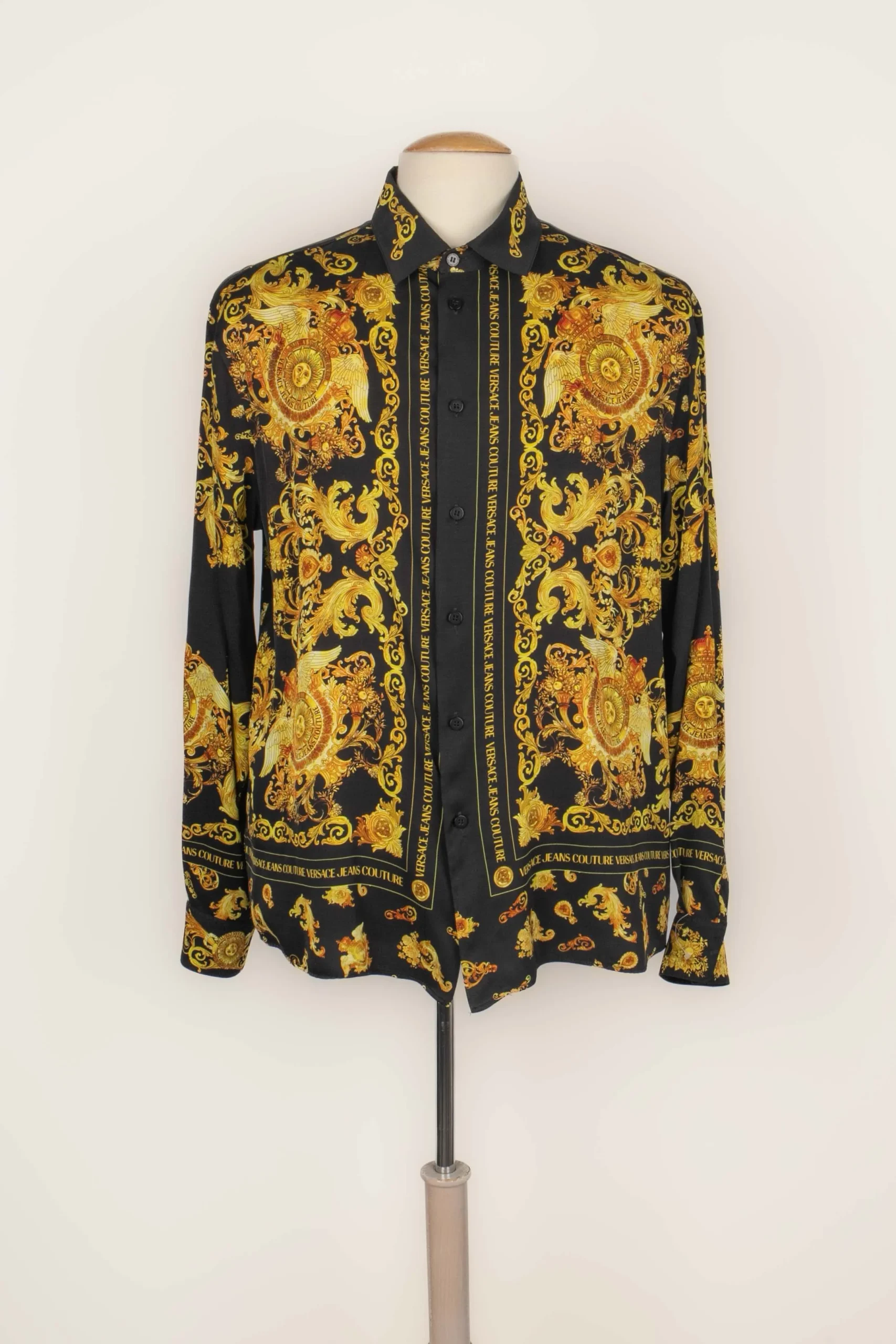 VERSACE -Chemise imprimée de motifs de la maison dans les tons de doré sur fond noir. Taille indiquée 50FR.