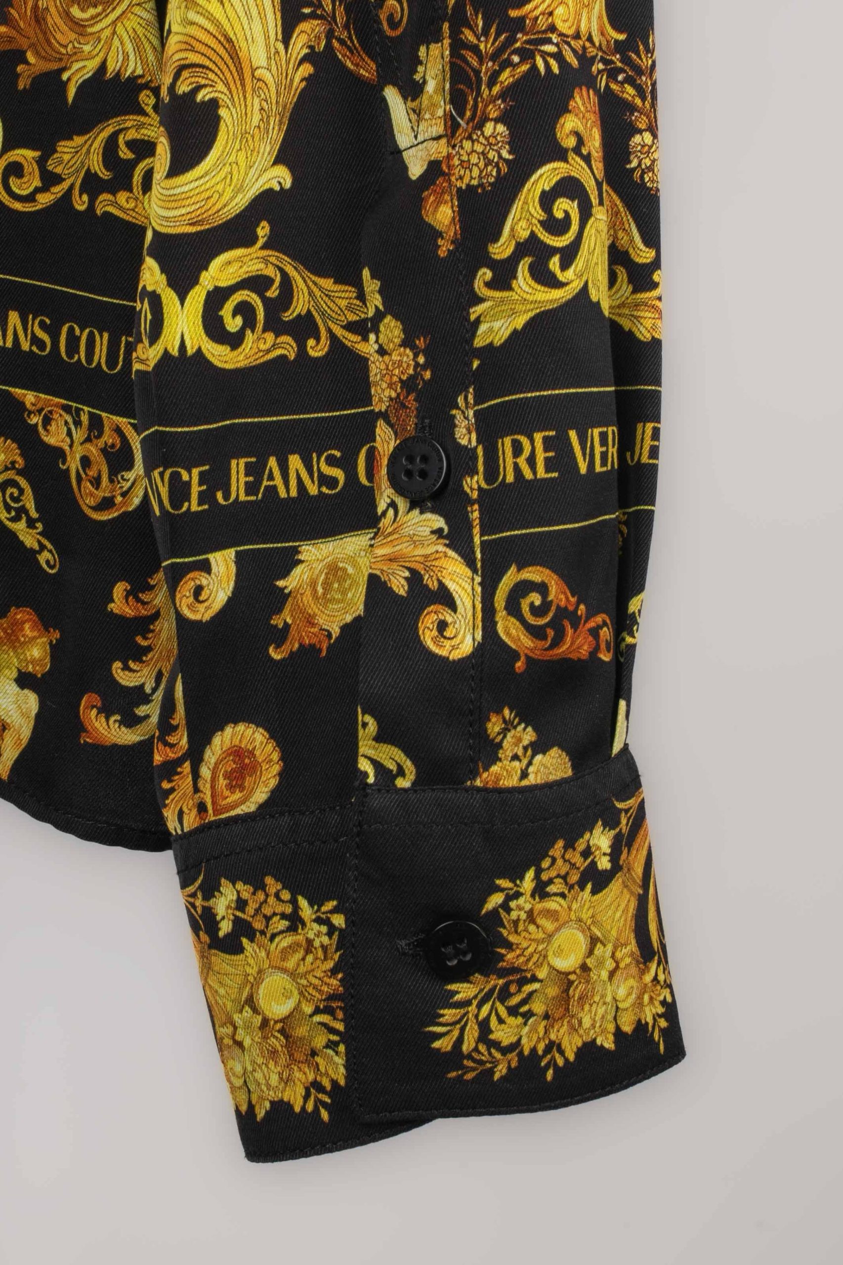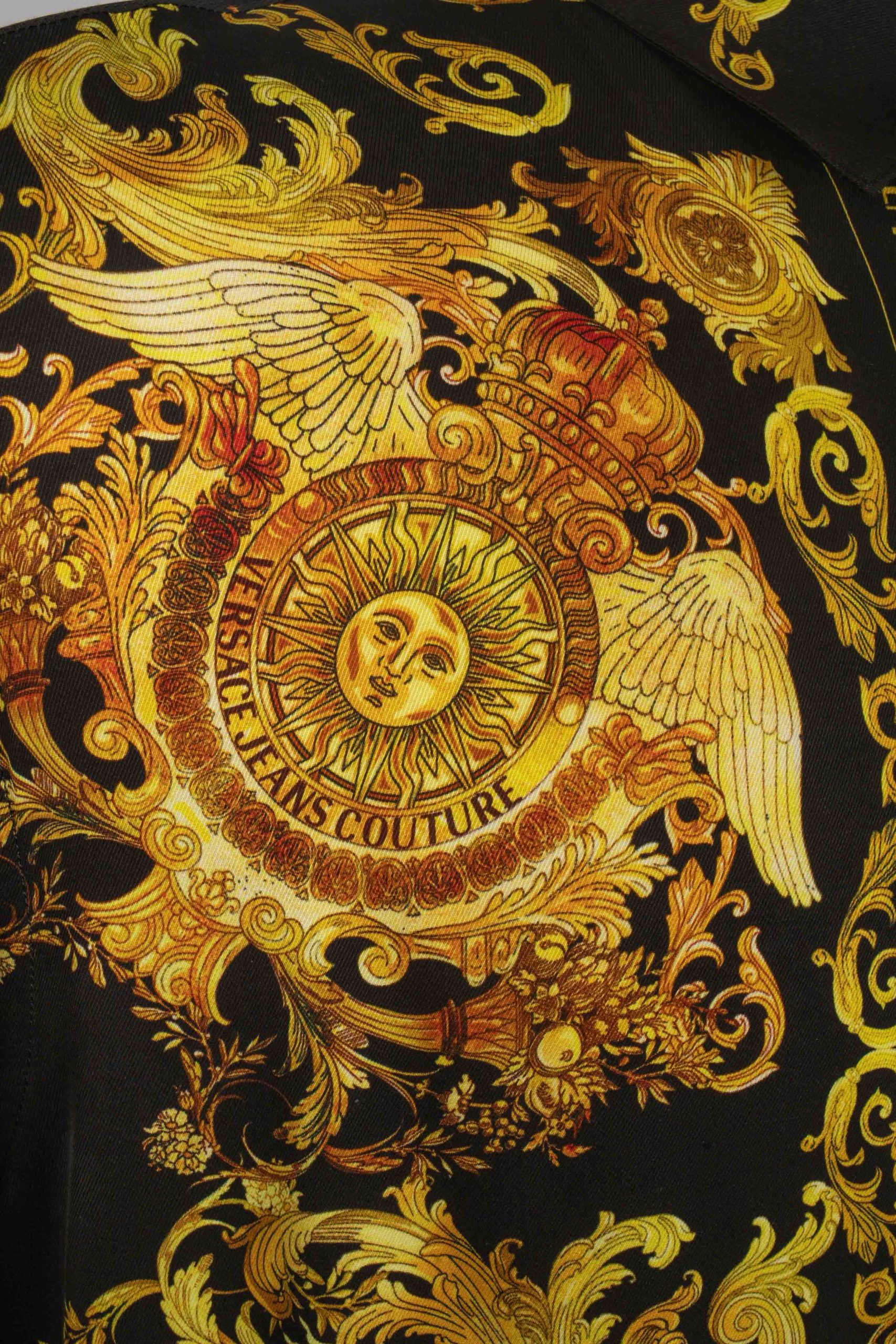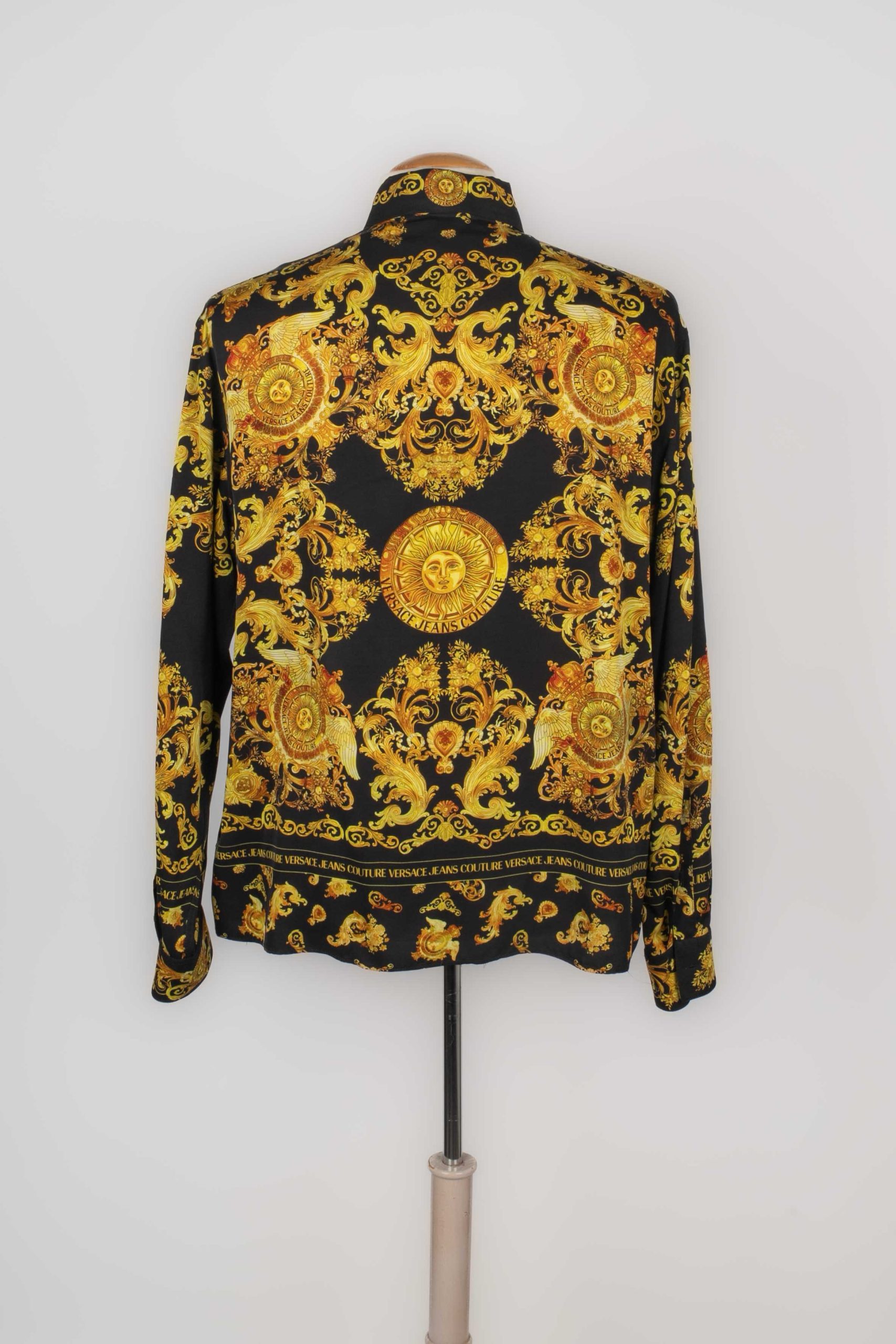 VERSACE -Chemise imprimée de motifs de la maison dans les tons de doré sur fond noir. Taille indiquée 50FR. Condition : Très bon état Dimensions : Largeur d’épaules : 49 cm – Poitrine : 58 cm – Longueur des manches : 62 cm – Longueur : 67 cm