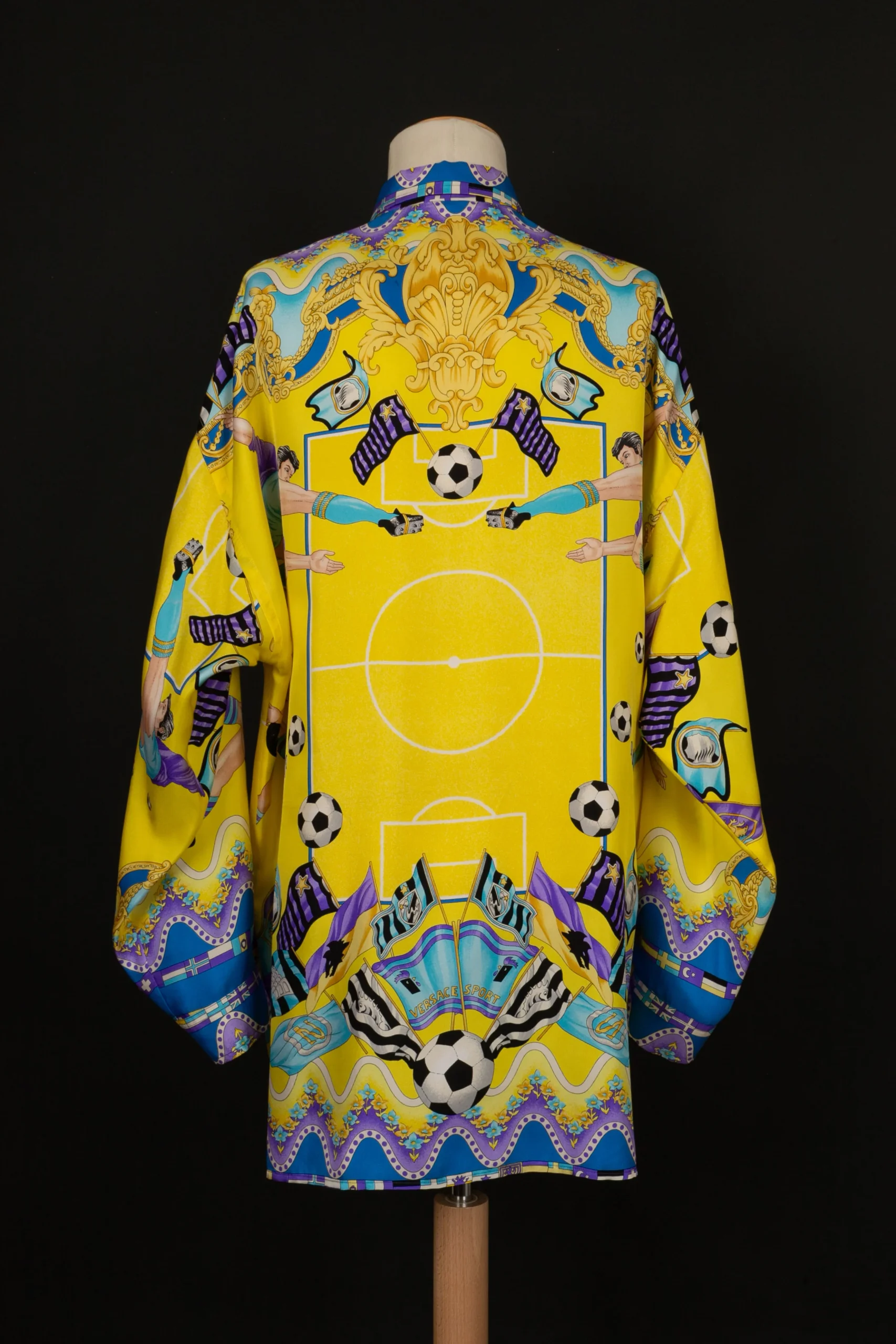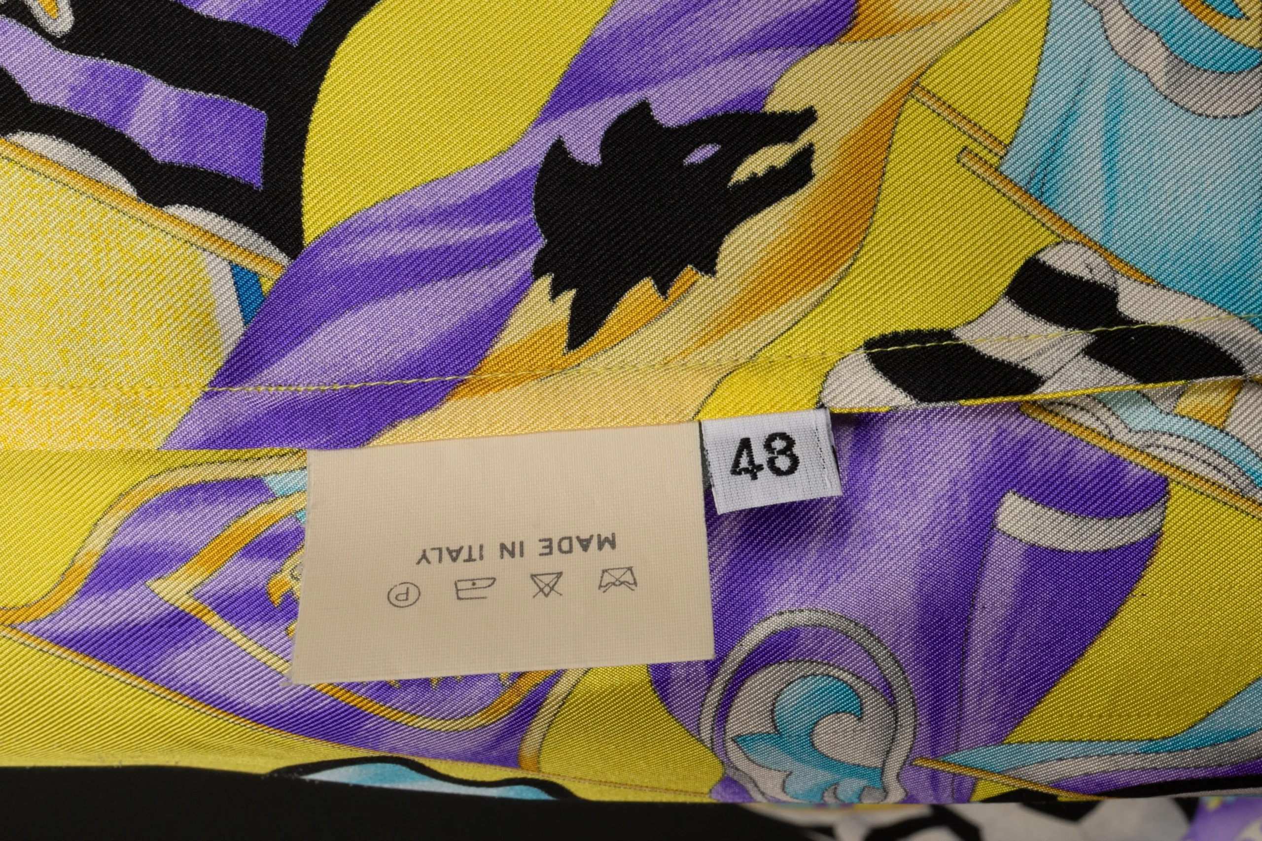VERSACE -(Made in Italy) Chemise en soie imprimée bleu et violet sur fond jaune. Taille indiquée 48FR. Condition : Très bon état Dimensions : Largeur d’paules : 60 cm – Poitrine : 64 cm – Longueur des manches : 54 cm – Longueur : 80 cm