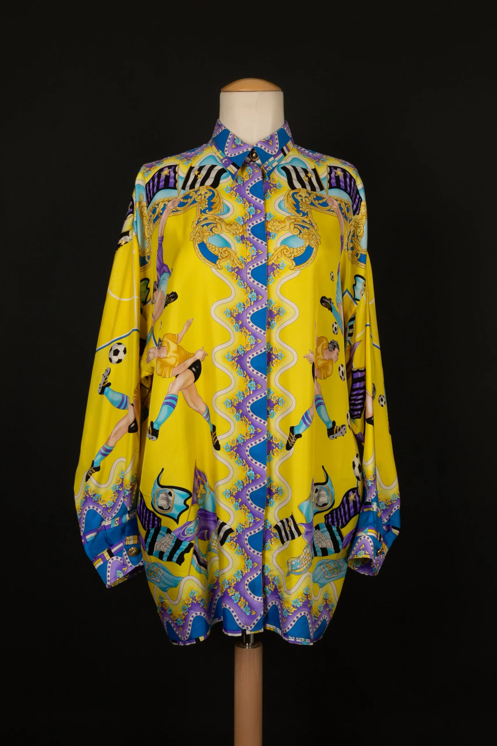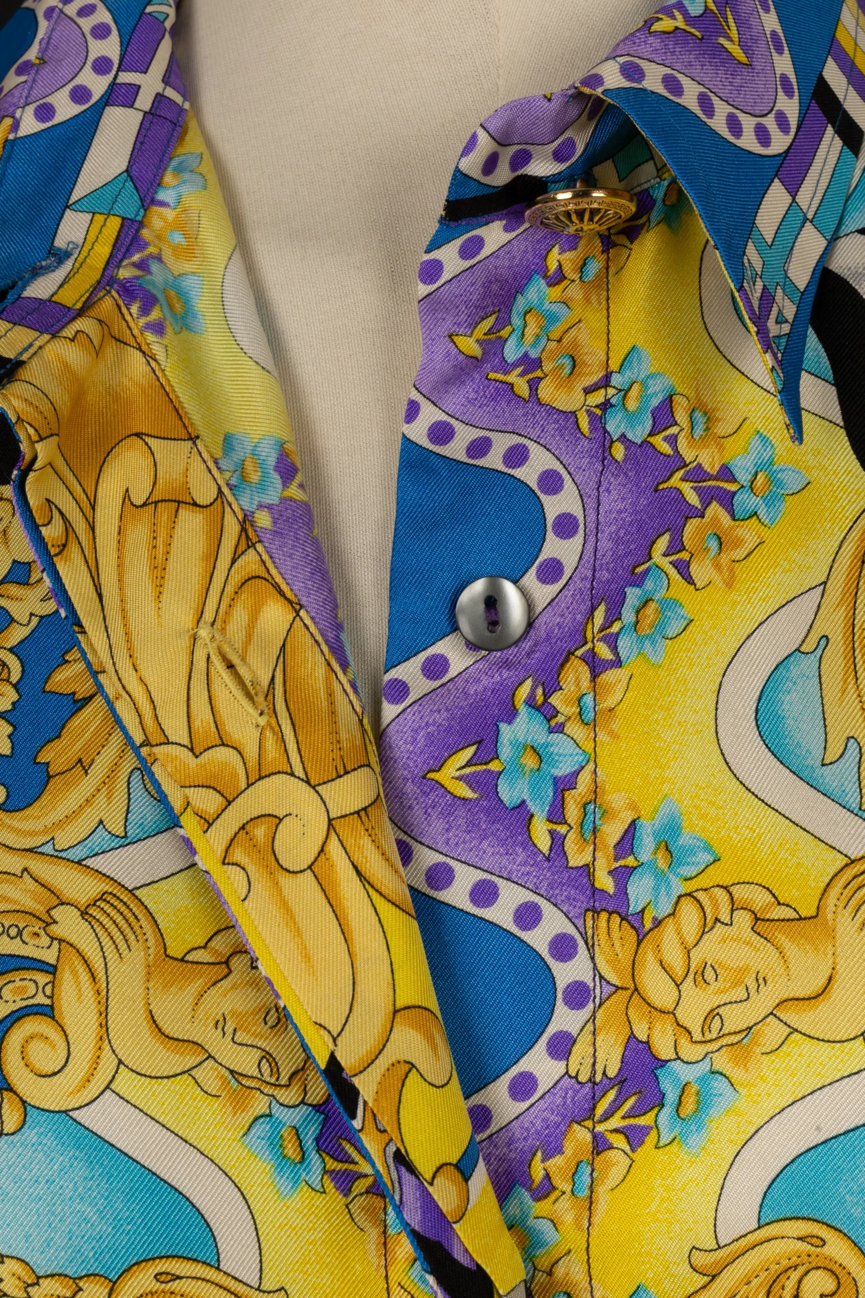 VERSACE -(Made in Italy) Chemise en soie imprimée bleu et violet sur fond jaune. Taille indiquée 48FR.