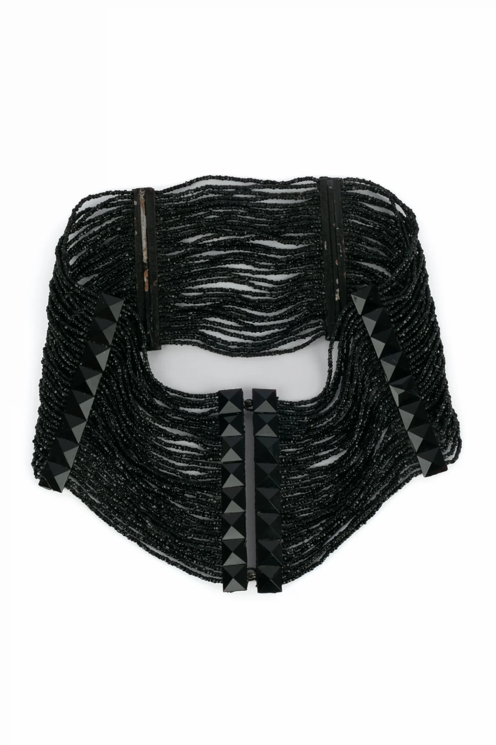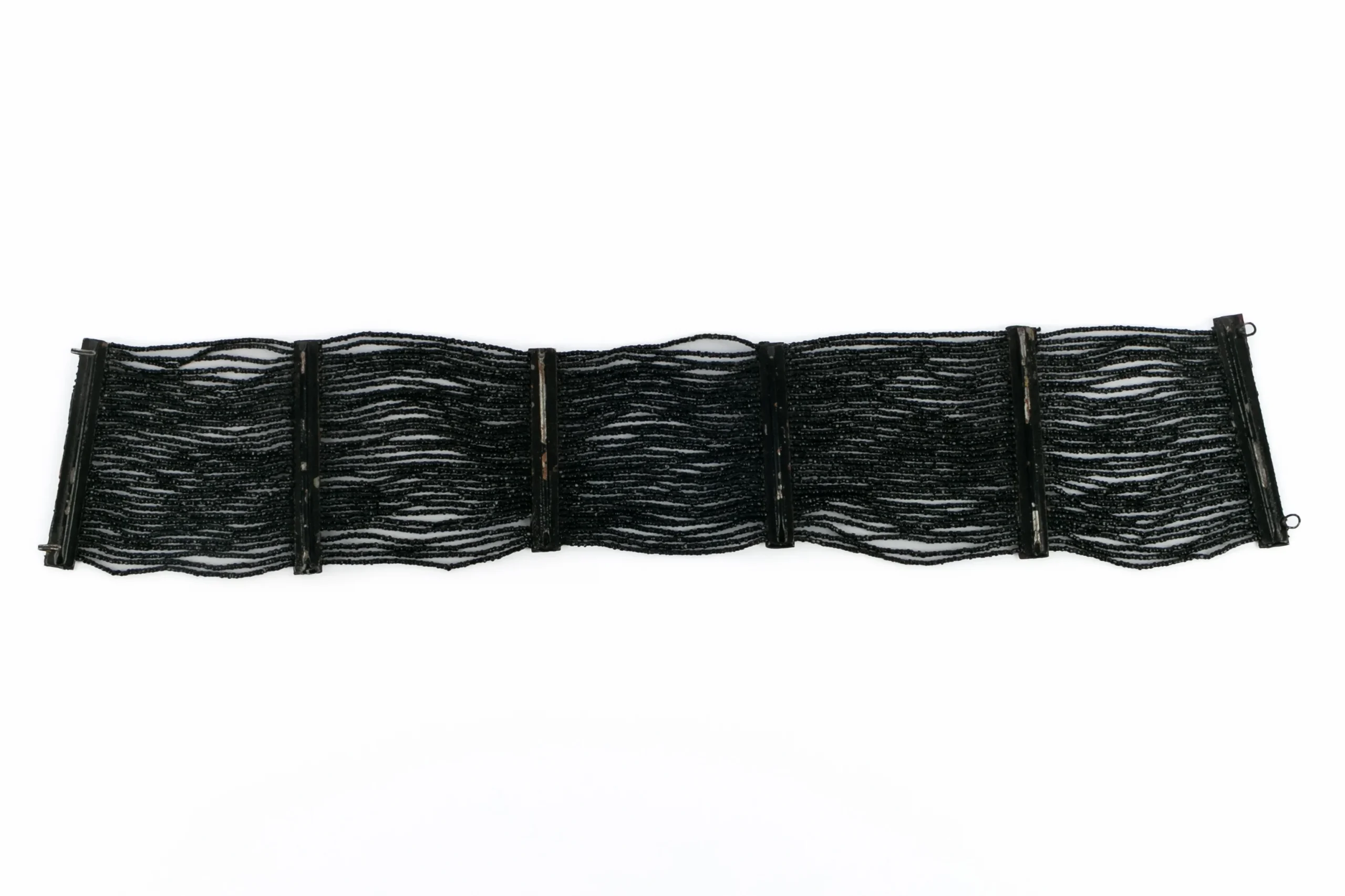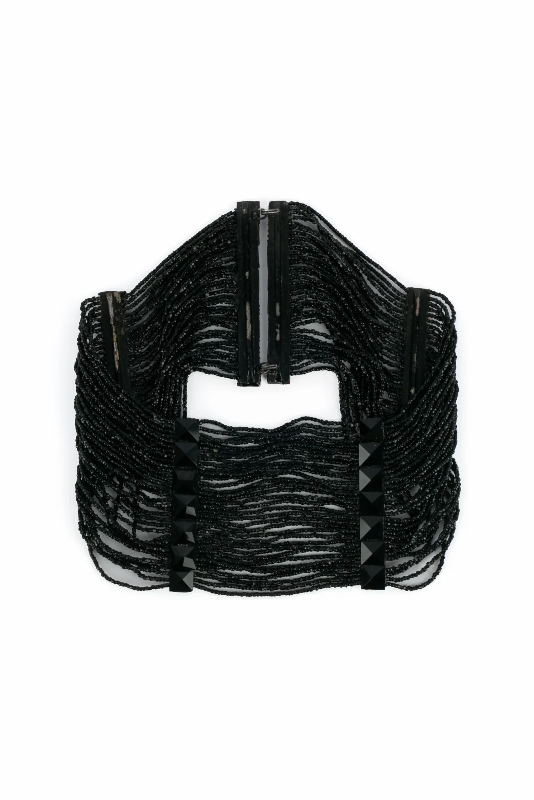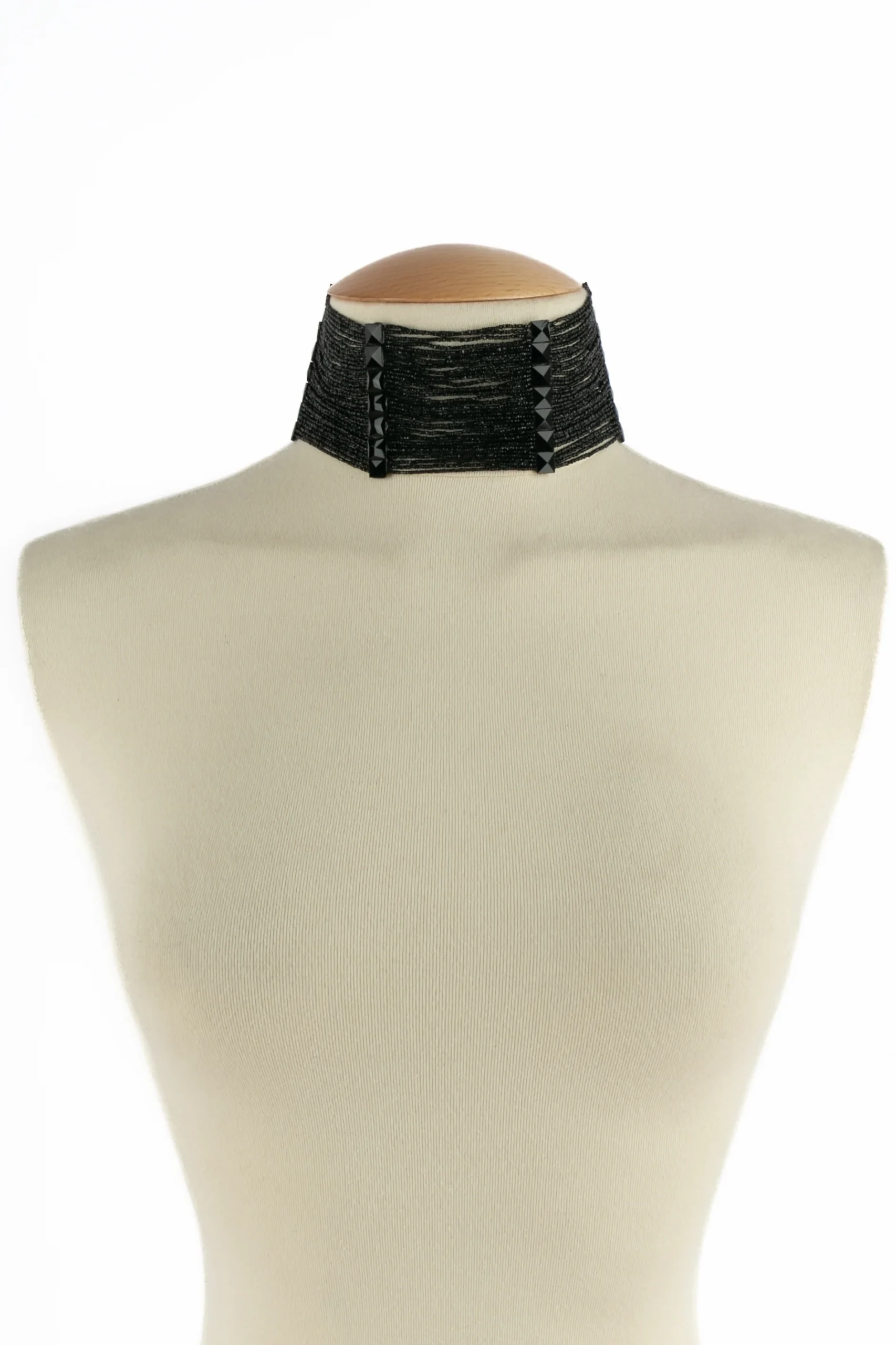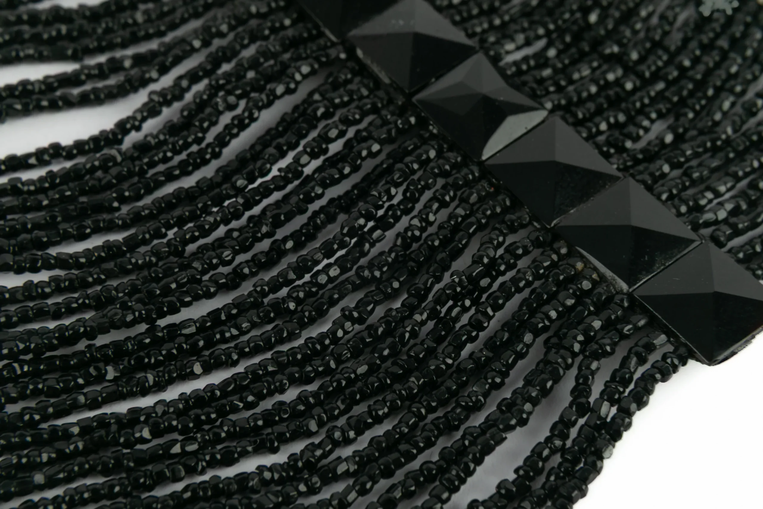 ANONYME – Collier ras de cou en métal argenté foncé, multi-rangs de perles noires entrecoupées de strass noirs. Epoque Napoléon III.
