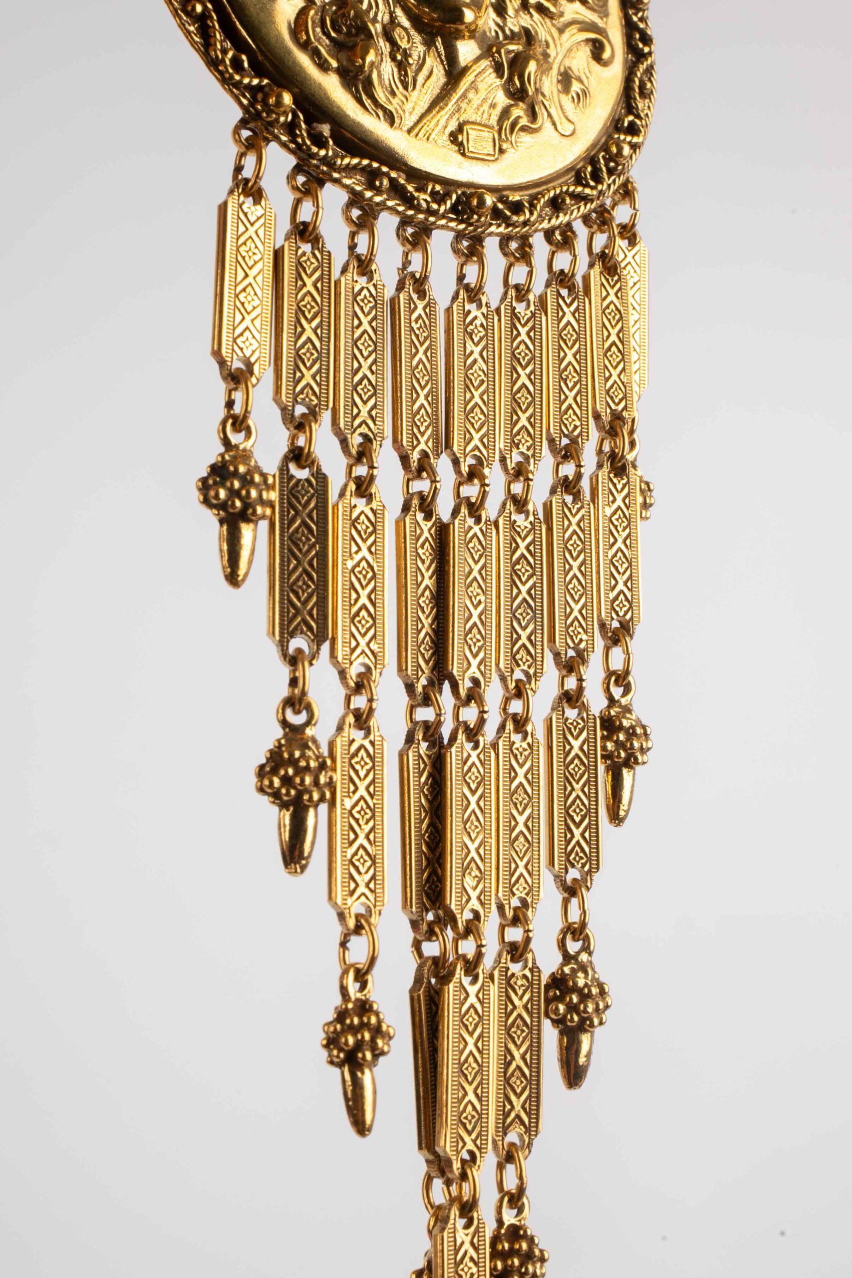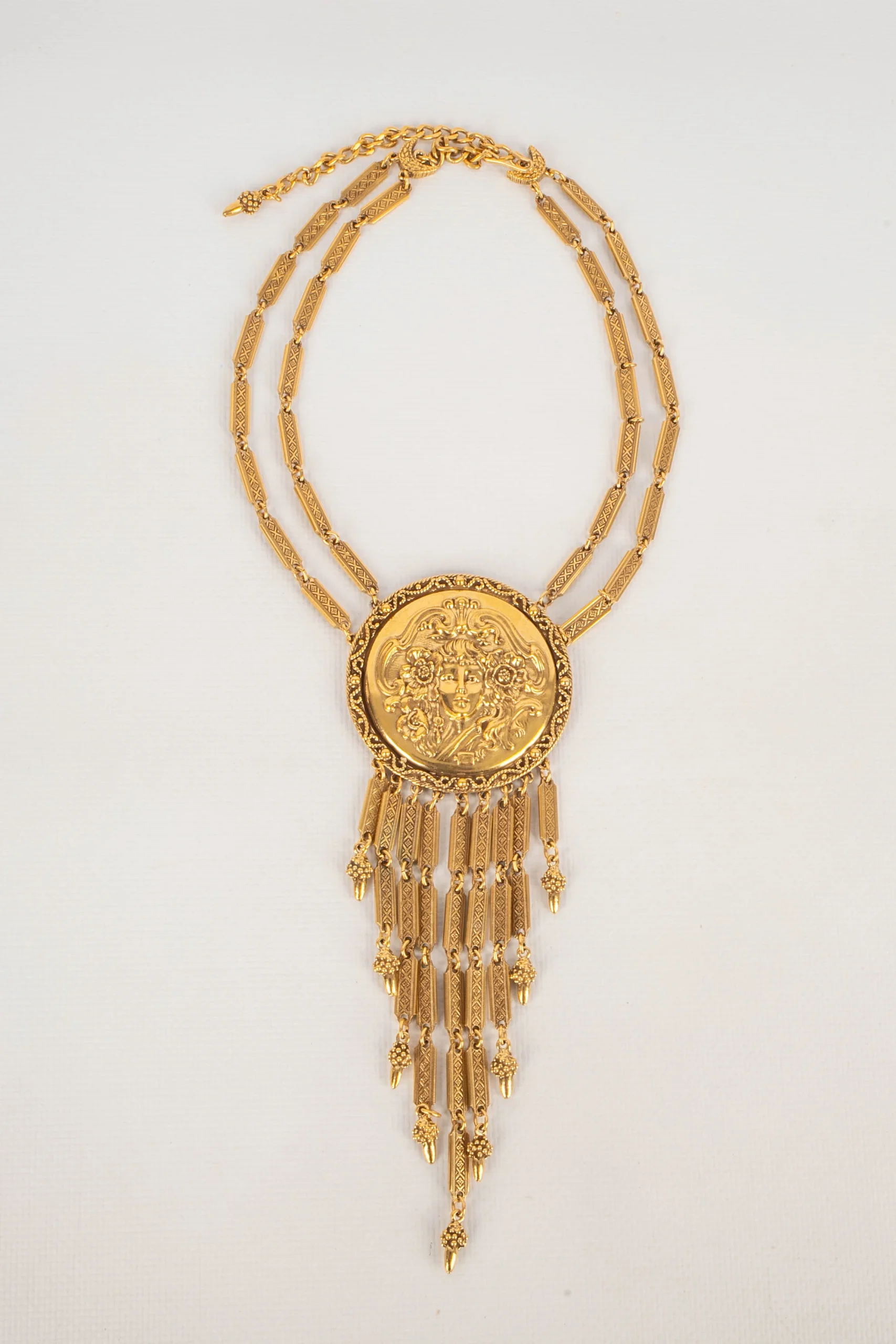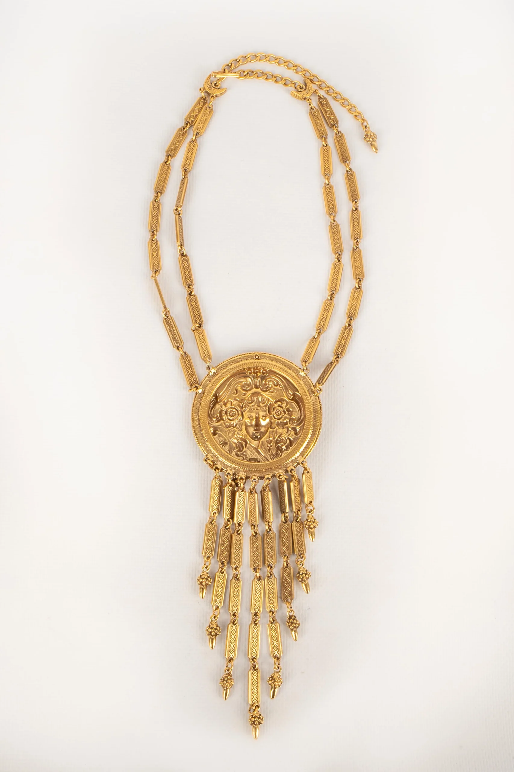 ANONYME – Collier travaillé en métal doré et son pendentif style Art nouveau. Non signé. Condition : Très bon état Dimensions : Longueur : de 40 cm à 50 cm