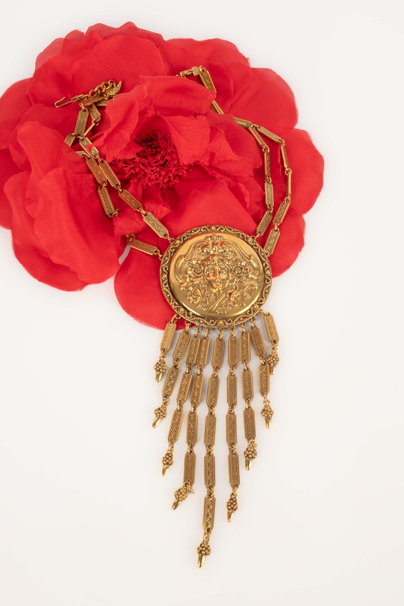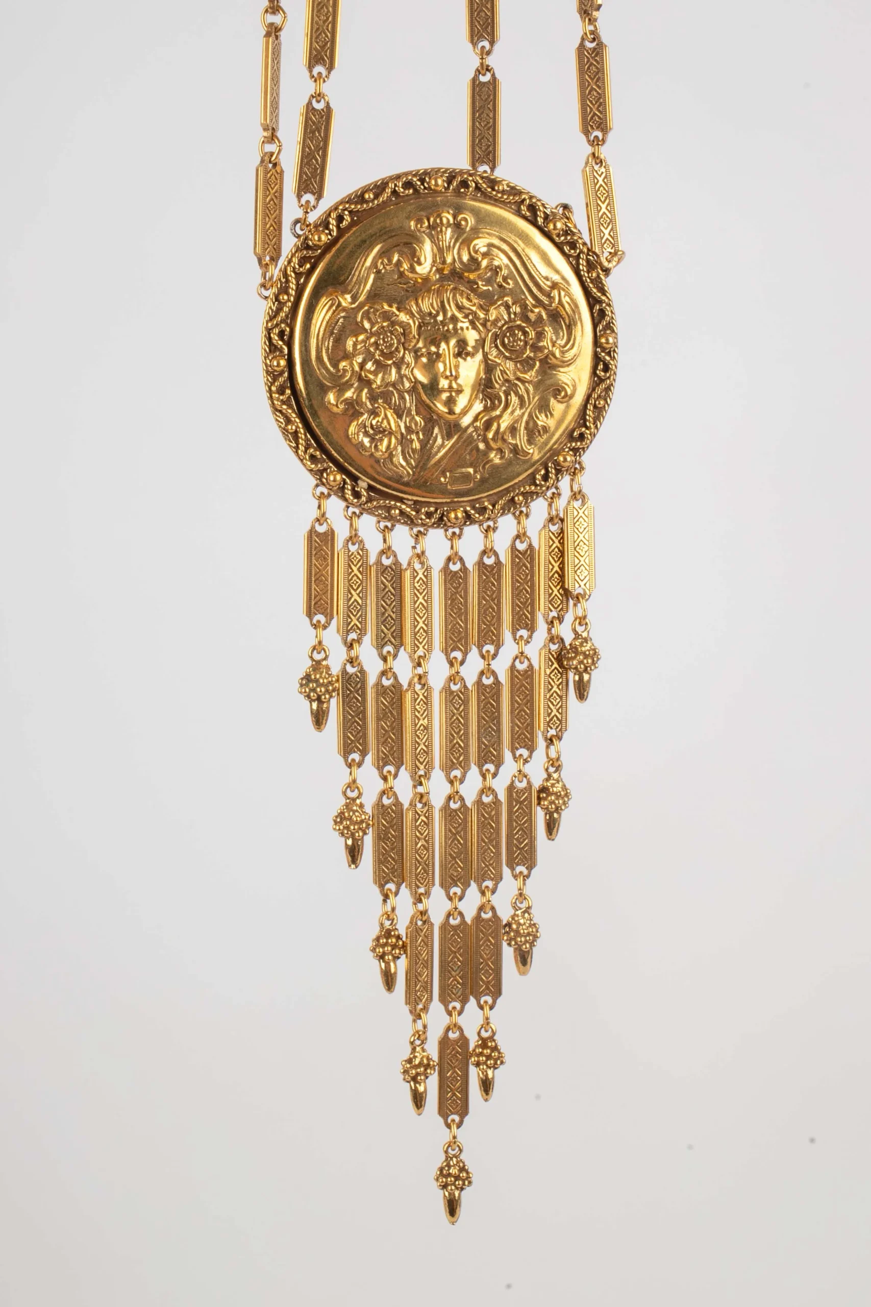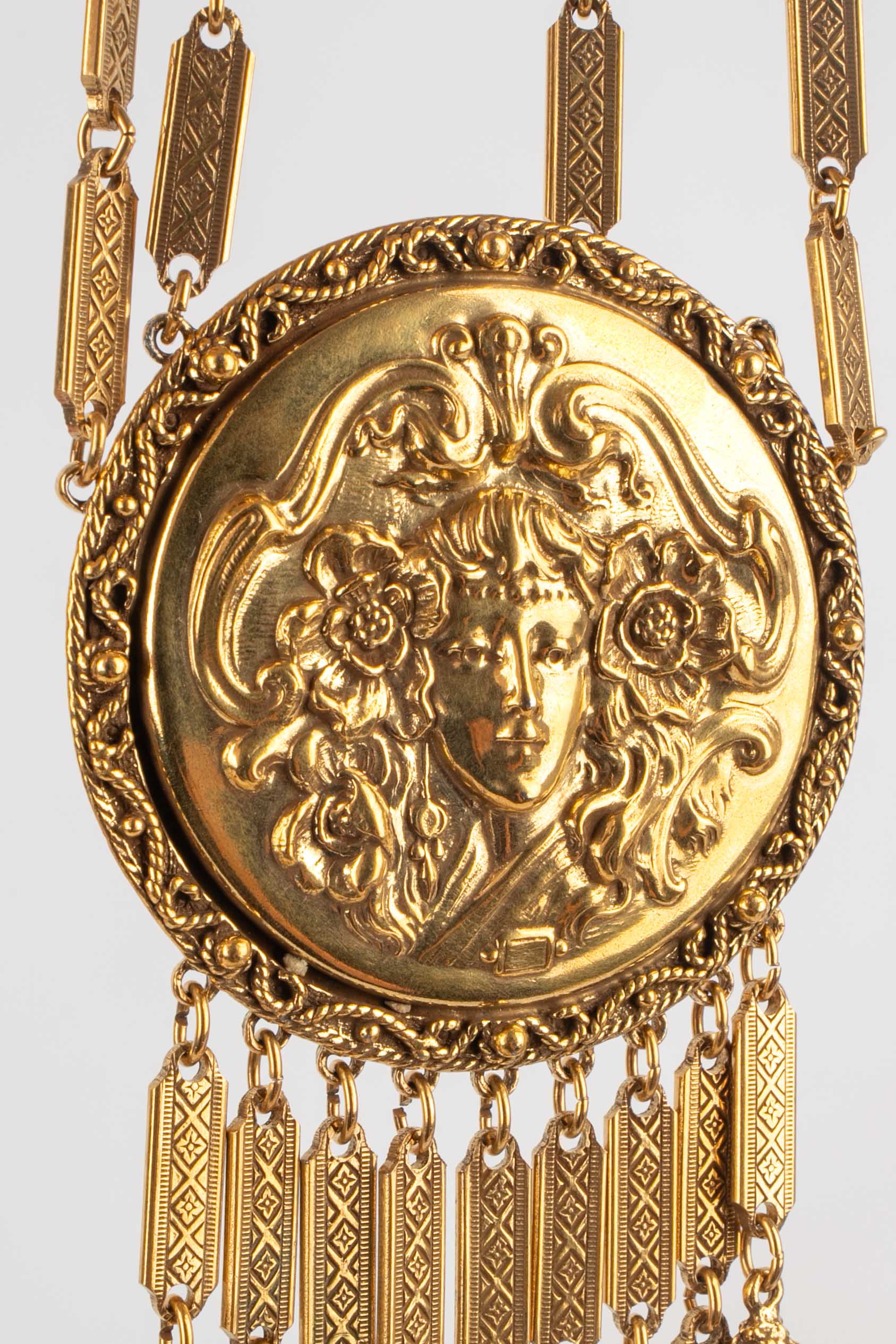 ANONYME – Collier travaillé en métal doré et son pendentif style Art nouveau. Non signé.