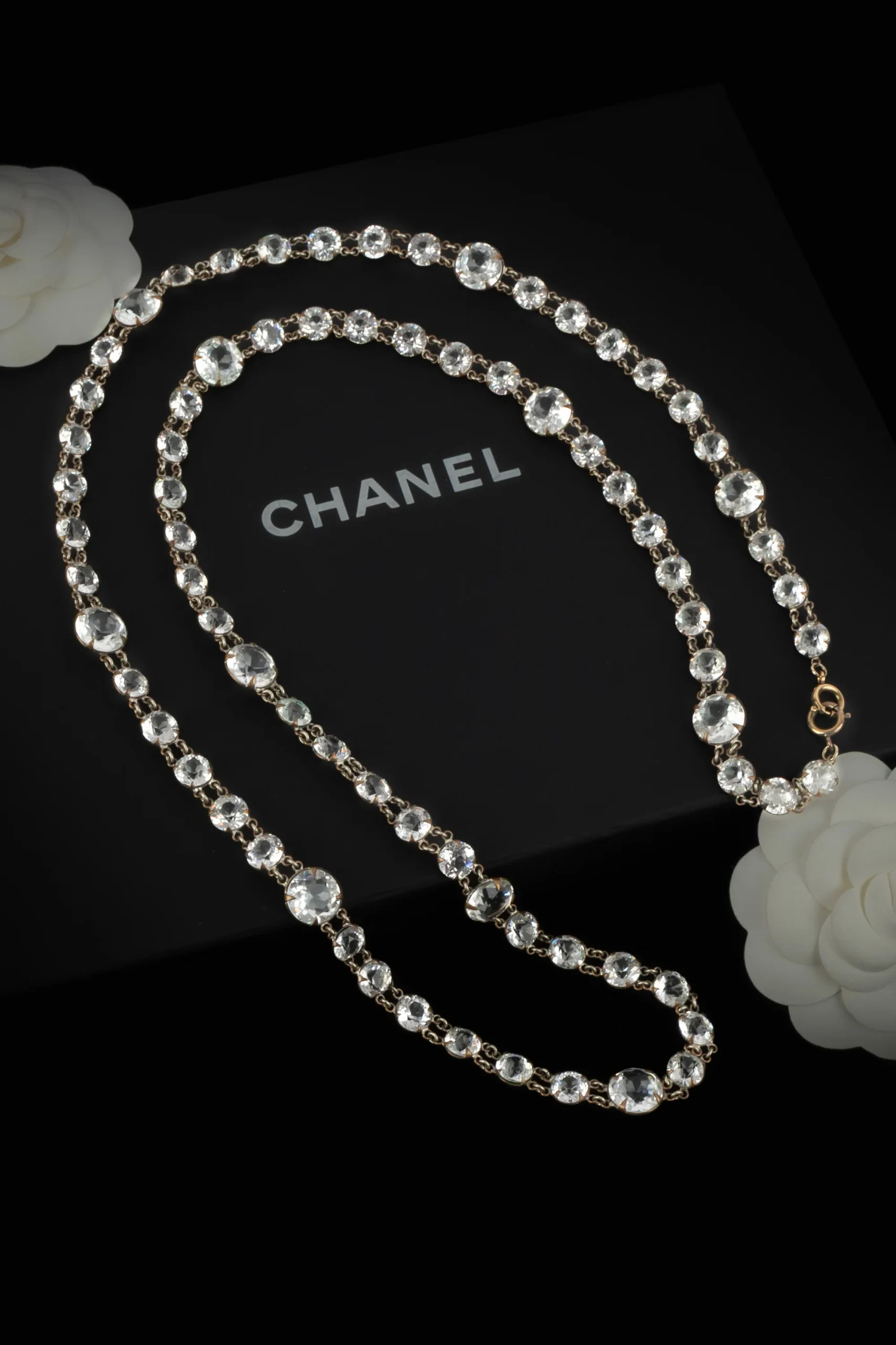 CHANEL – Collier sautoir en métal argenté et strass. Collection circa 1930 – époque Gabrielle Chanel. Bijou vendu avec un certificat. Condition : Très bon état Dimensions : Longueur : 107 cm