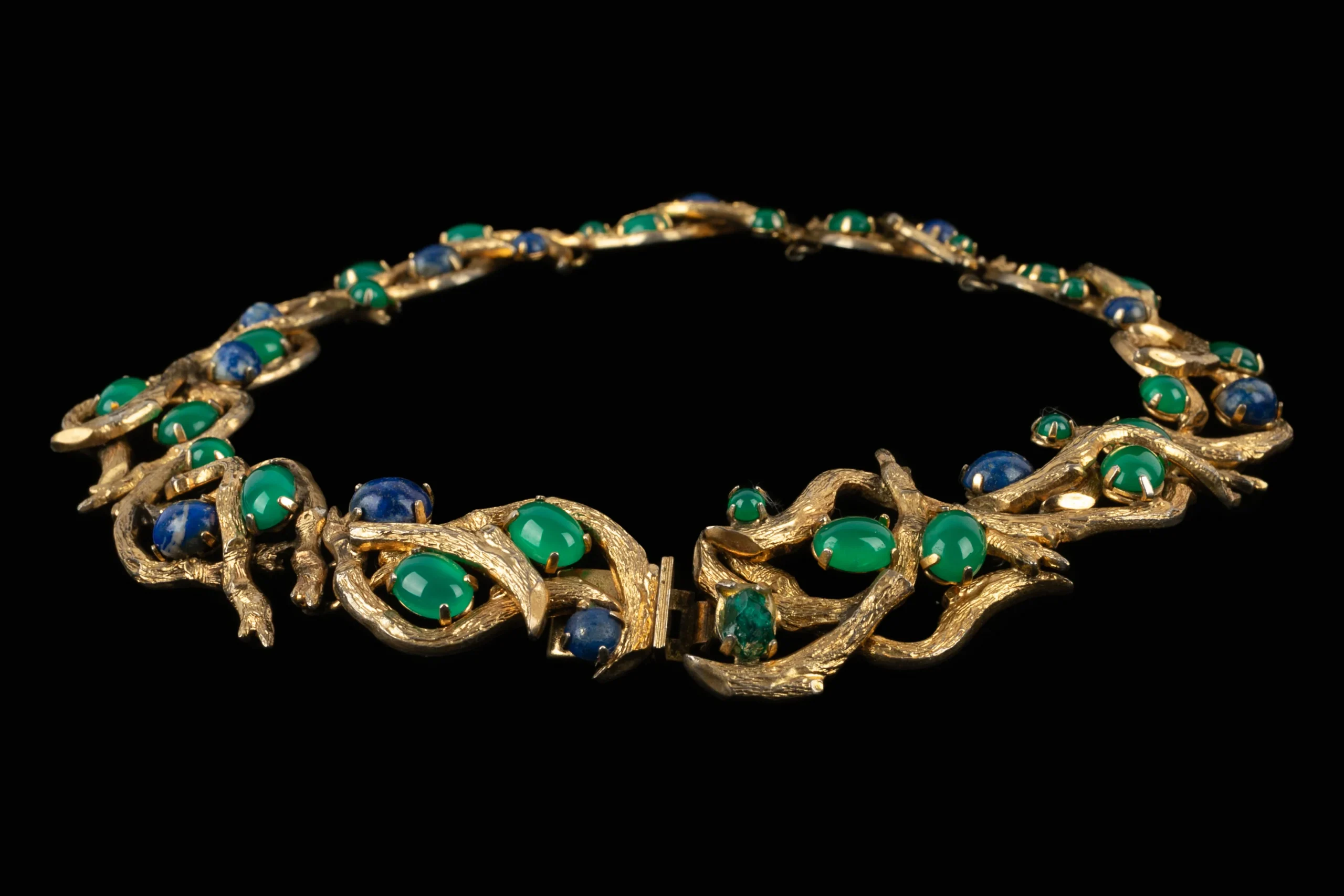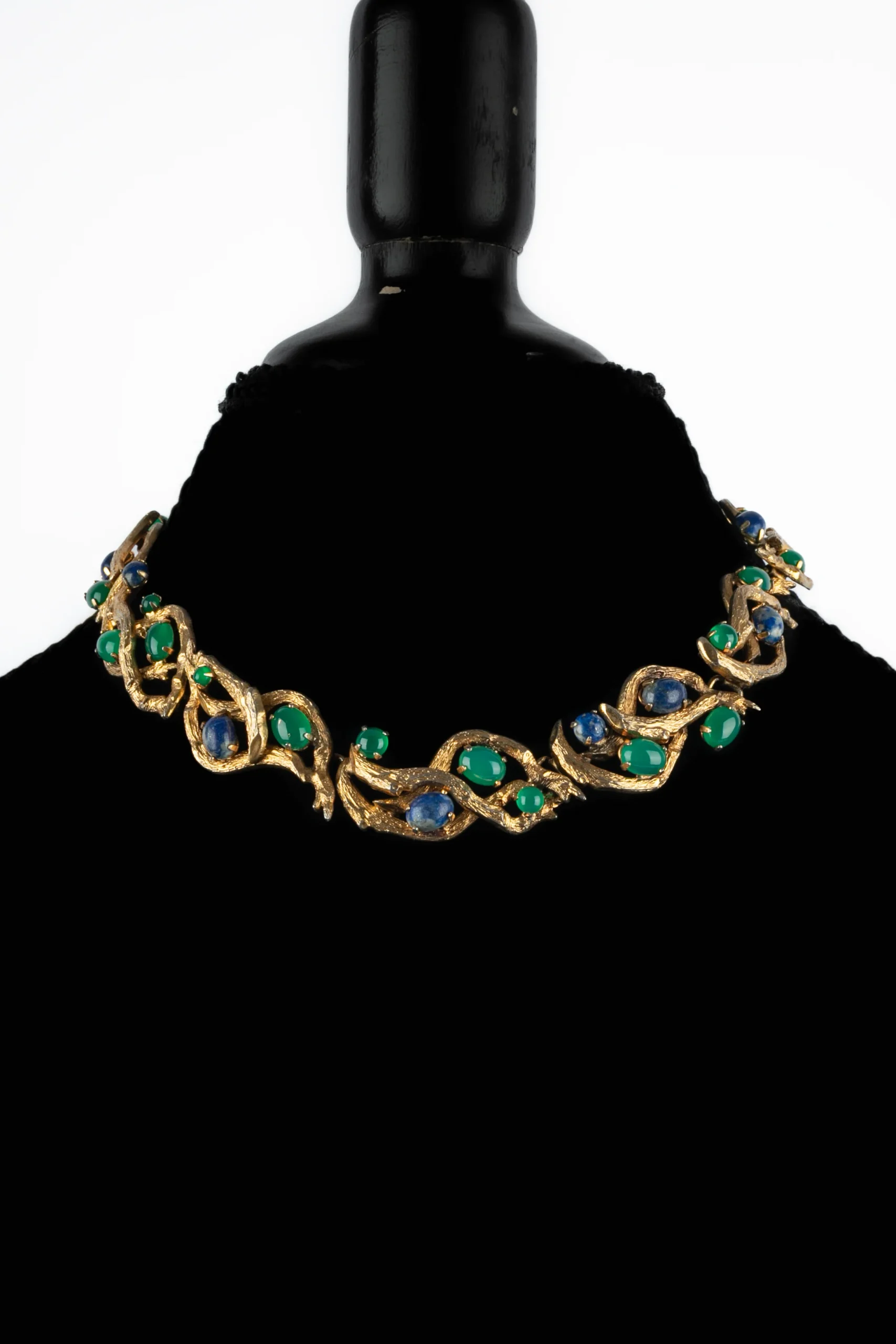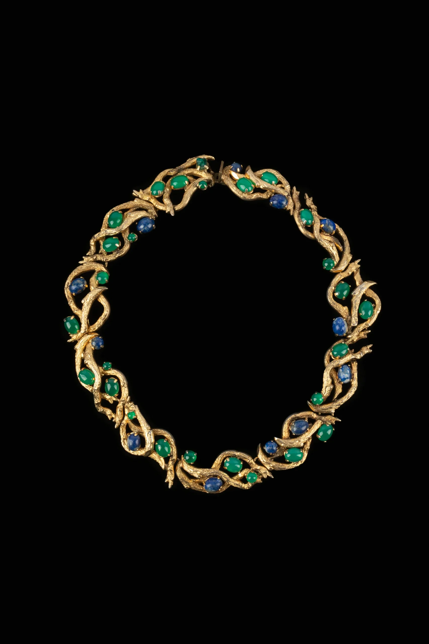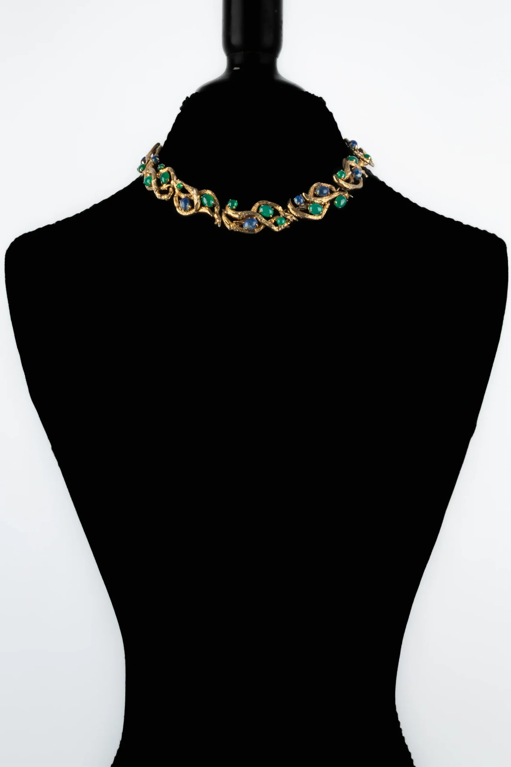 DIOR – (Made in Germany) Collier en métal doré retenant des cabochons en pâte de verre. Collection 1966.