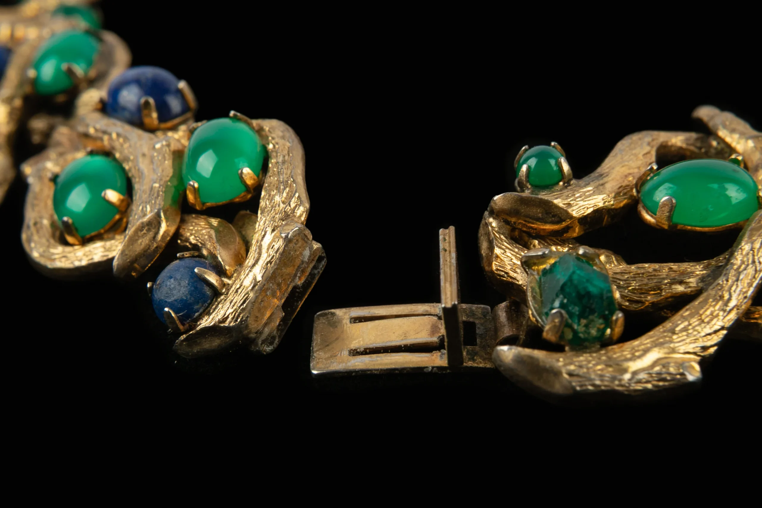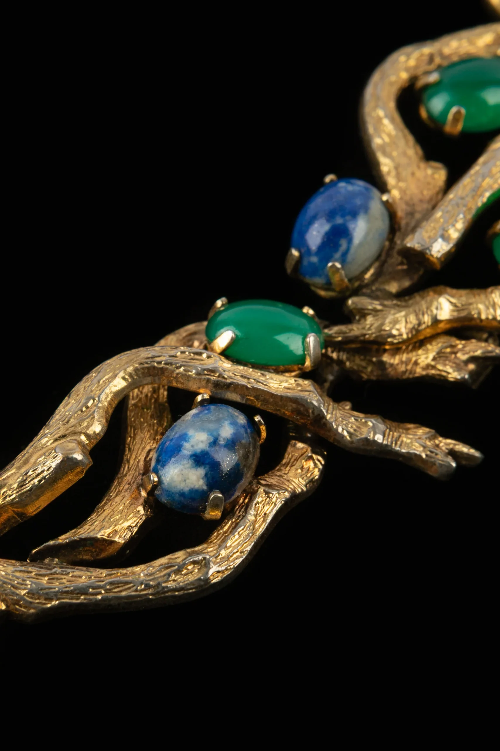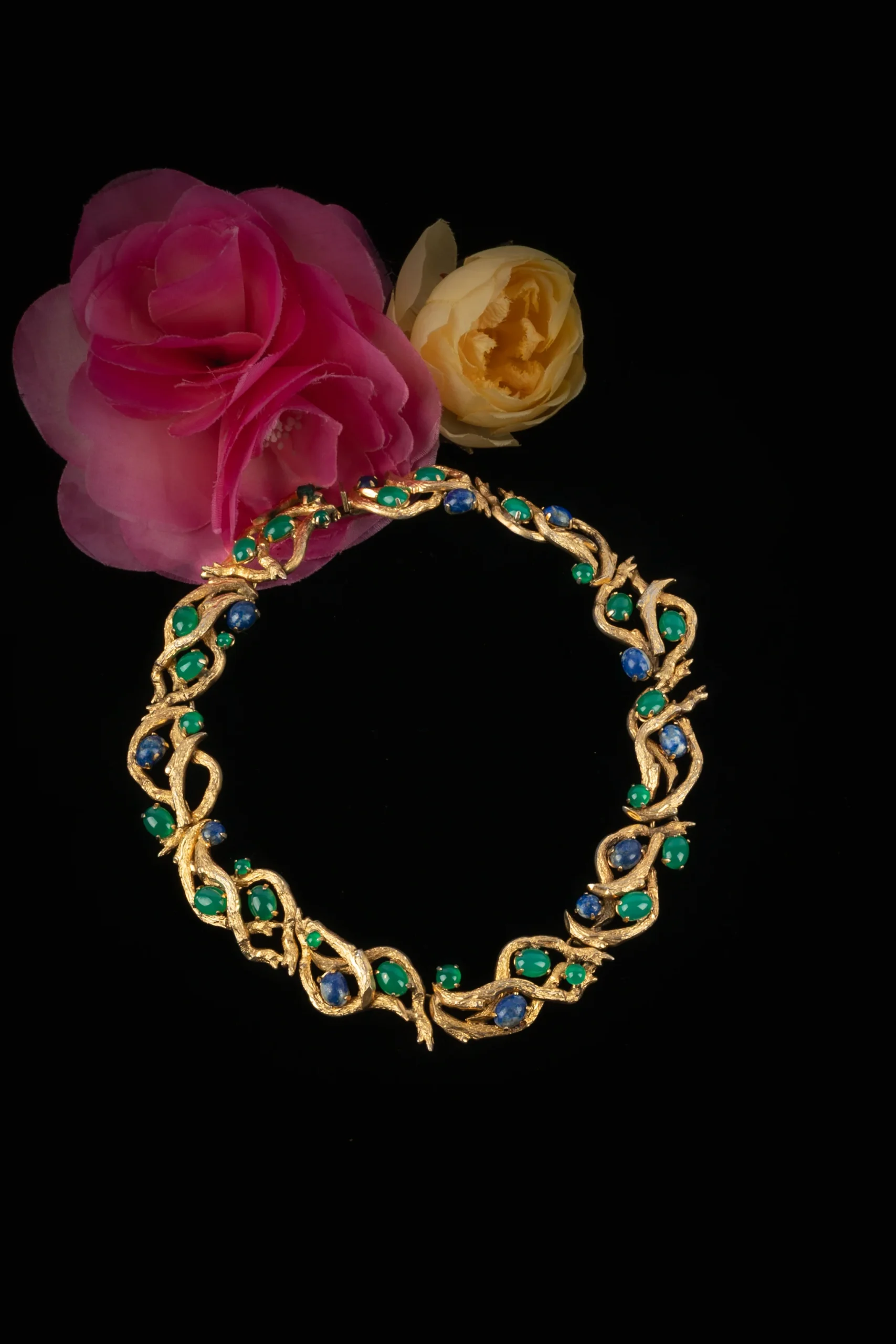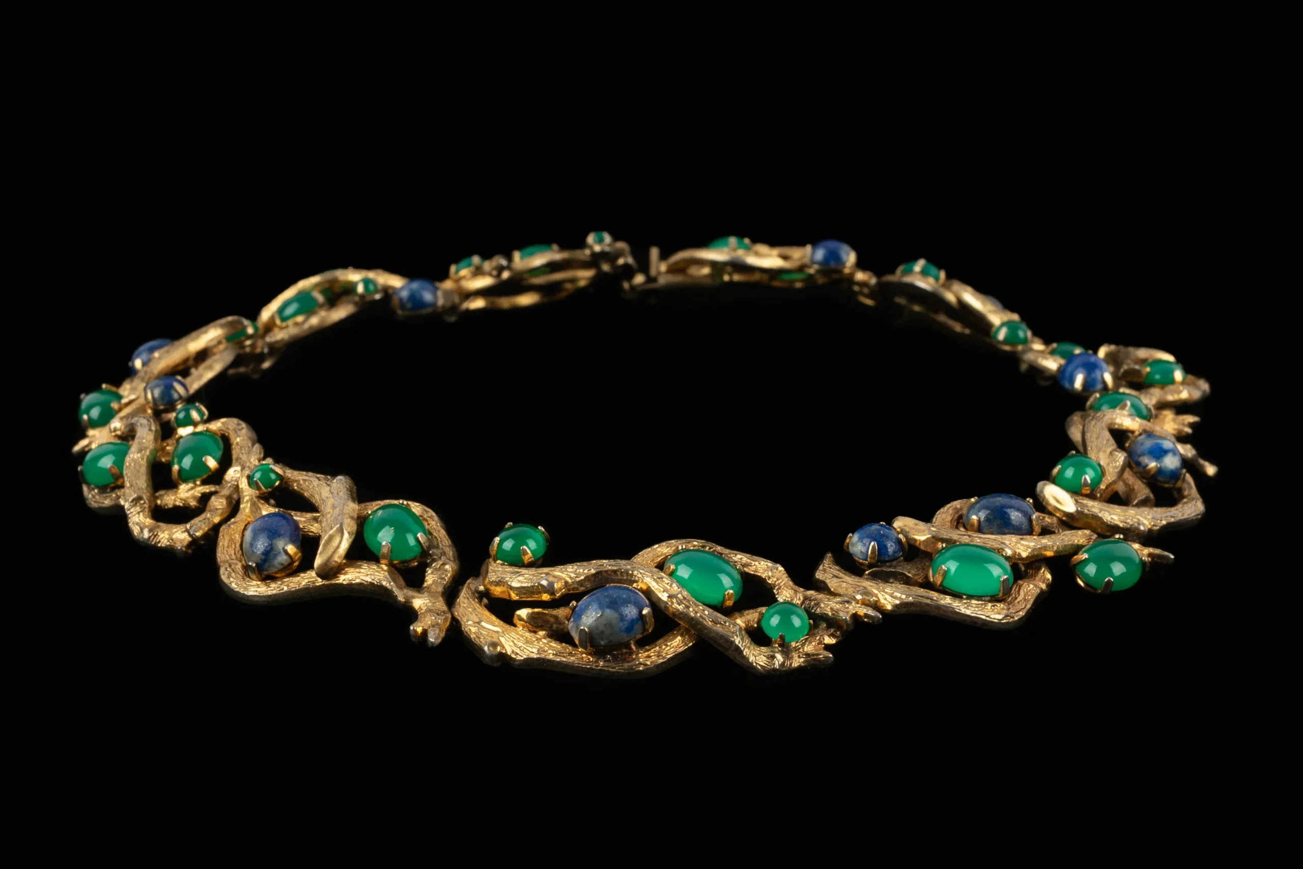 DIOR – (Made in Germany) Collier en métal doré retenant des cabochons en pâte de verre. Collection 1966.