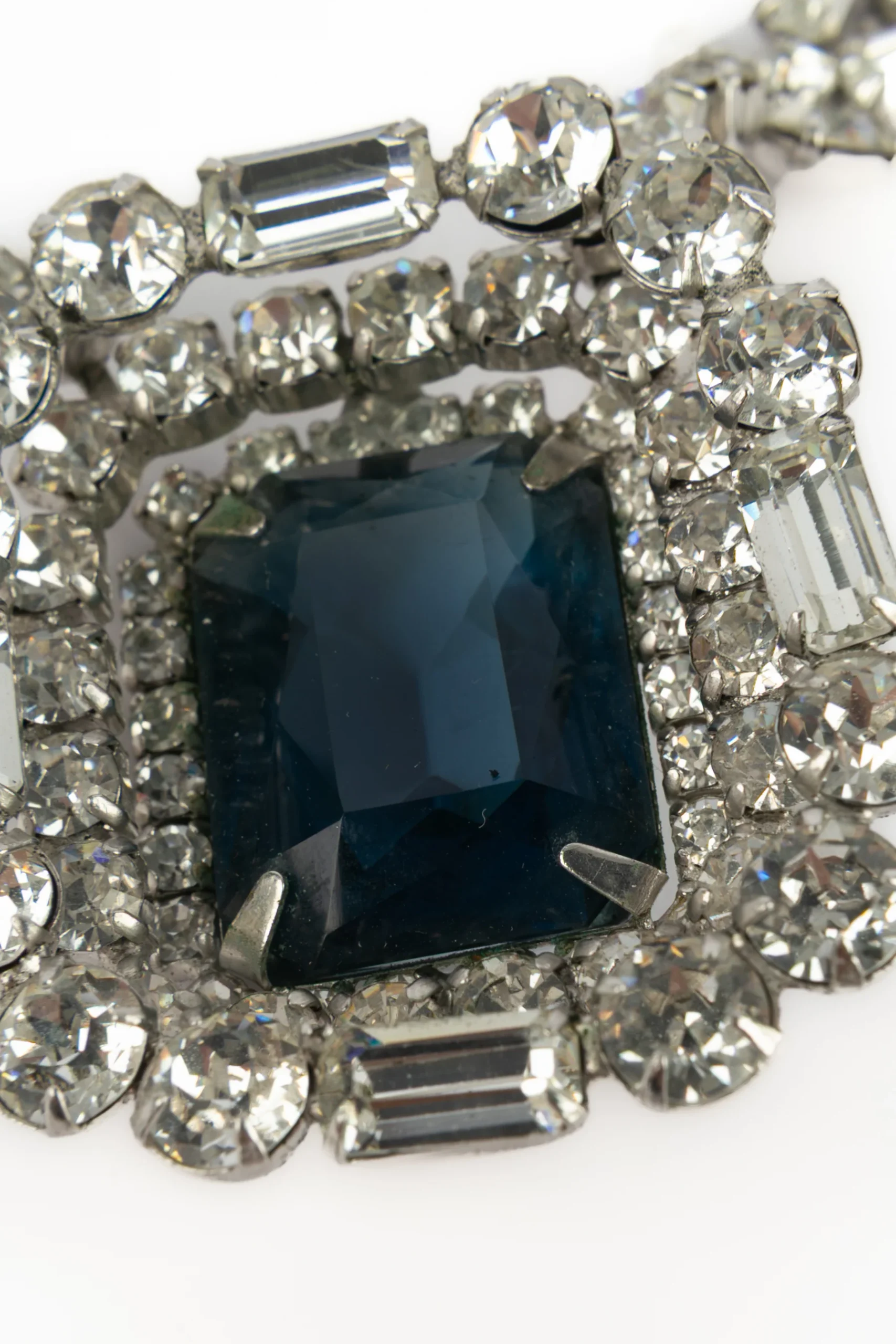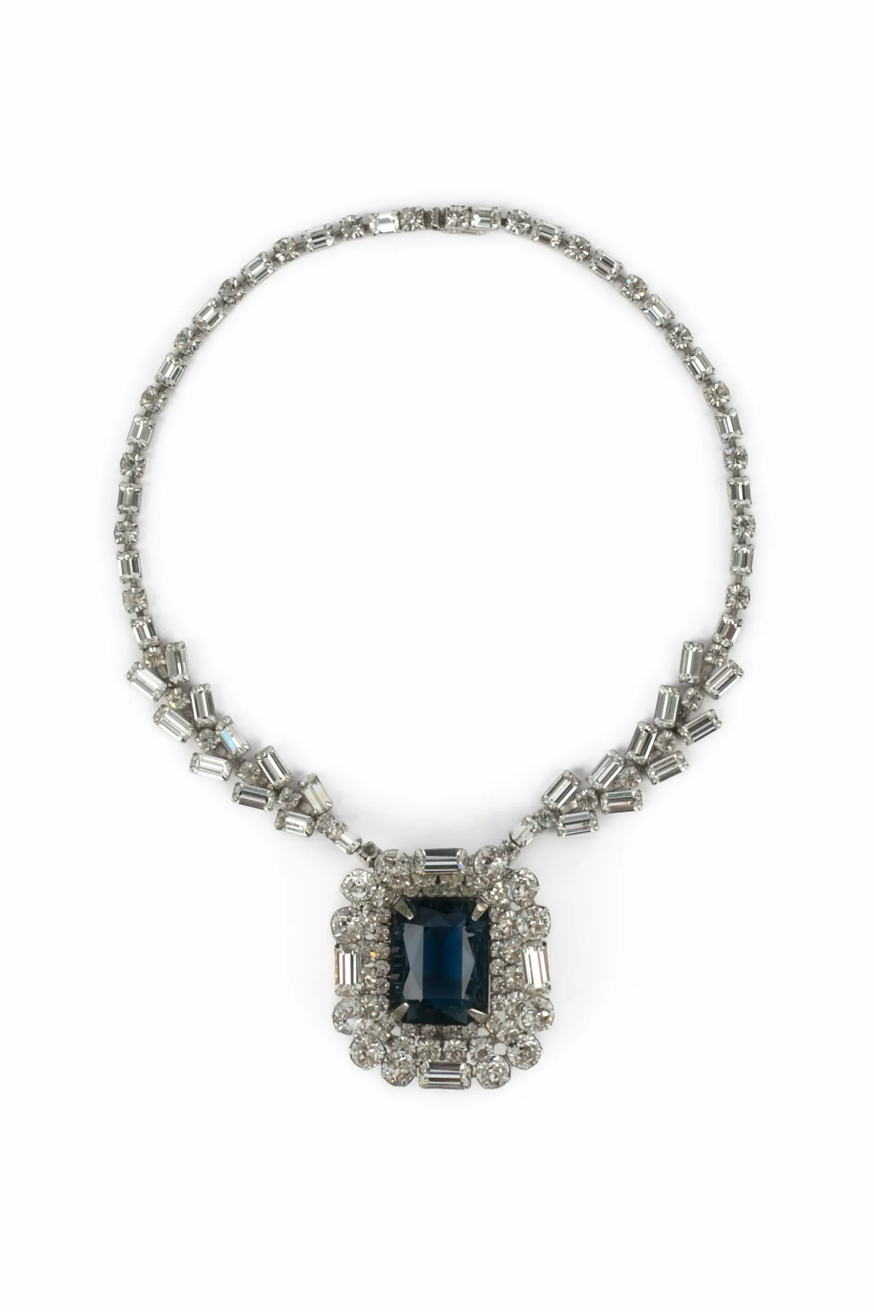 DIOR -Collier en métal doré serti de strass, orné d’un imposant strass central bleu. Bijou datant des années 1950-1960 sous la direction artistique de Sam Kramer.