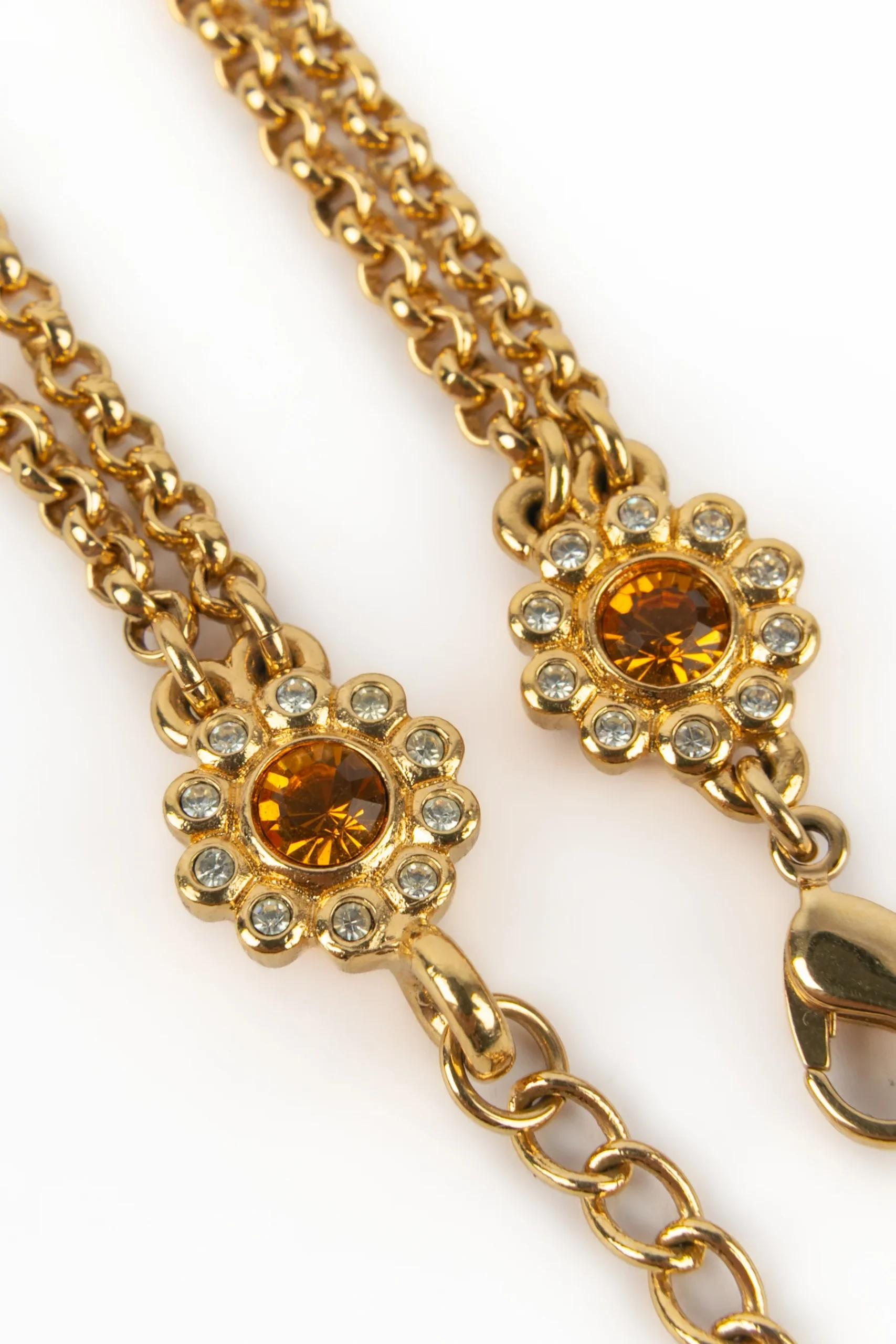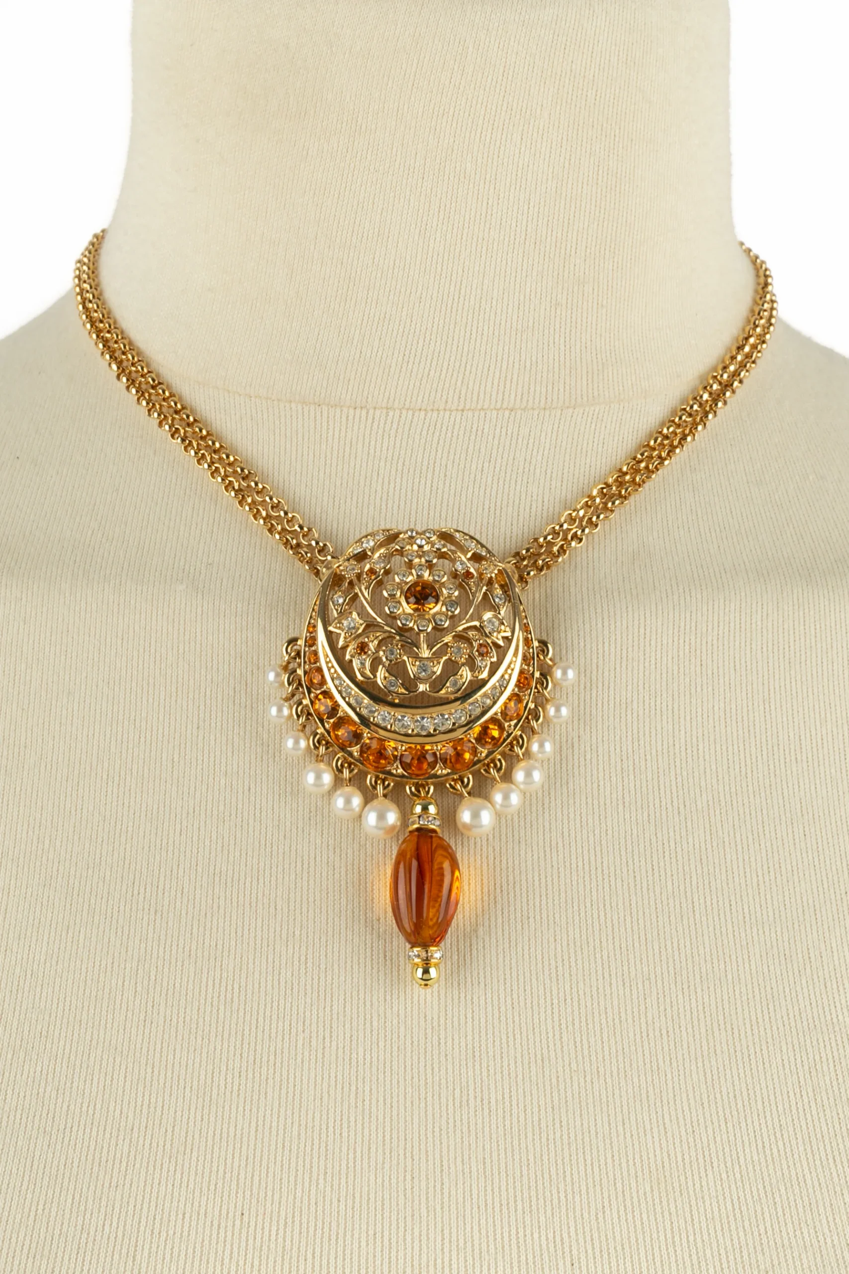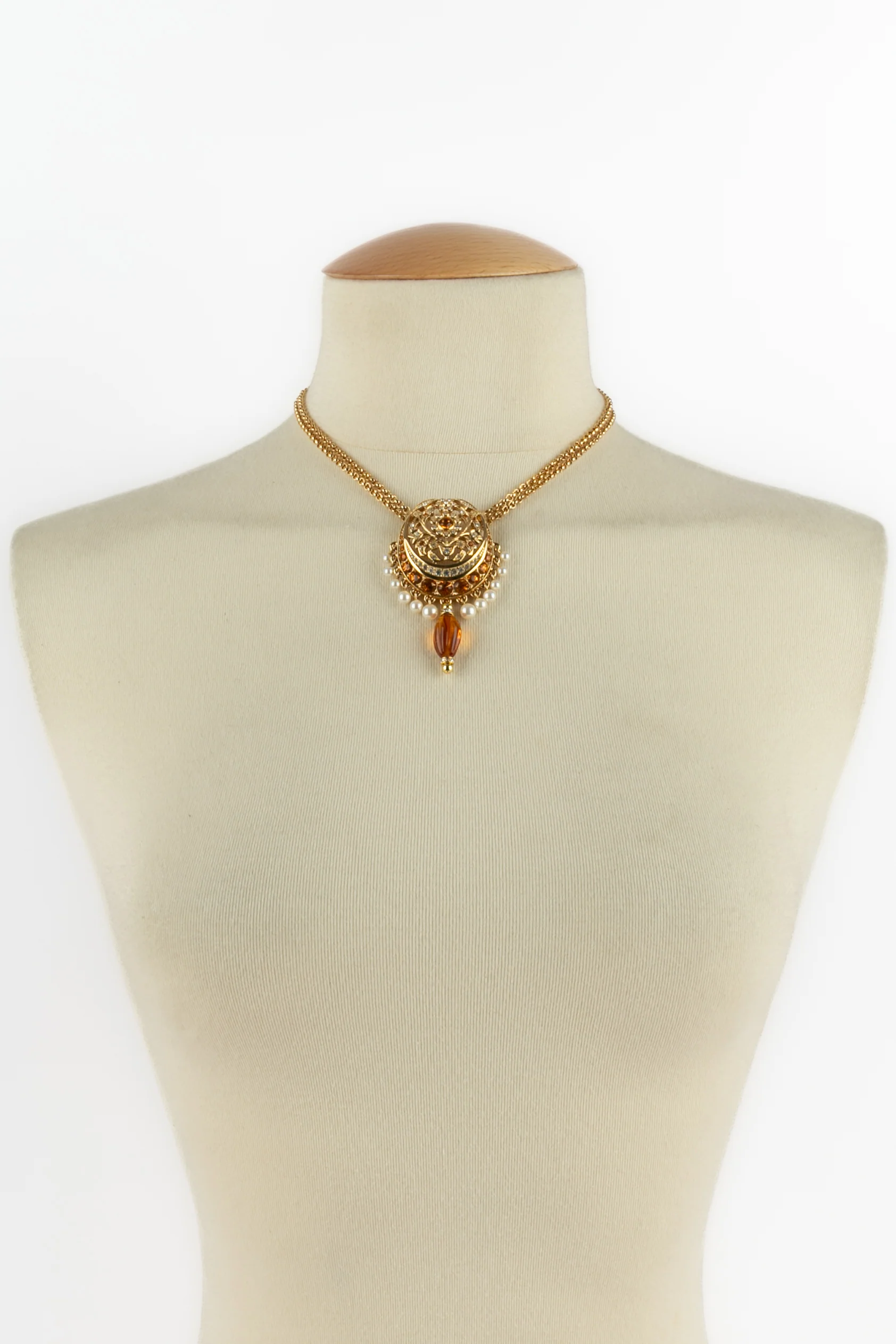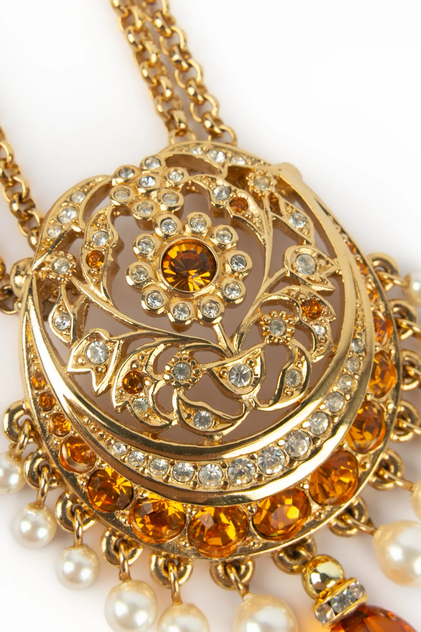 DIOR – Collier en métal doré, strass et petites perles nacrées fantaisies.