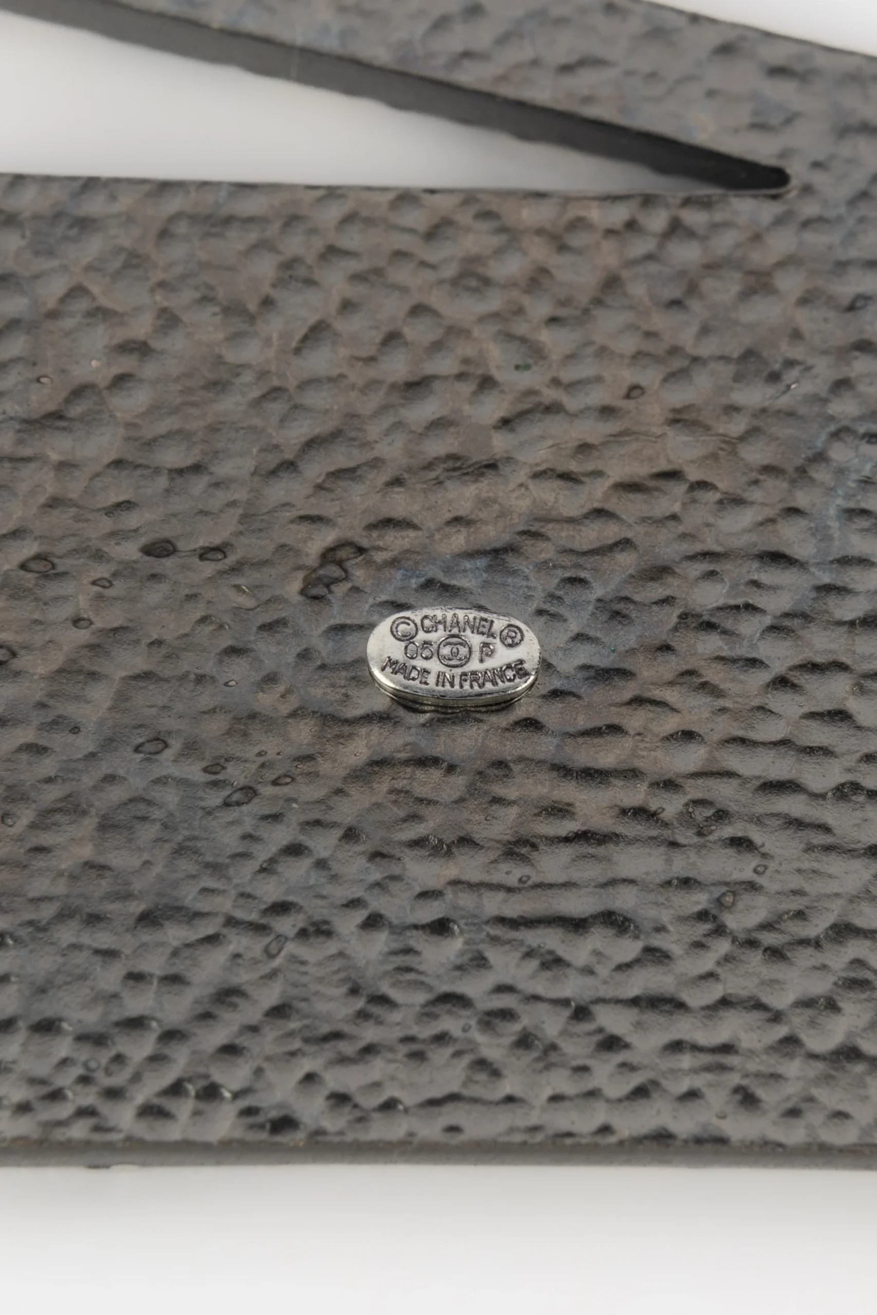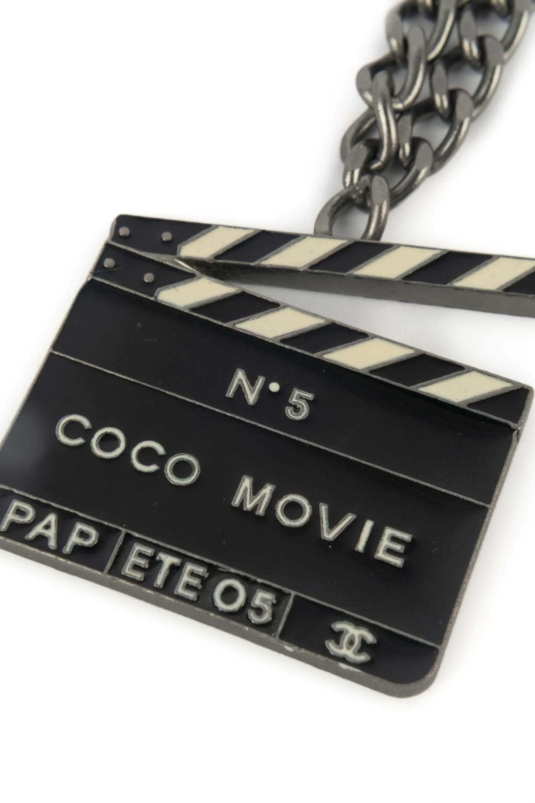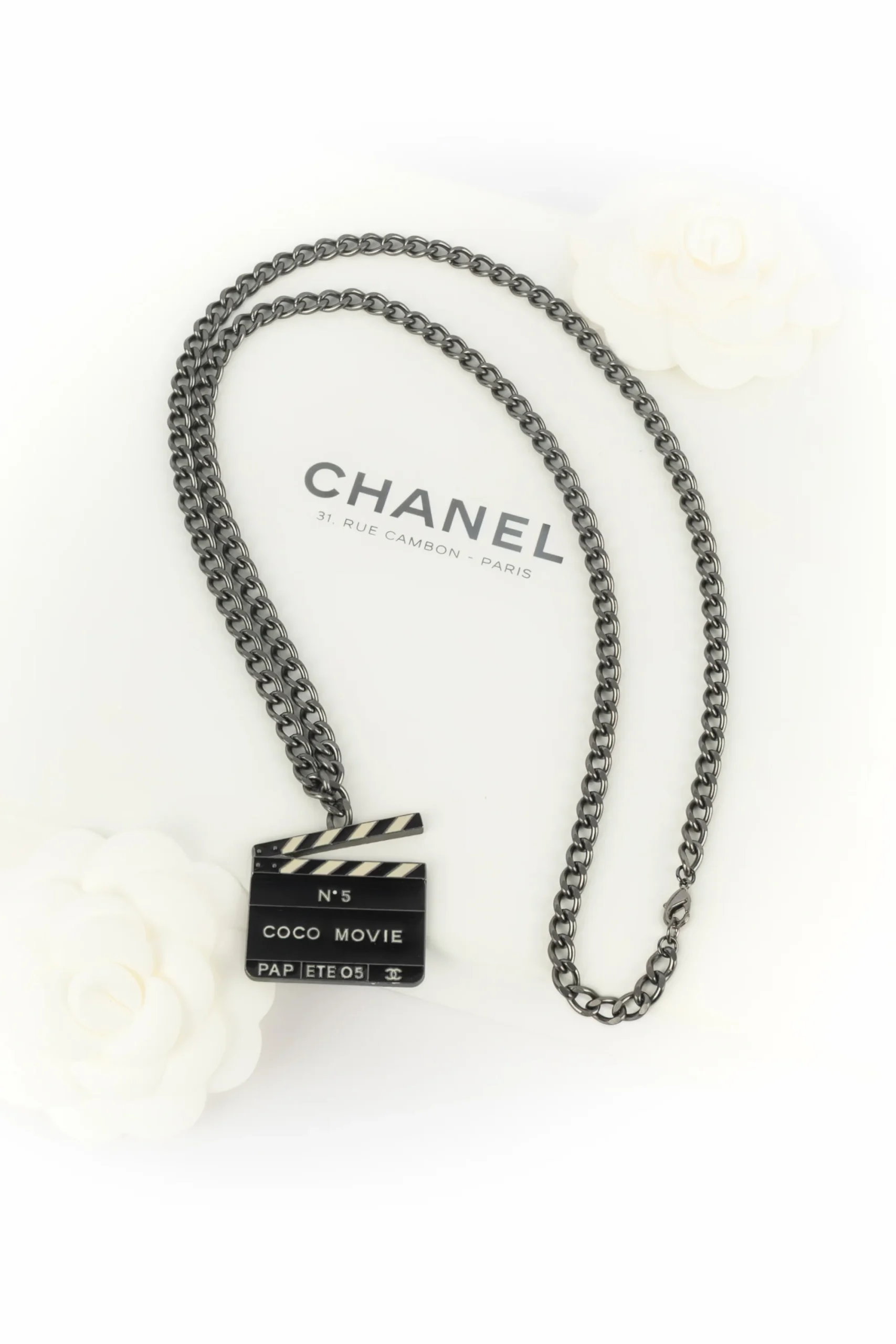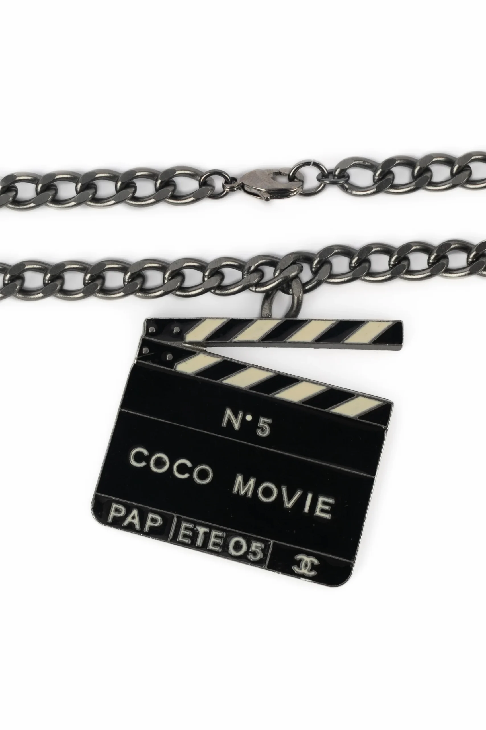CHANEL -(Made in France) Collier en métal argenté foncé et son pendentif figurant un clap de cinéma. Collection Printemps-Eté 2005 sous la direction artistique de Karl Lagerfeld.