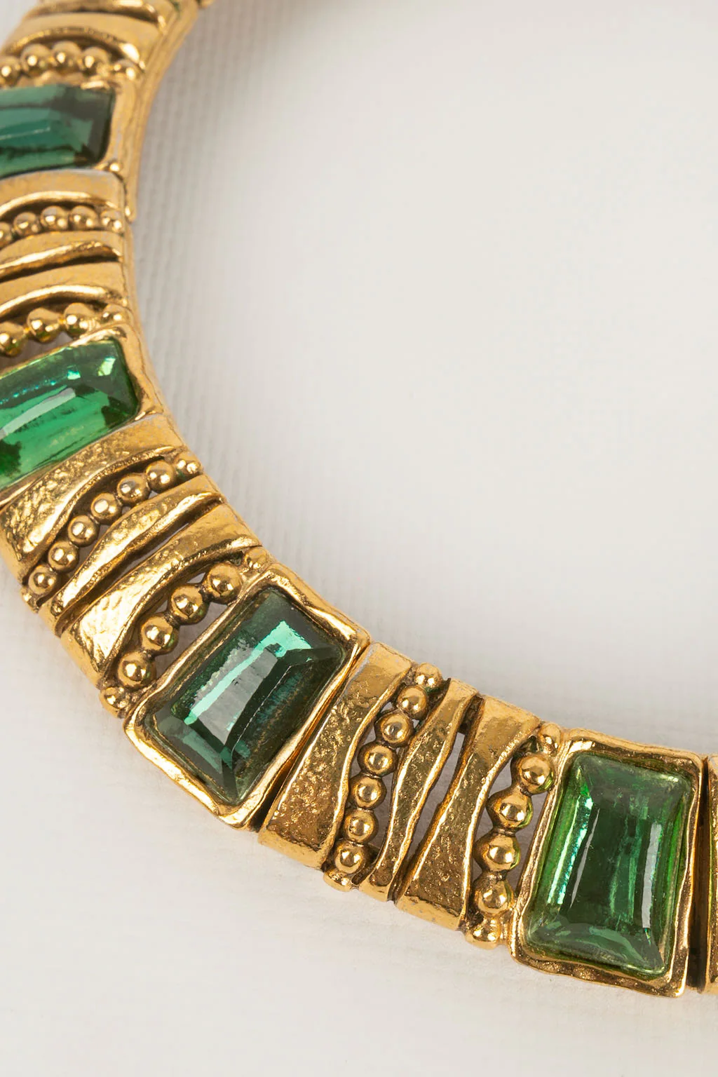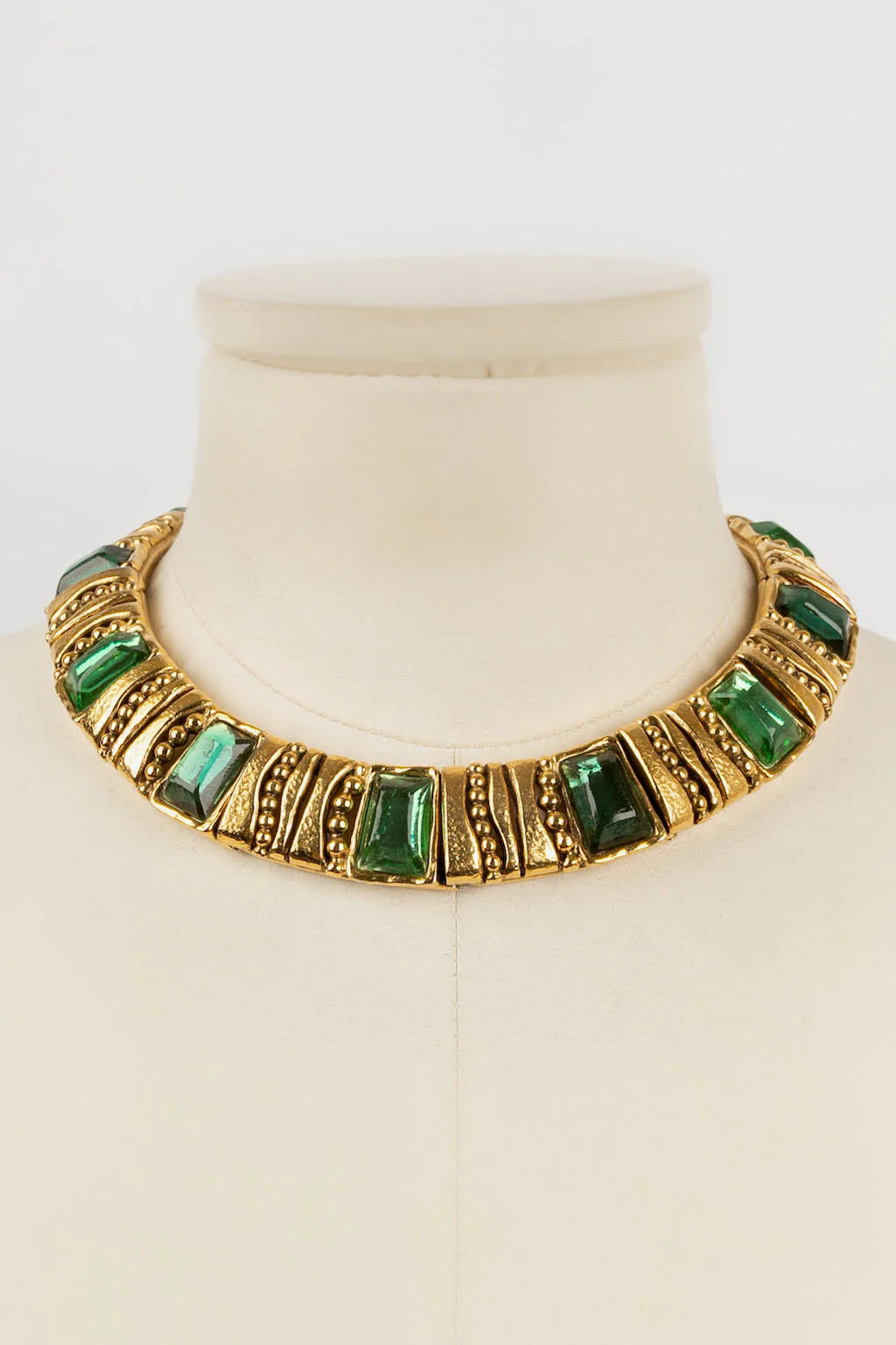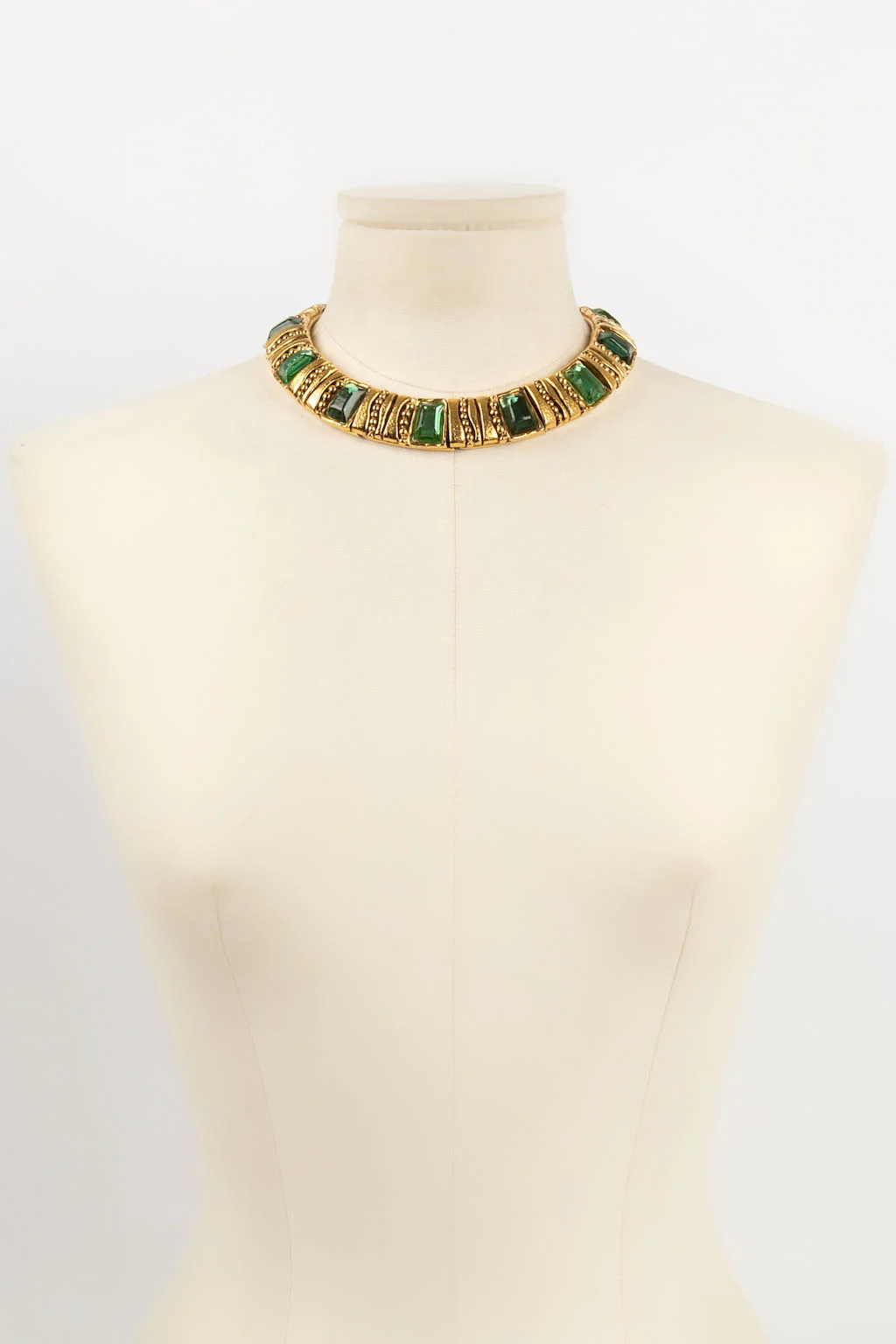 JEAN-LOUIS SCHERRER -(Made in France) Collier court en métal doré pavé de cabochons en résine verte.