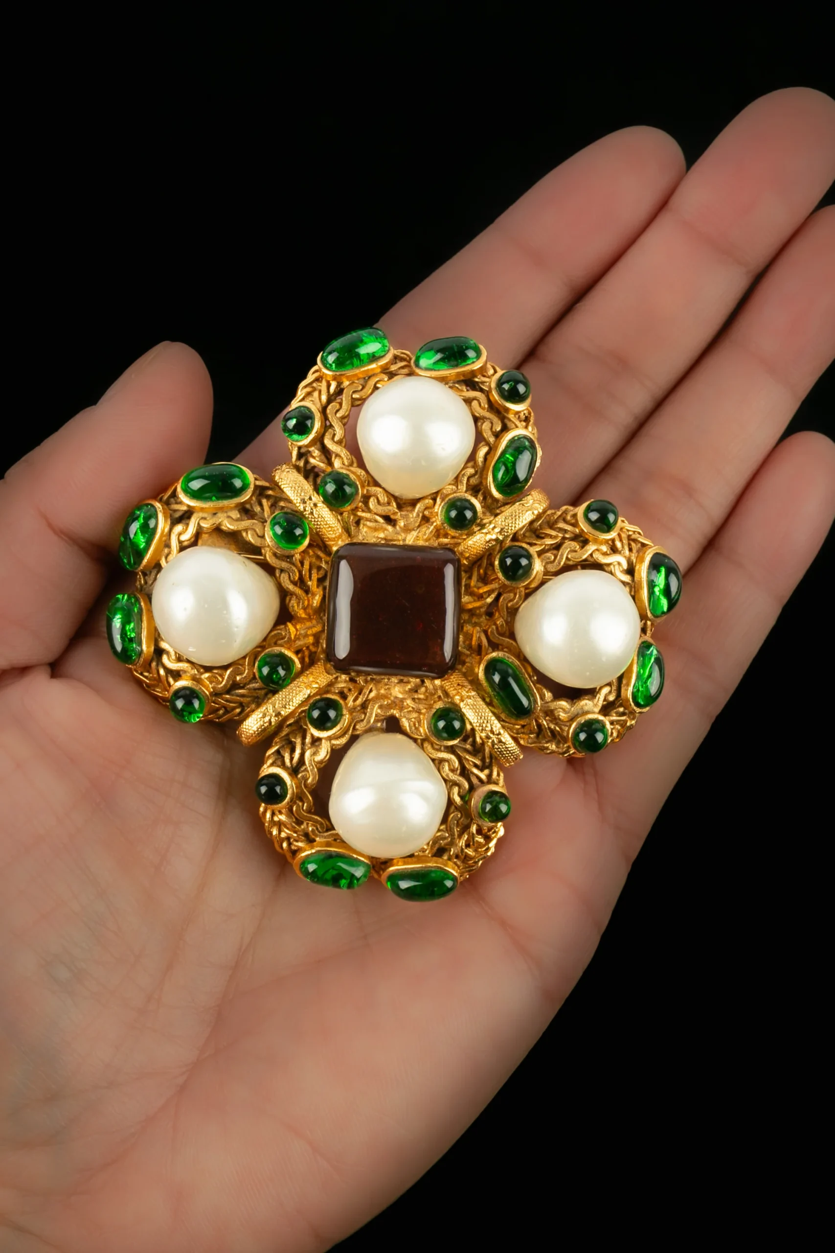 CHANEL – (Made in France) Collier pendentif en métal doré, pâte de verre et cabochons nacrés fantaisies. Collection Automne-Hiver 1994 sous la direction artistique de Karl Lagerfeld. Condition : Très bon état Dimensions : 6 cm x 6 cm