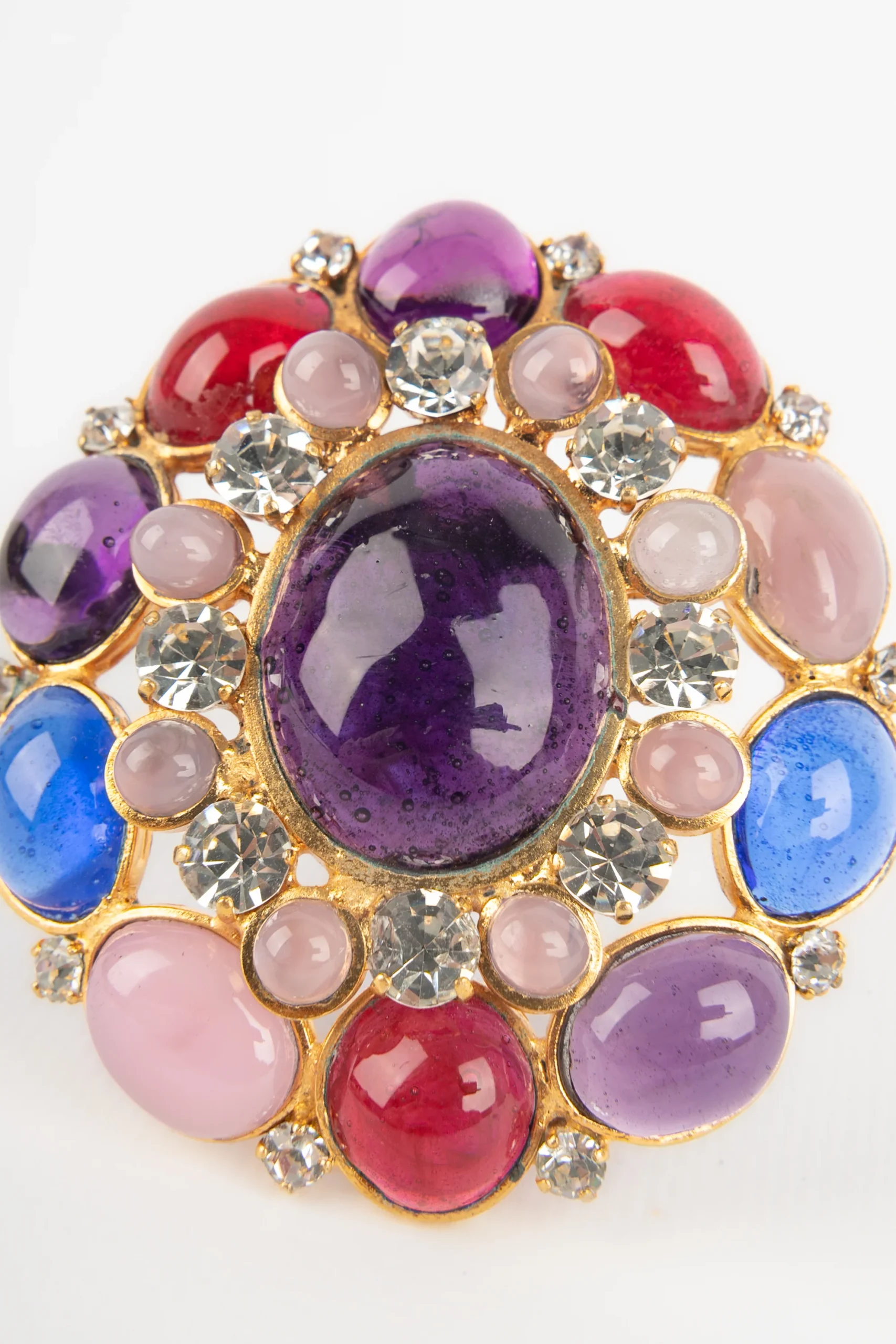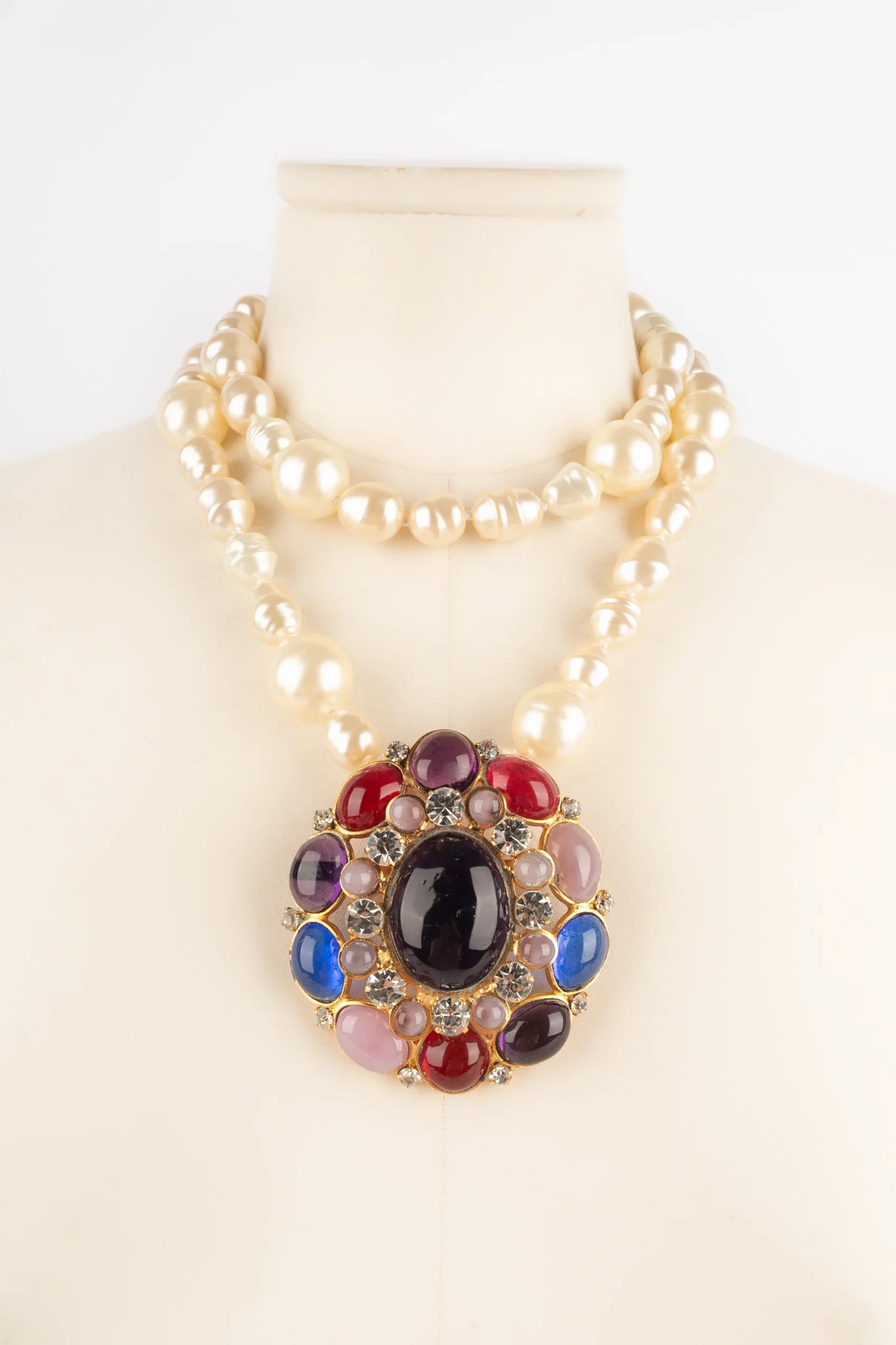 CHANEL -(Made in France) Collier de perles nacrées fantaisies et pendentif en métal doré, pâte de verre et strass.