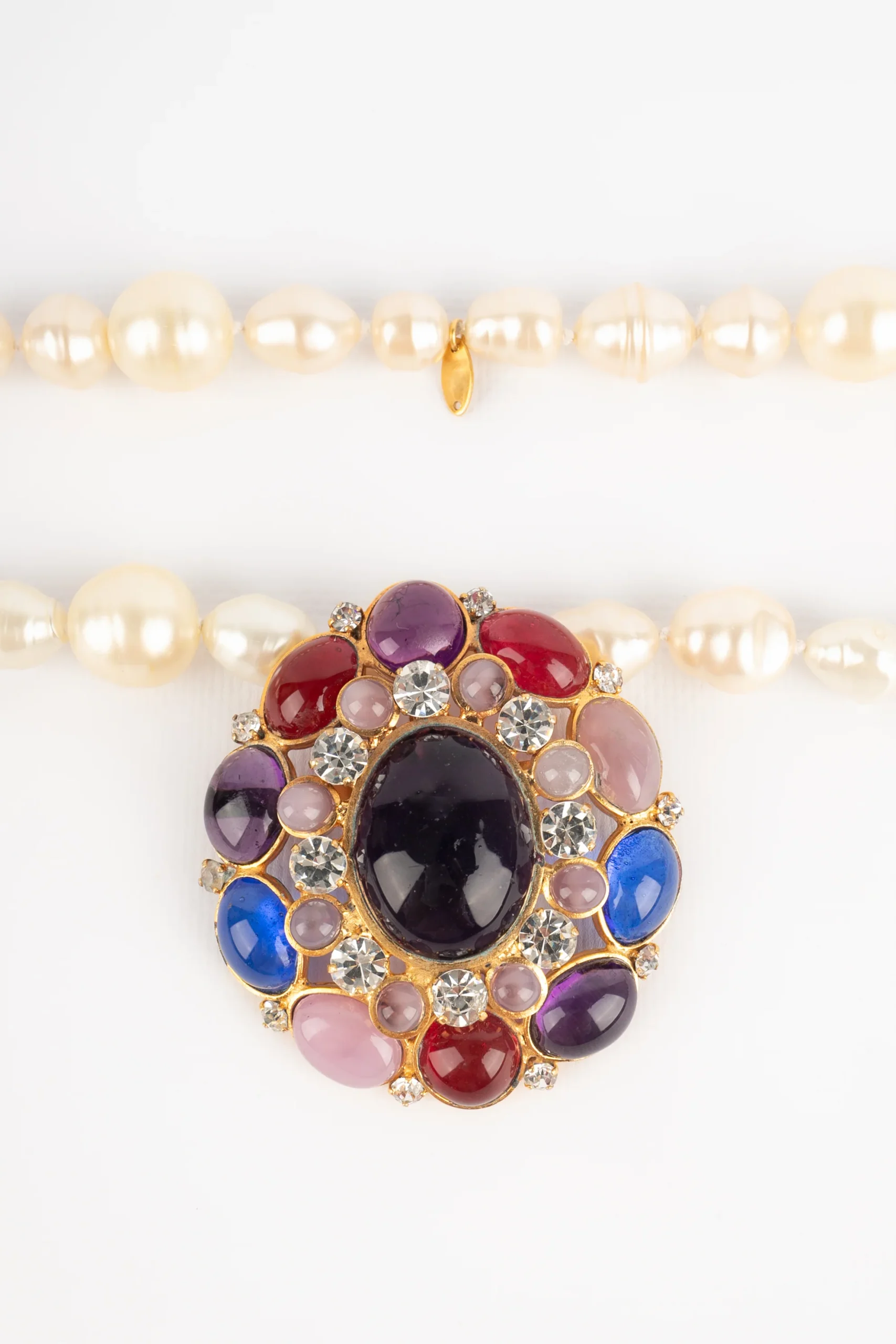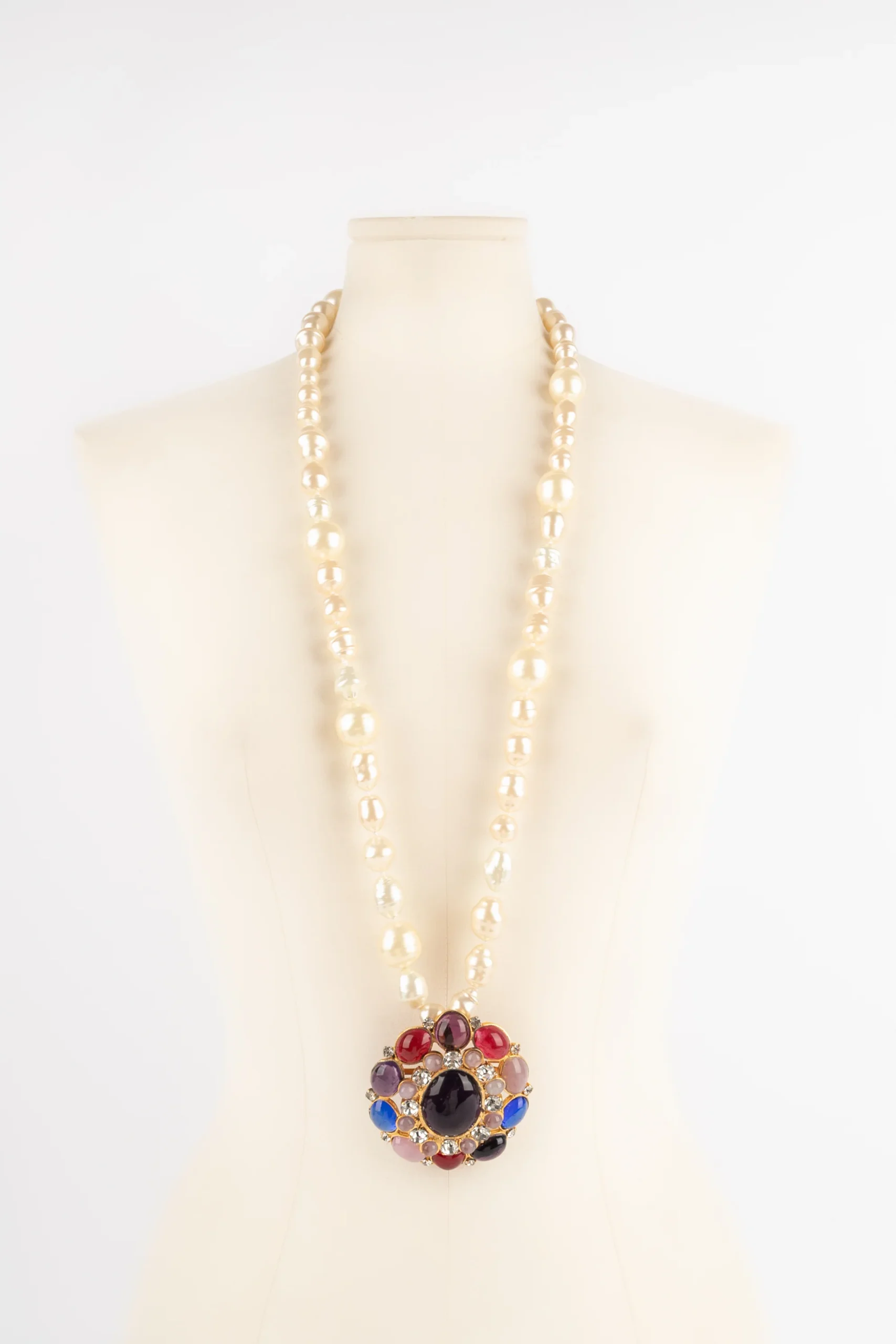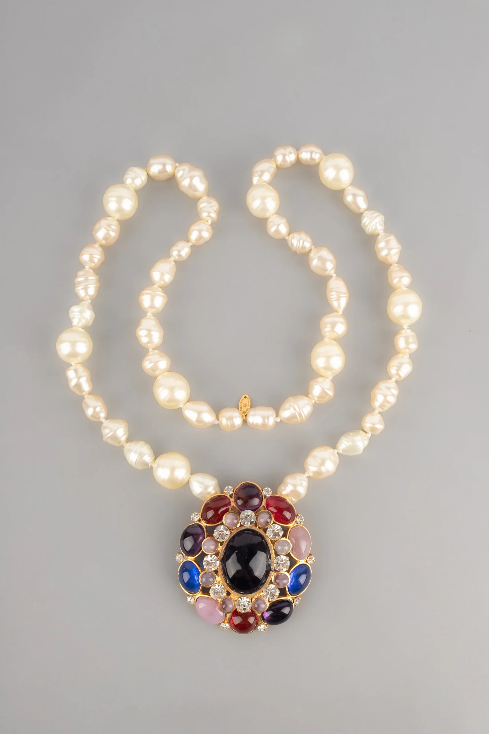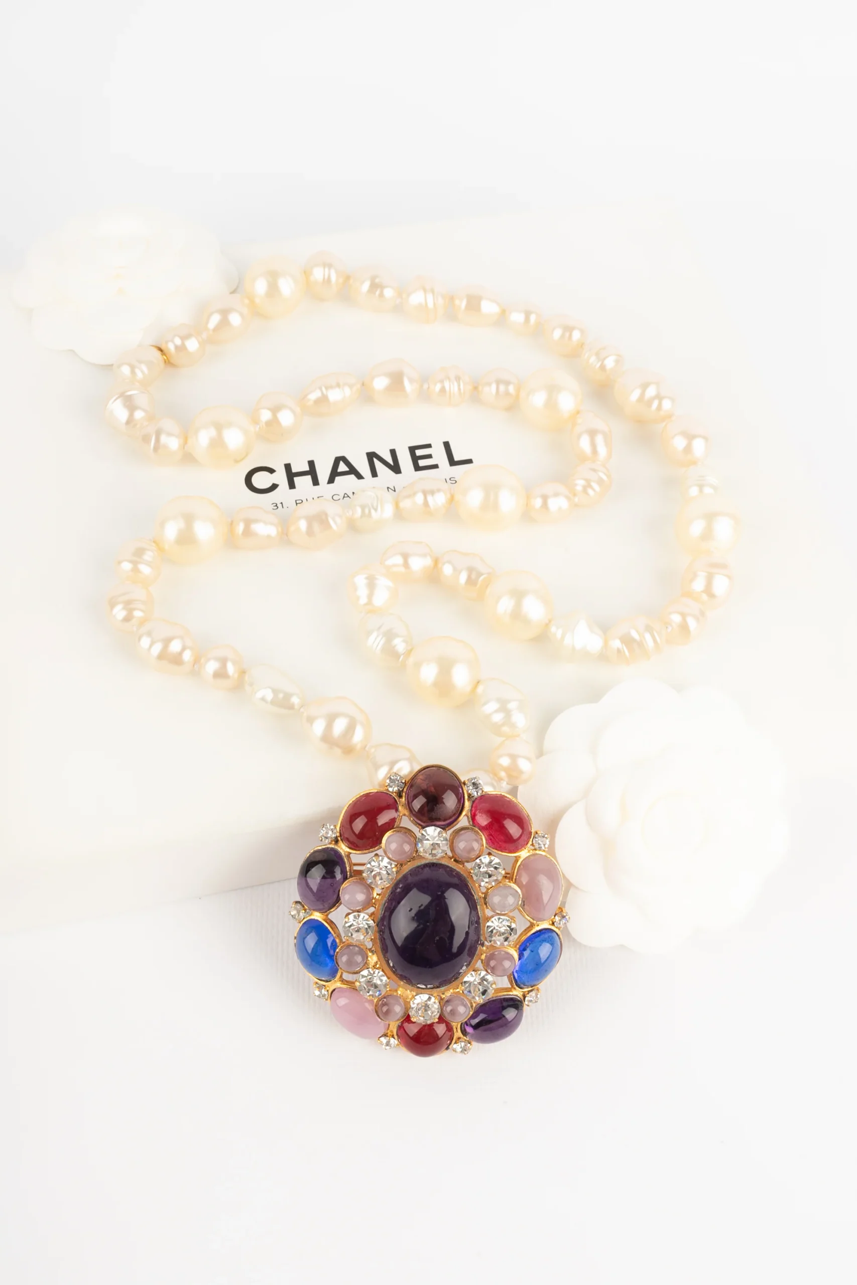 CHANEL -(Made in France) Collier de perles nacrées fantaisies et pendentif en métal doré, pâte de verre et strass. Condition : Très bon état Dimensions : Longueur : 88 cm – Pendentif : 7 cm x 7 cm