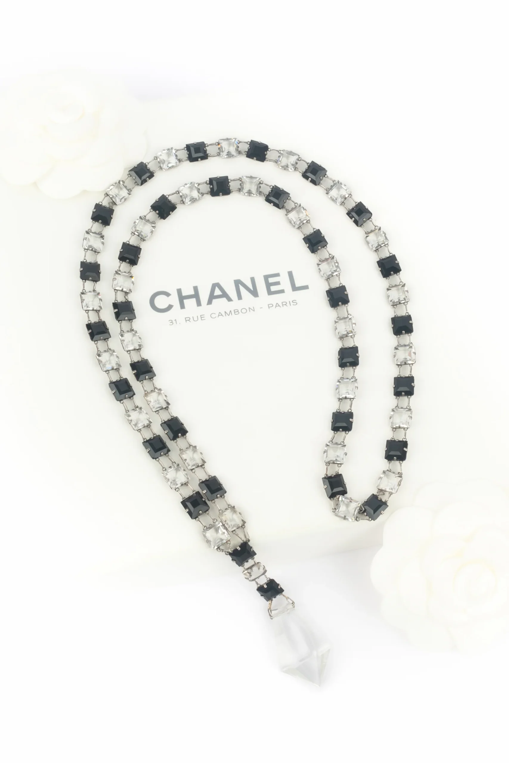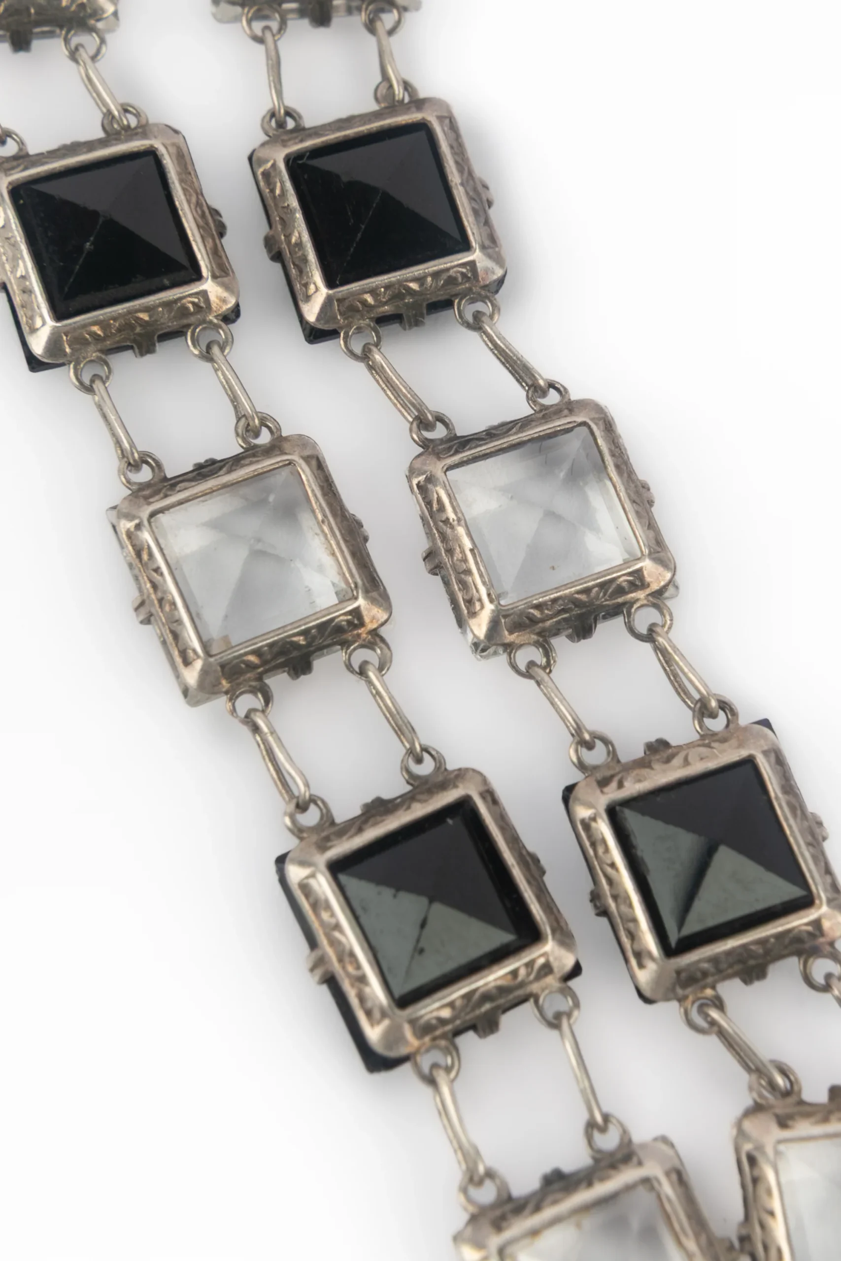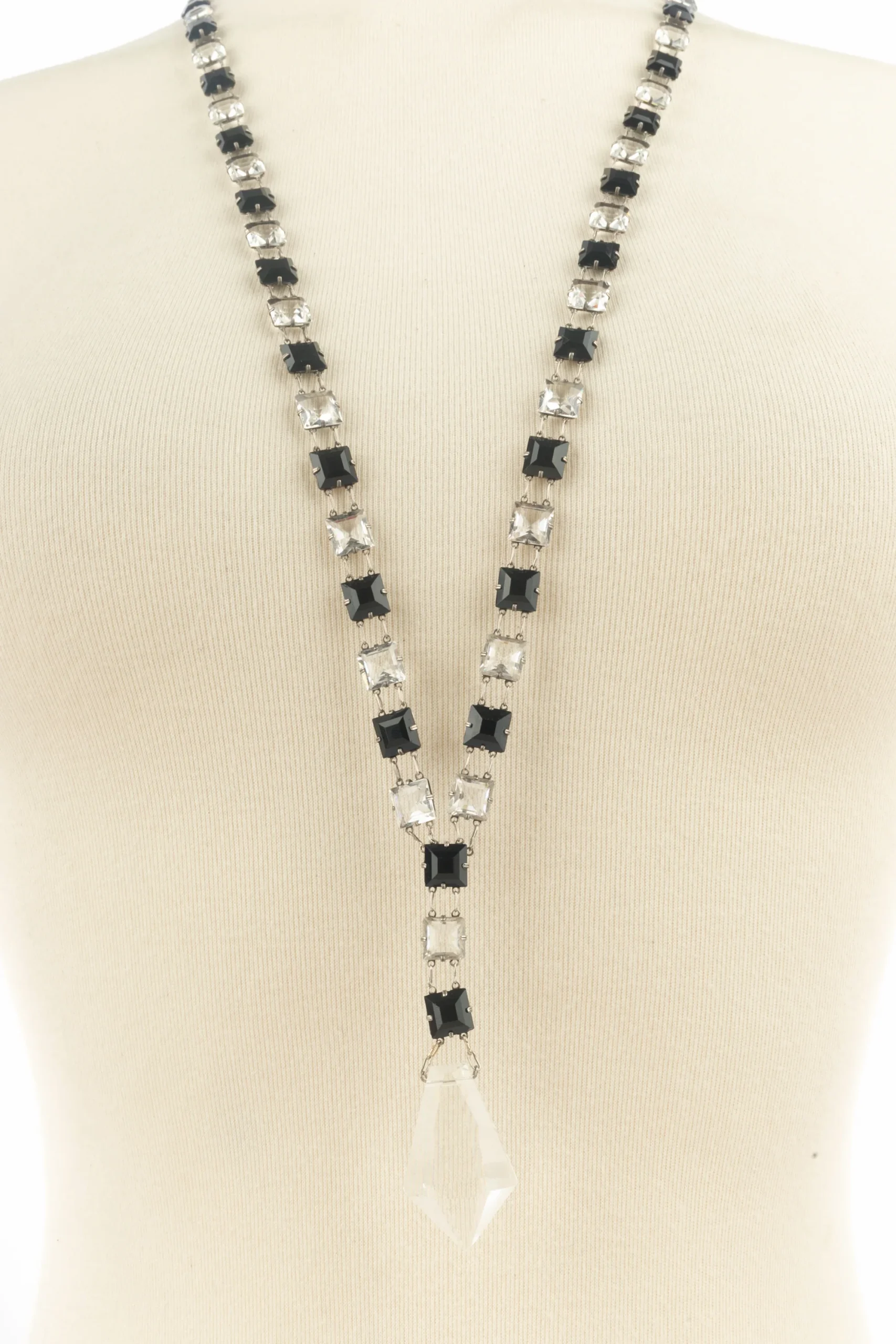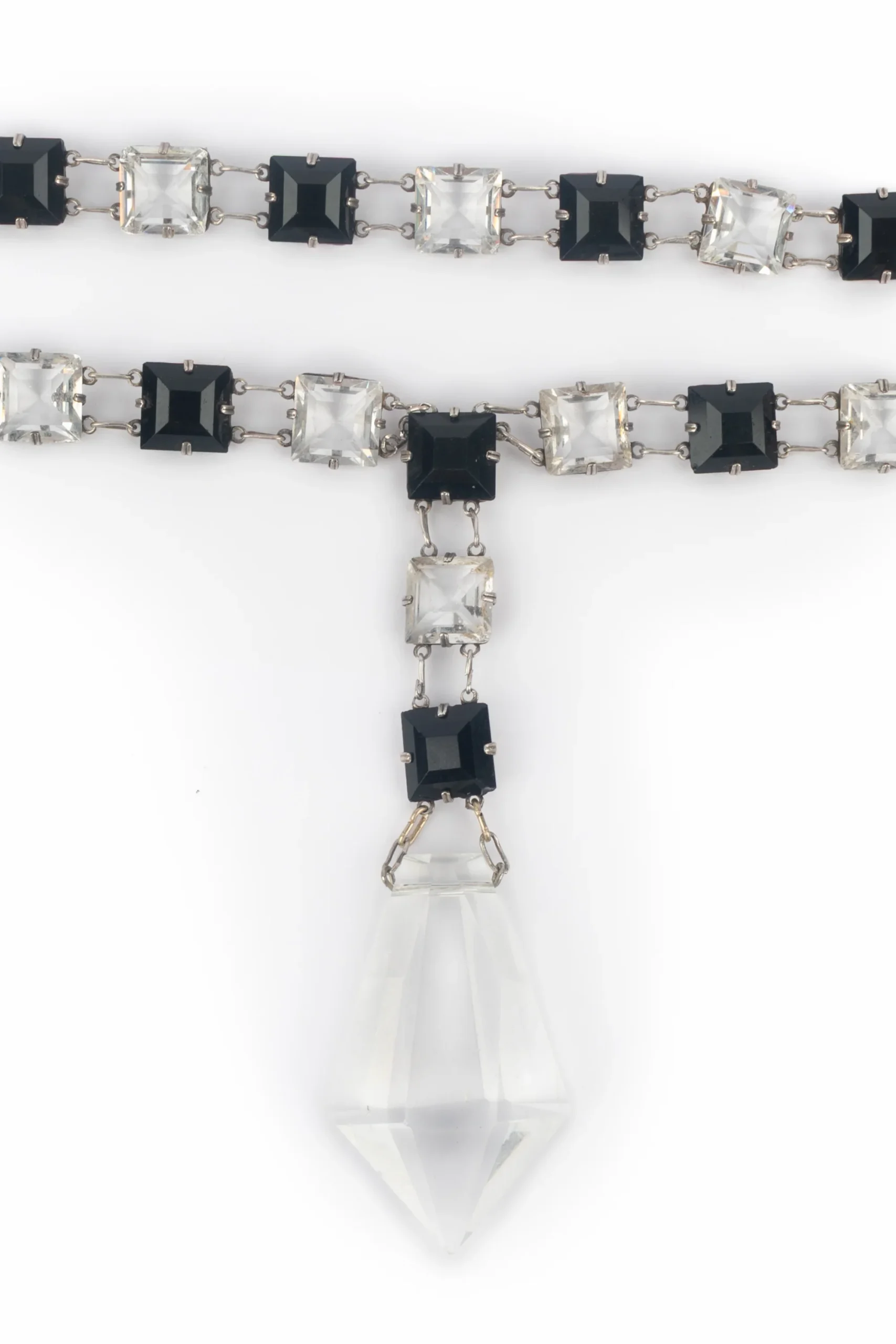 CHANEL – (Made in France) Collier pendentif articulé en métal argenté et pâte de verre transparente et noire. Bijou non signé datant des années 1930. Condition : Très bon état Dimensions : Longueur : 80 cm