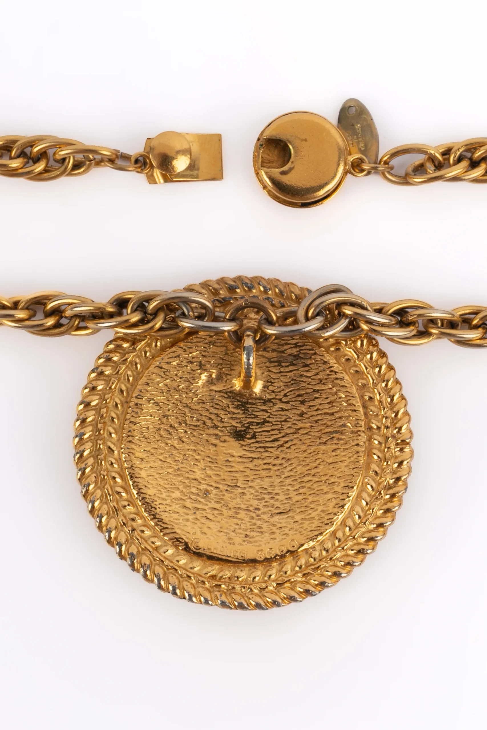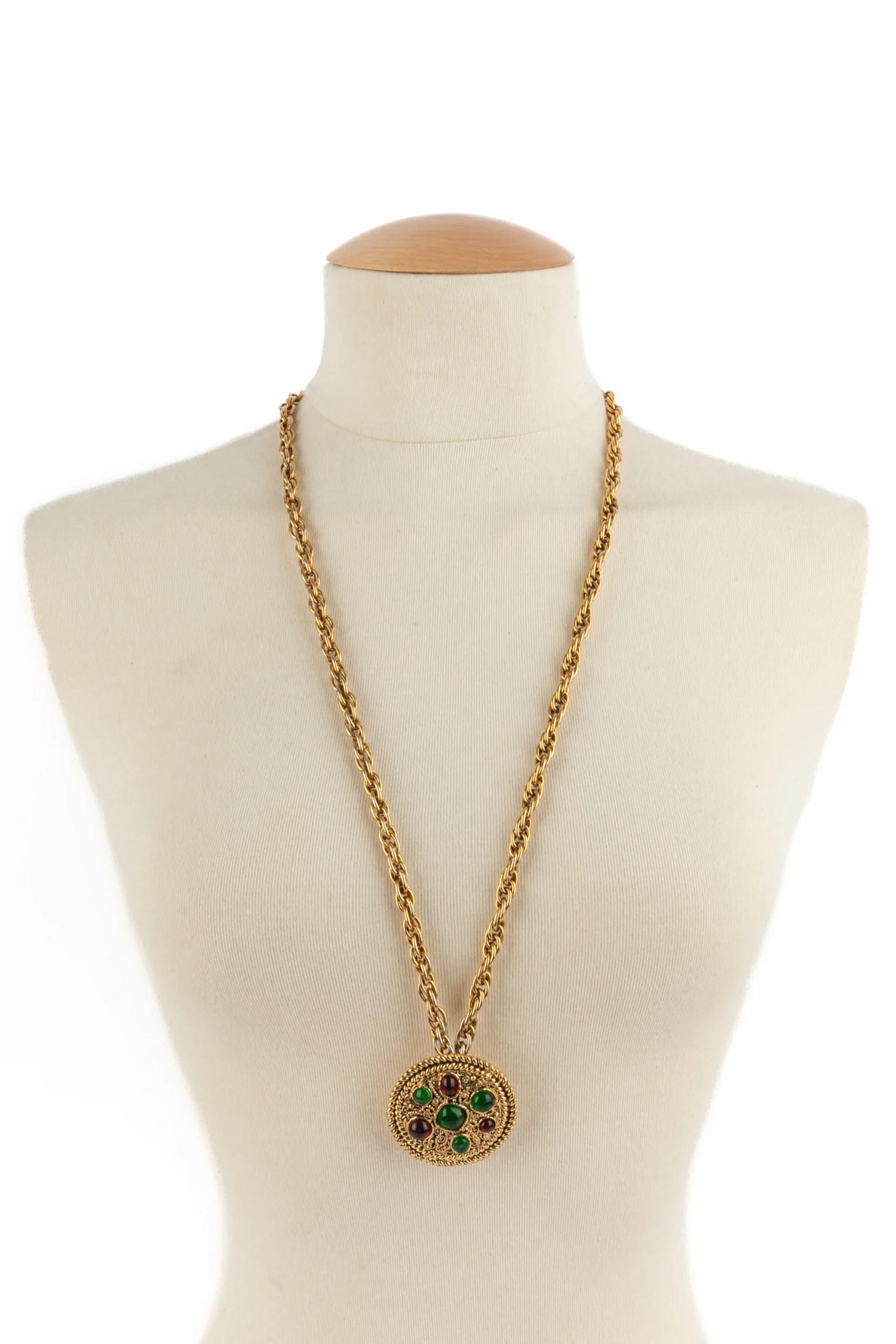 CHANEL – (Made in France) Long collier en métal doré et pendentif pavé de petits cabochons colorés en pâte de verre. Collection 1984. Travail de l’atelier Goossens pour la maison Chanel.