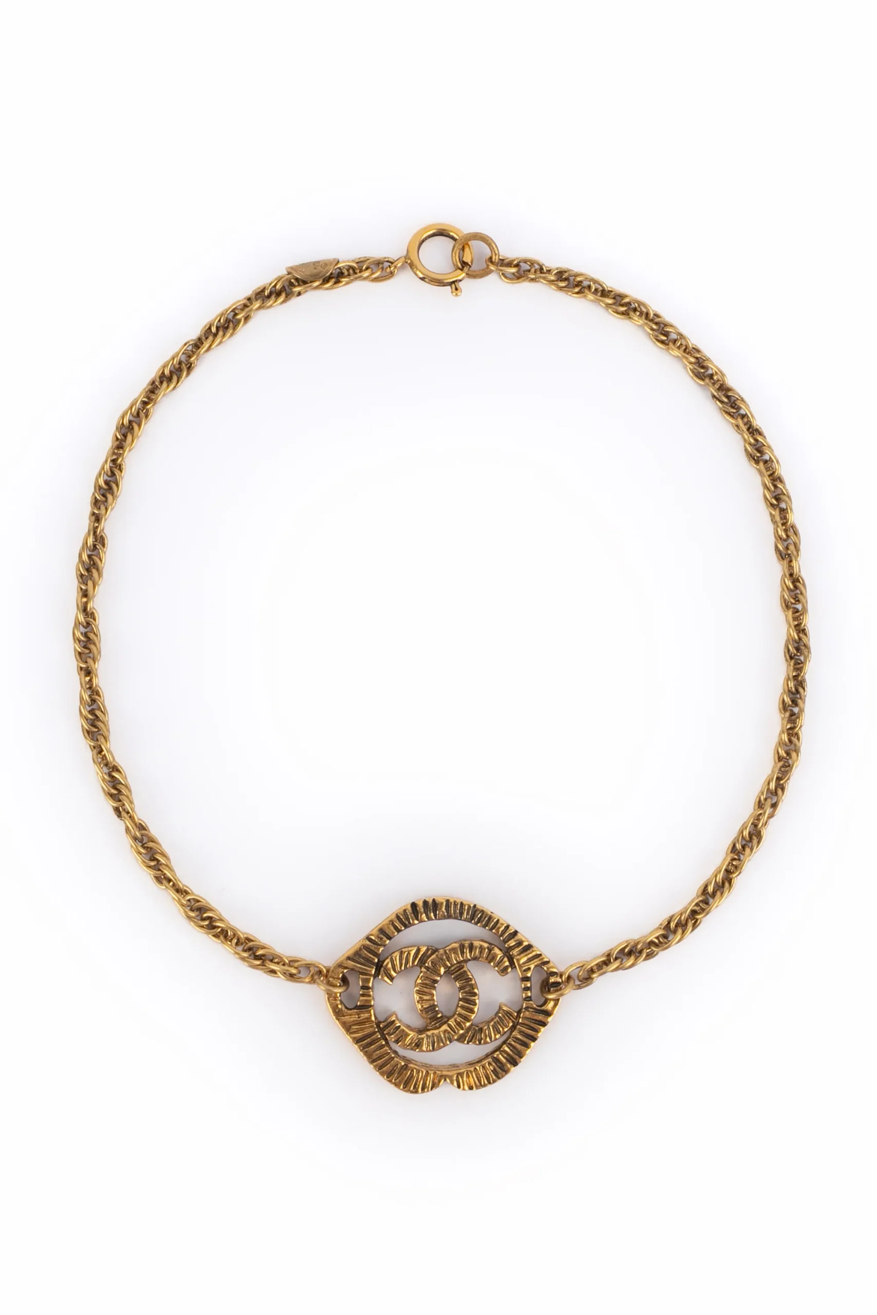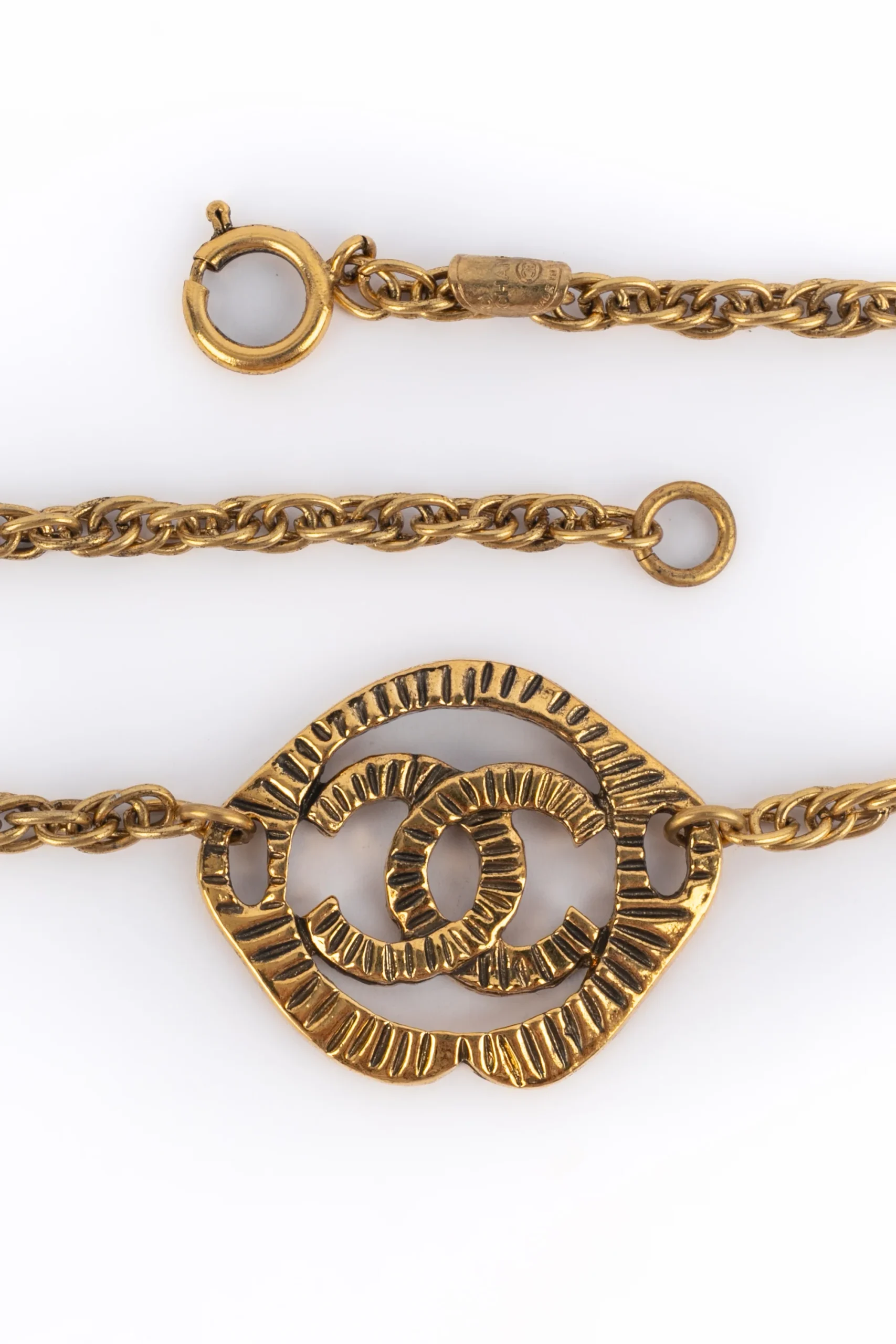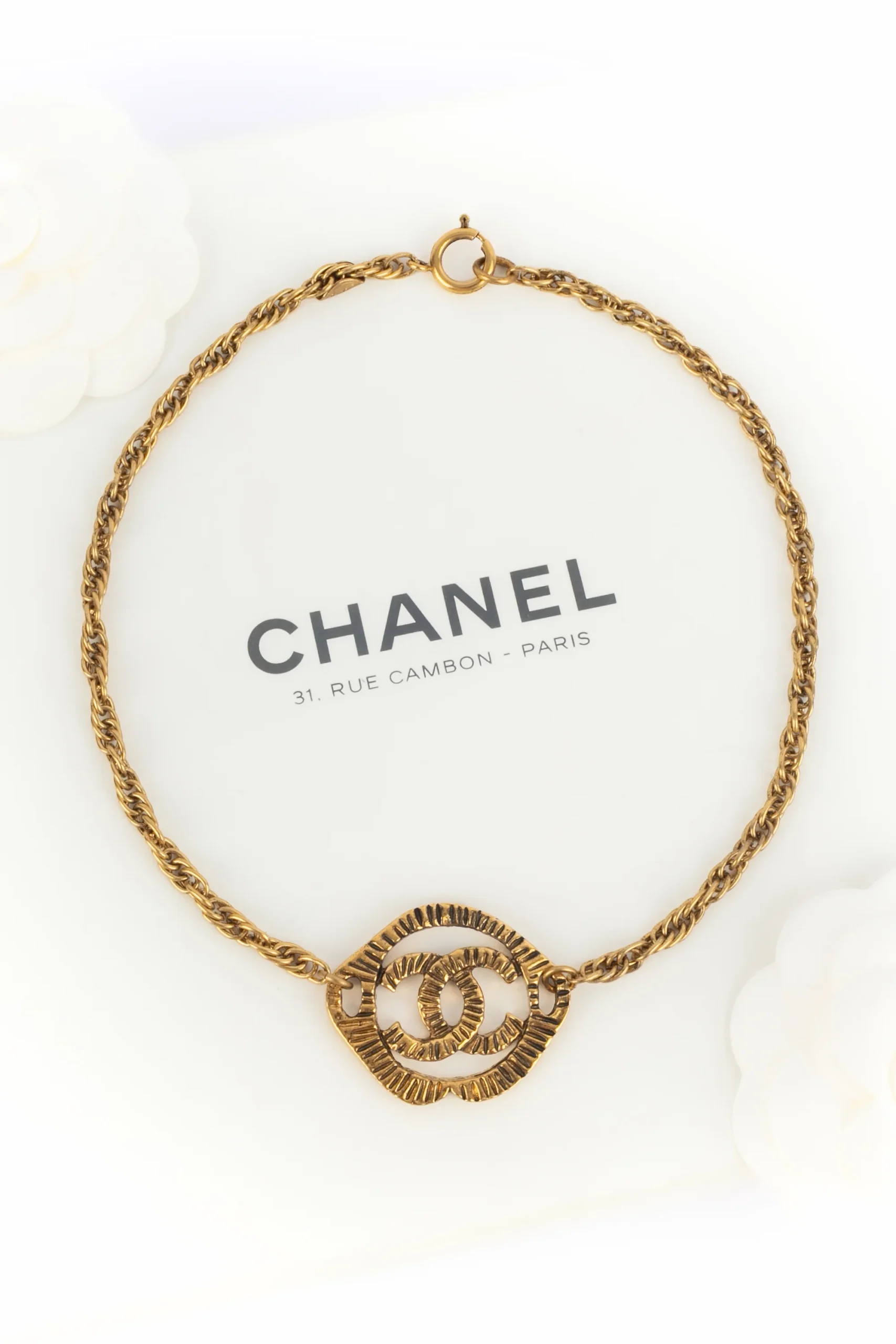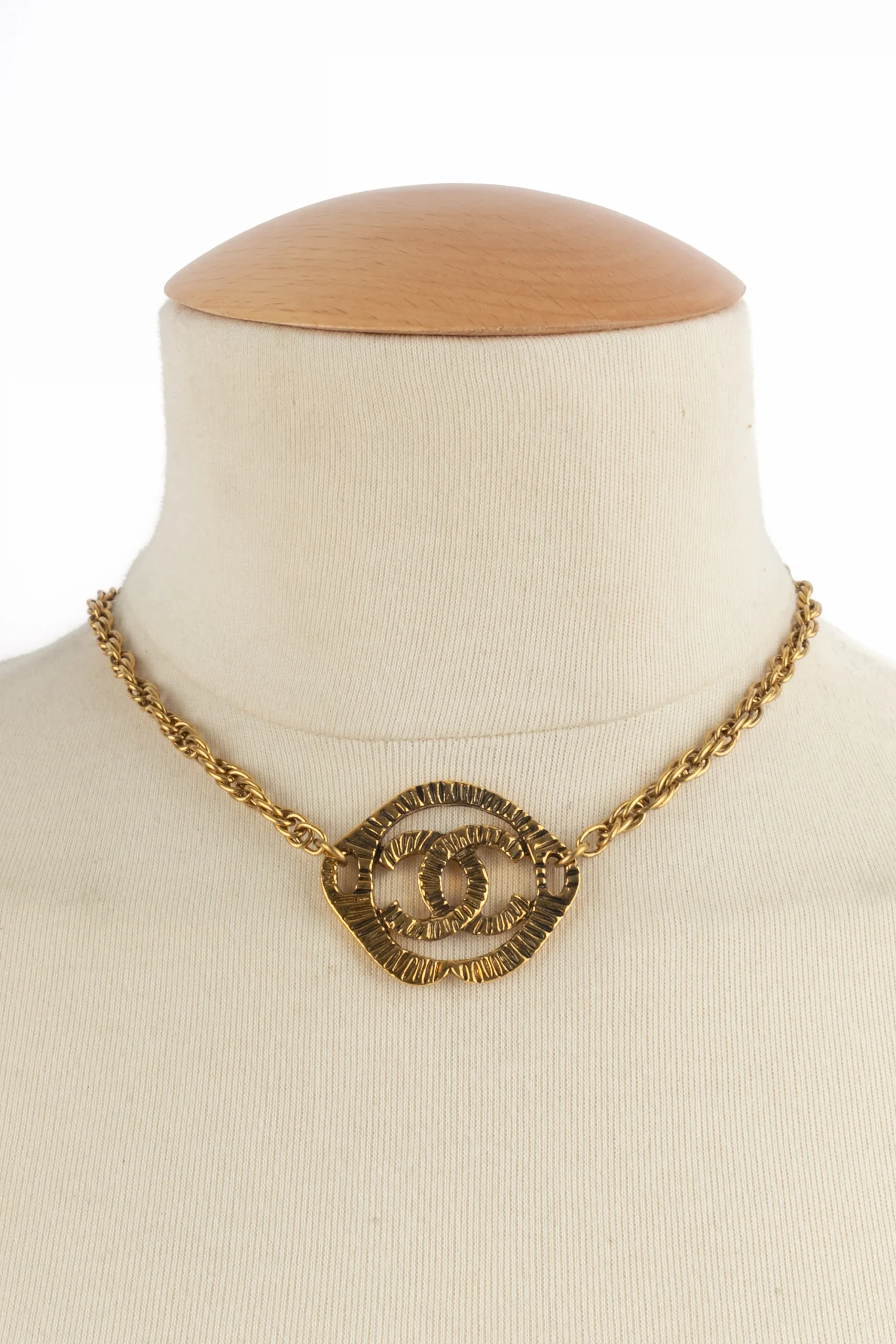 CHANEL – (Made in France) Collier court en métal doré et pendentif cc. Bijou datant des années 1990.