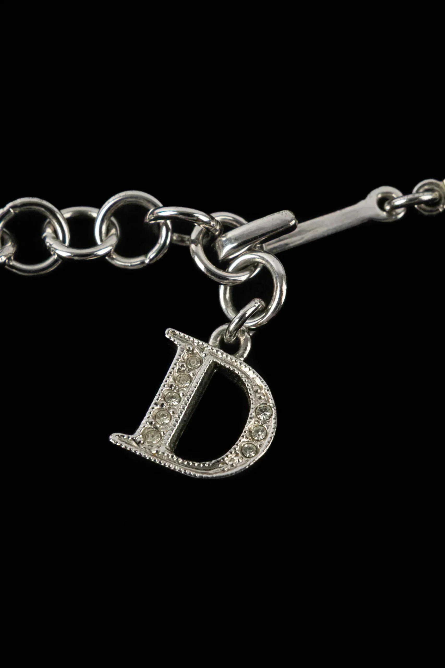 DIOR – Collier court en métal argenté serti de nacre fantaisie et strass. Collection circa 2000 sous la direction artistique de John Galliano. Condition : Très bon état Dimensions : Longueur : de 31,5 cm à 37 cm