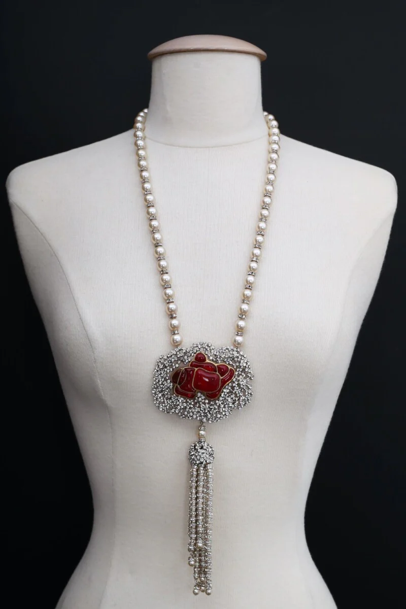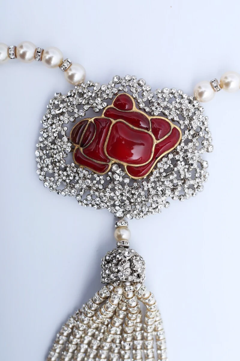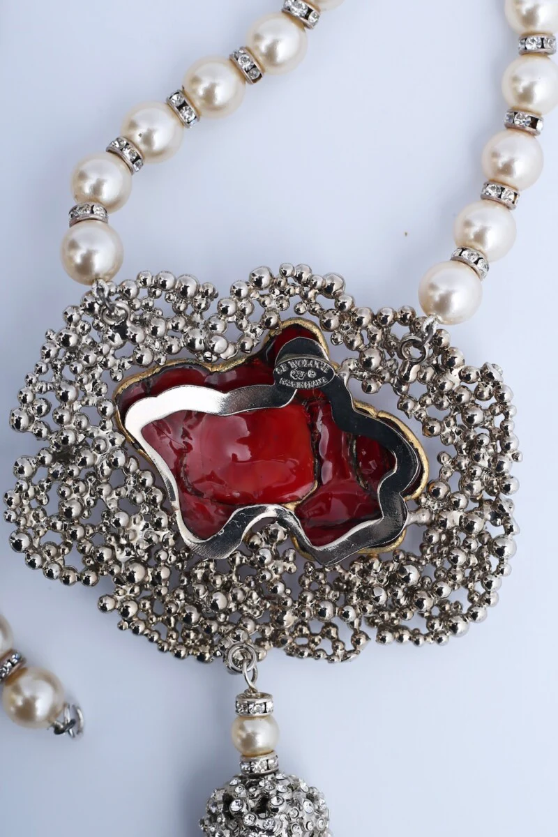 WOLOCH -Made in France) Collier de perles nacrées fantaisies, pâte de verre rouge, métal argenté et métal doré. Collection « Rose Ombre Portée » datant de 2011. Pièce unique. Grand Prix des Métiers d’Art de la ville de Paris en 1983, Serge-Eric Woloch a été, pendant 25 ans, l’un des plus importants paruriers de la Maison Chanel. Il a également collaboré aux collections de bijoux des maisons Dior, Valentino, Mugler, Christian Lacroix, Loewe…