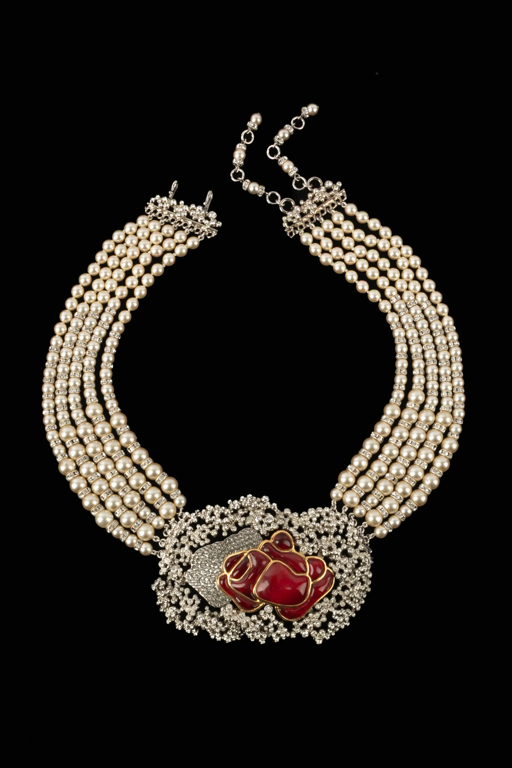 WOLOCH – Collier court multirangs de perles nacrées fantaisies, strass, métal argenté et pâte de verre.