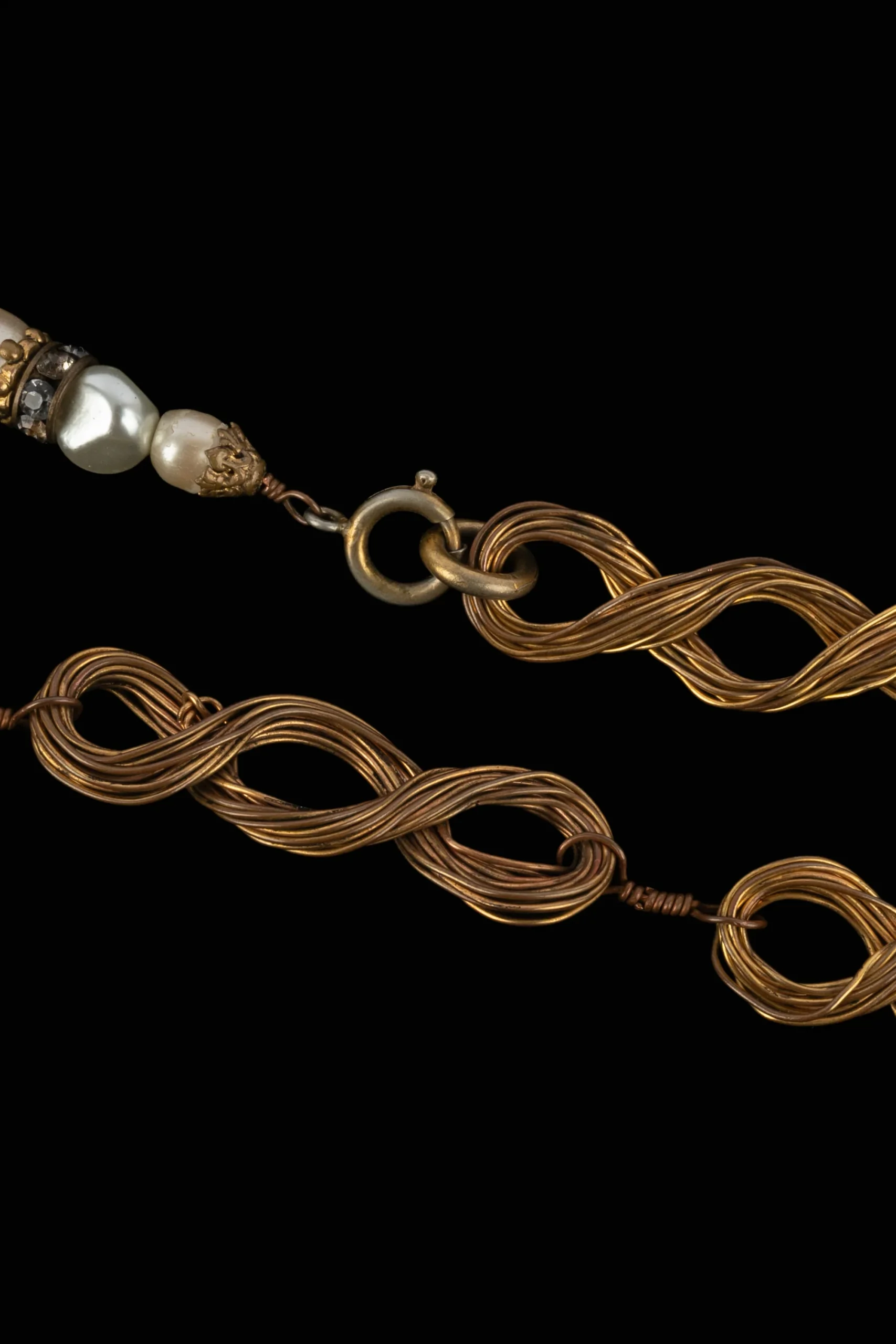 CHANEL – Sautoir composé de perles de nacre fantaisie, rondelle de strass, entrecoupées de motifs fils torsadés. Bijou non signé, vendu avec un certificat d’authenticité. Collection circa 1960, par Coco Chanel. Condition : Très bon état Dimensions : Longueur : 88 cm
