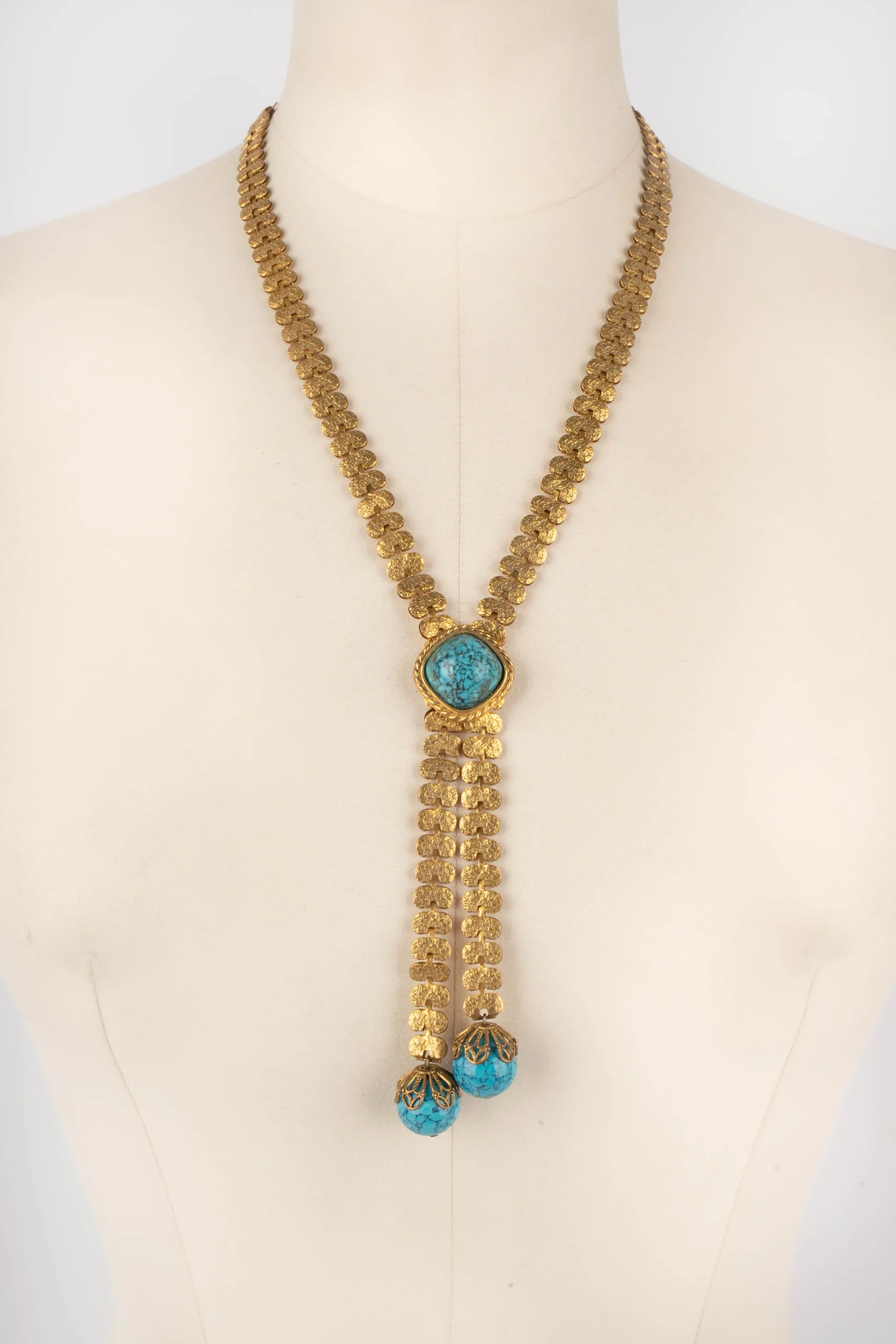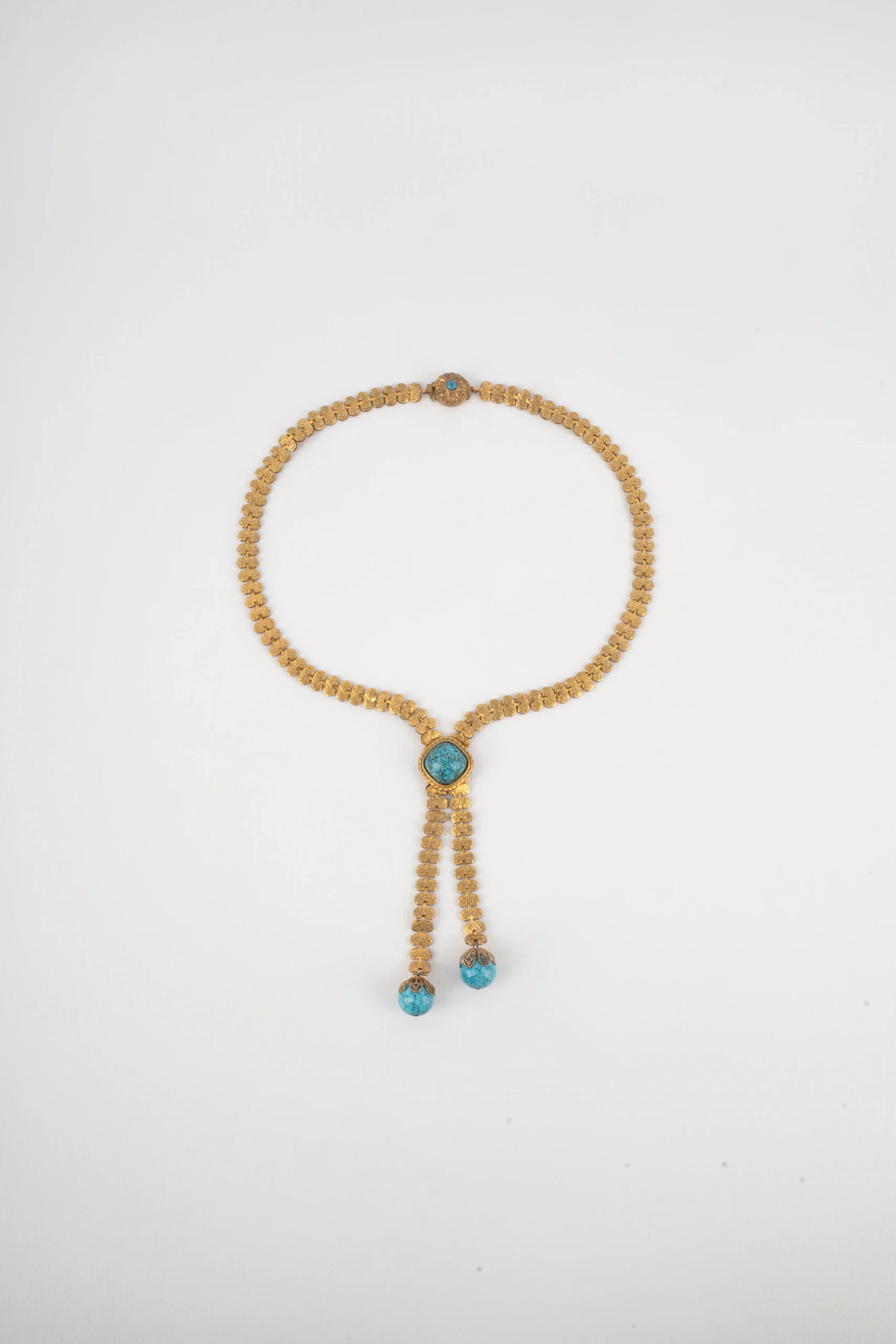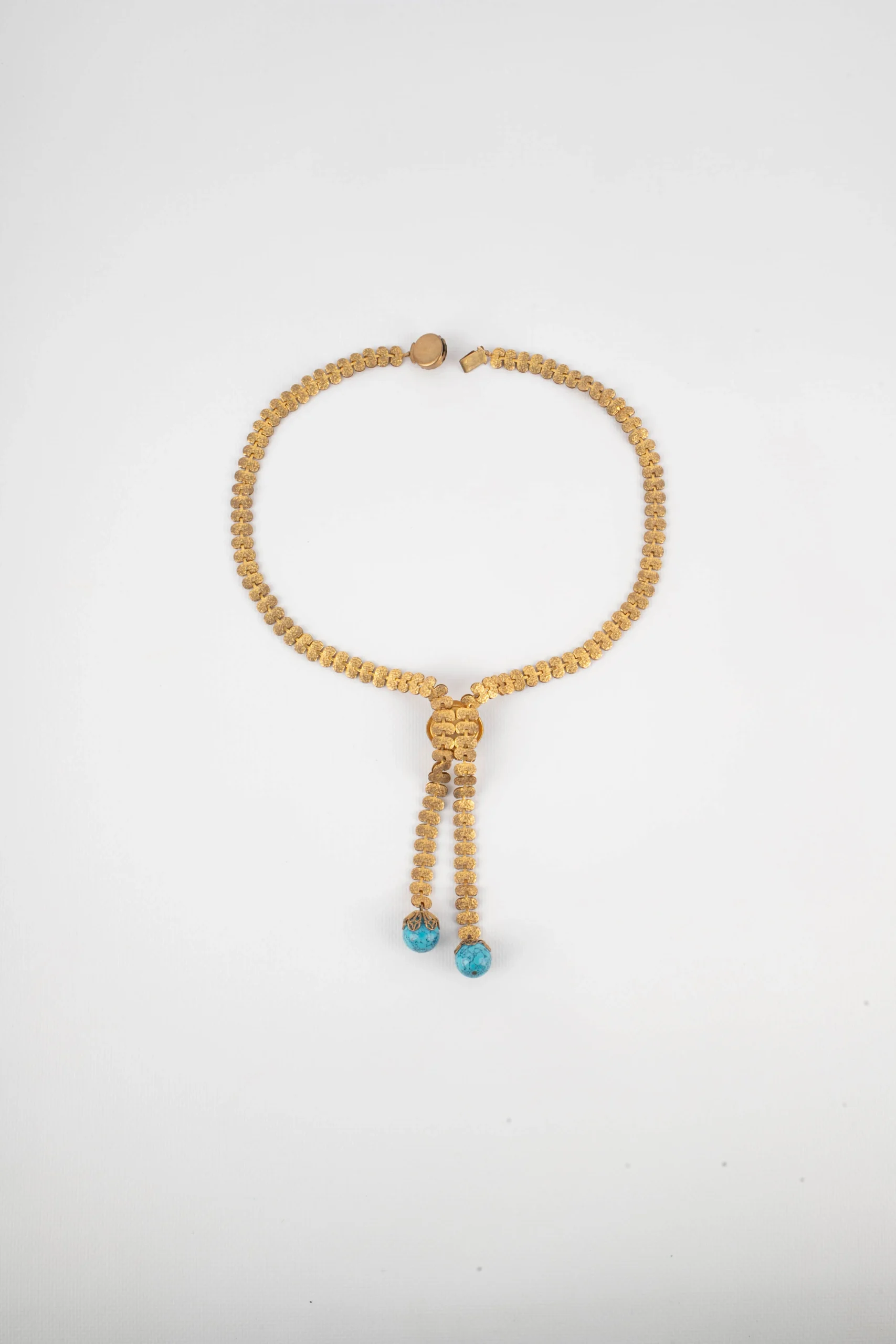 ANONYME – Collier en métal doré et perles bleues.