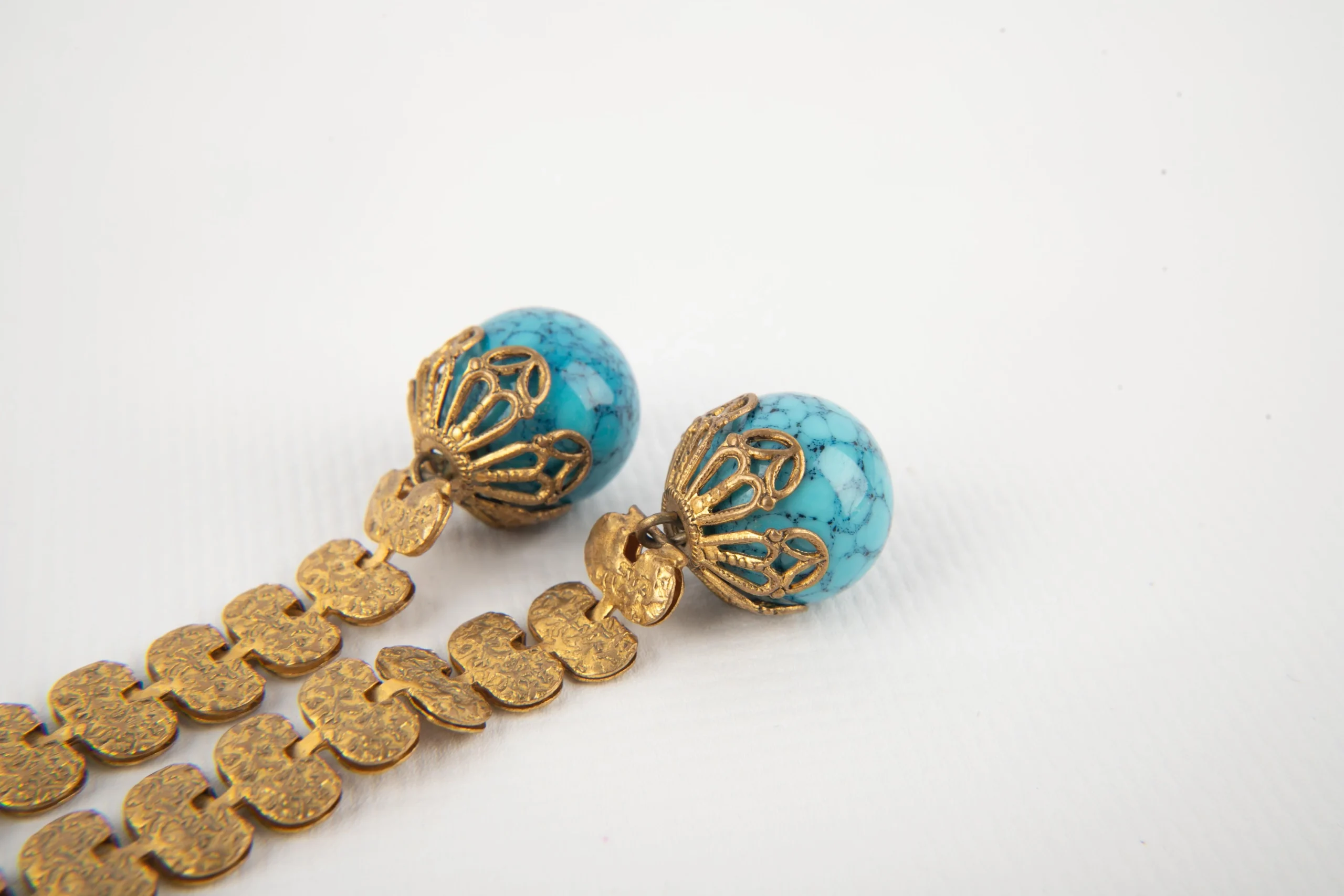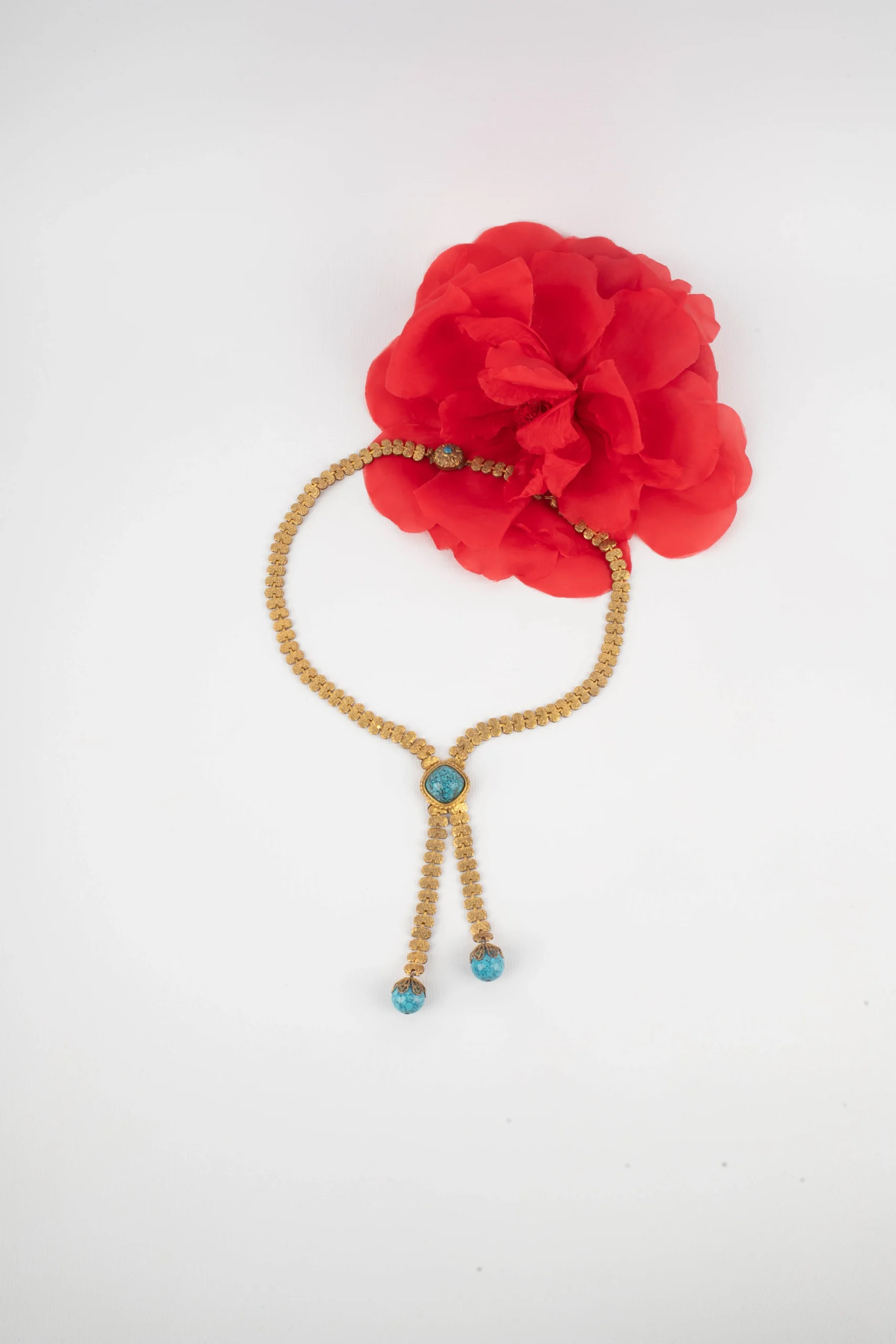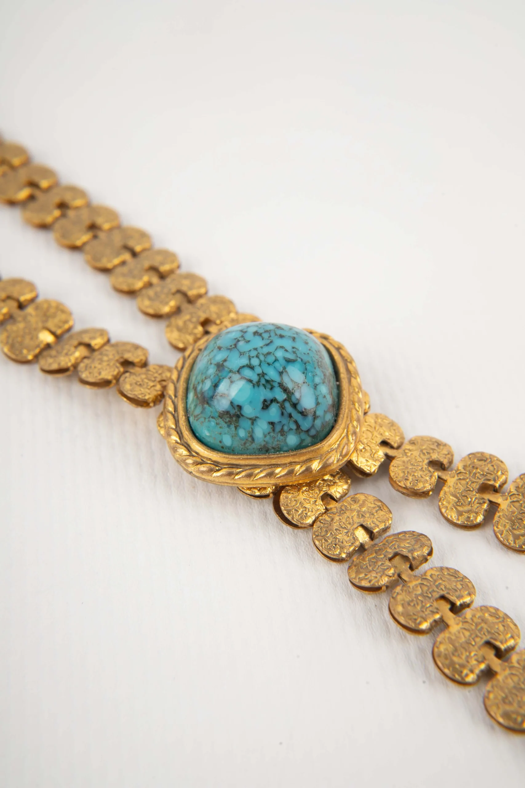 ANONYME – Collier en métal doré et perles bleues.