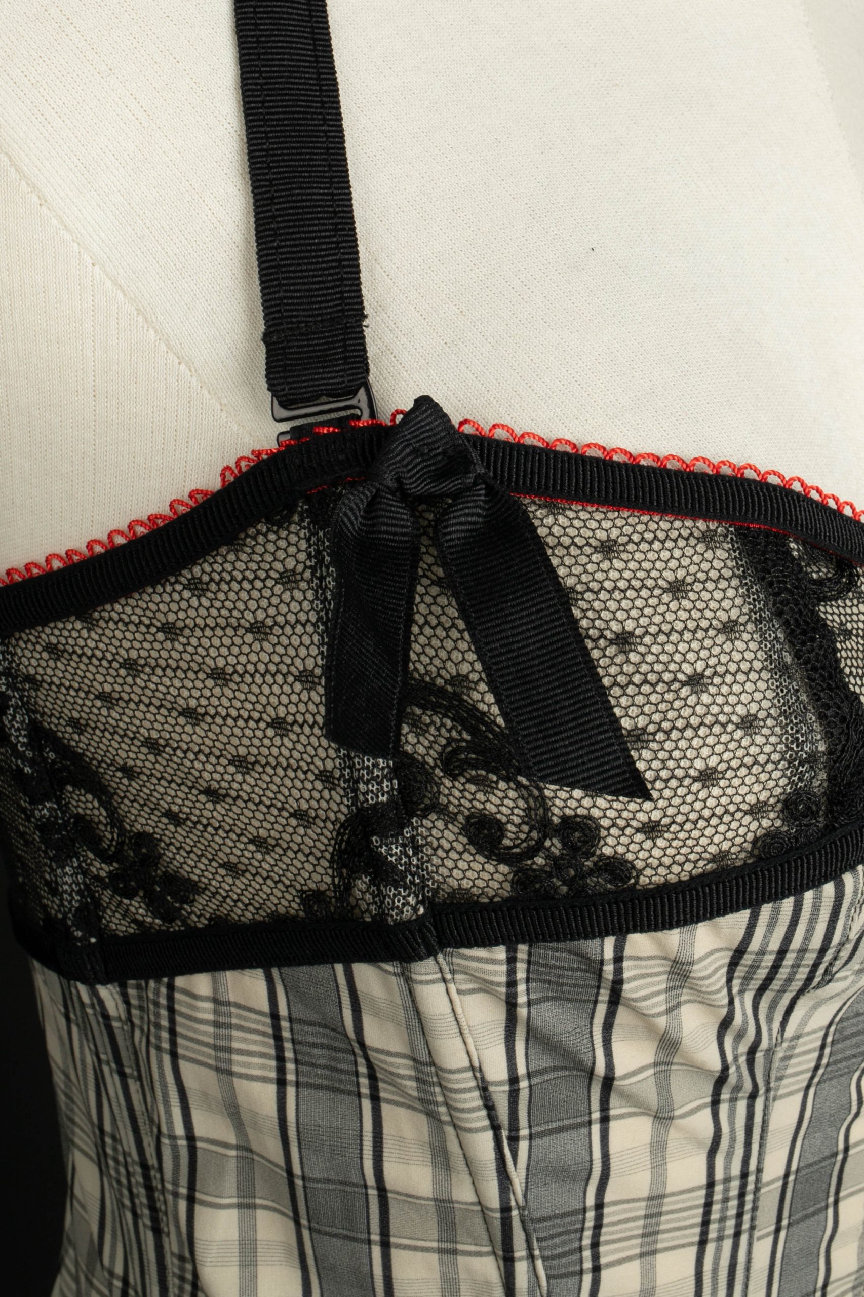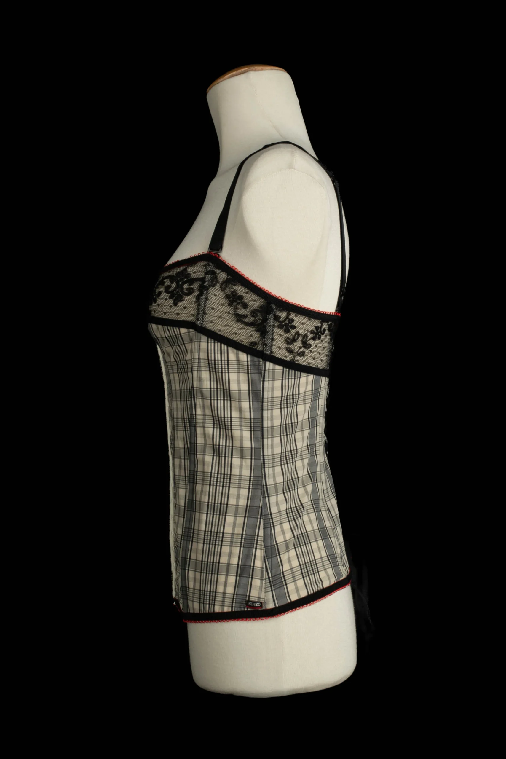 KENZO -Corset en tissu à motif tartan dans les tons de beige et de gris rehaussé de dentelle noir. Etiquette de taille absente, il convient à un taille S. Collection circa 2000 sous la direction artistique de Gilles Rosier.