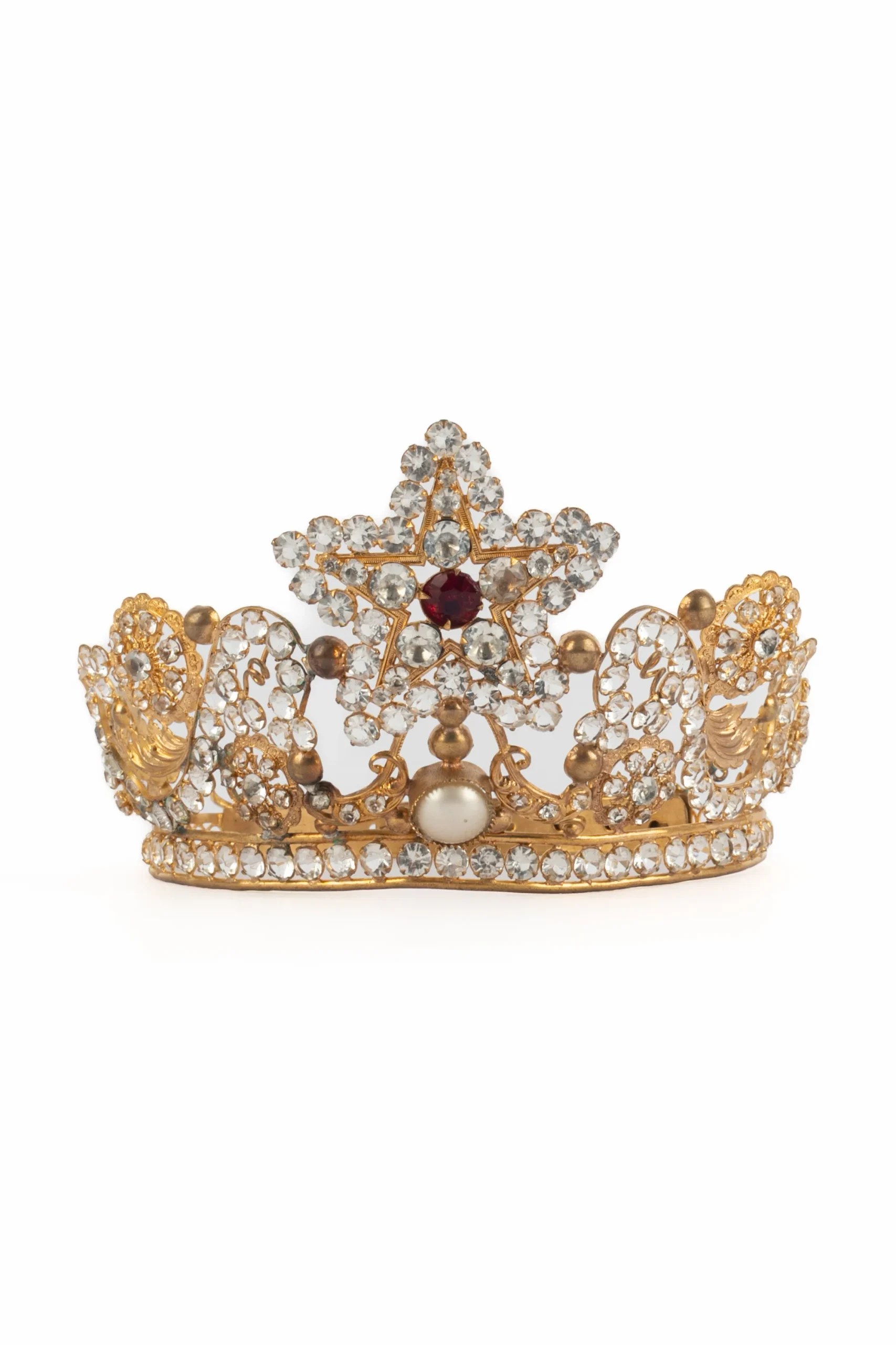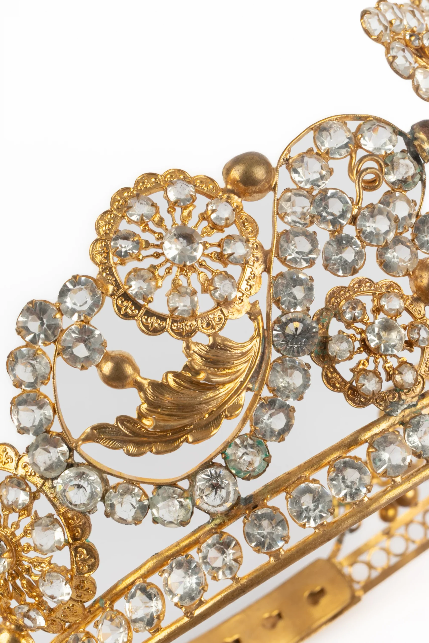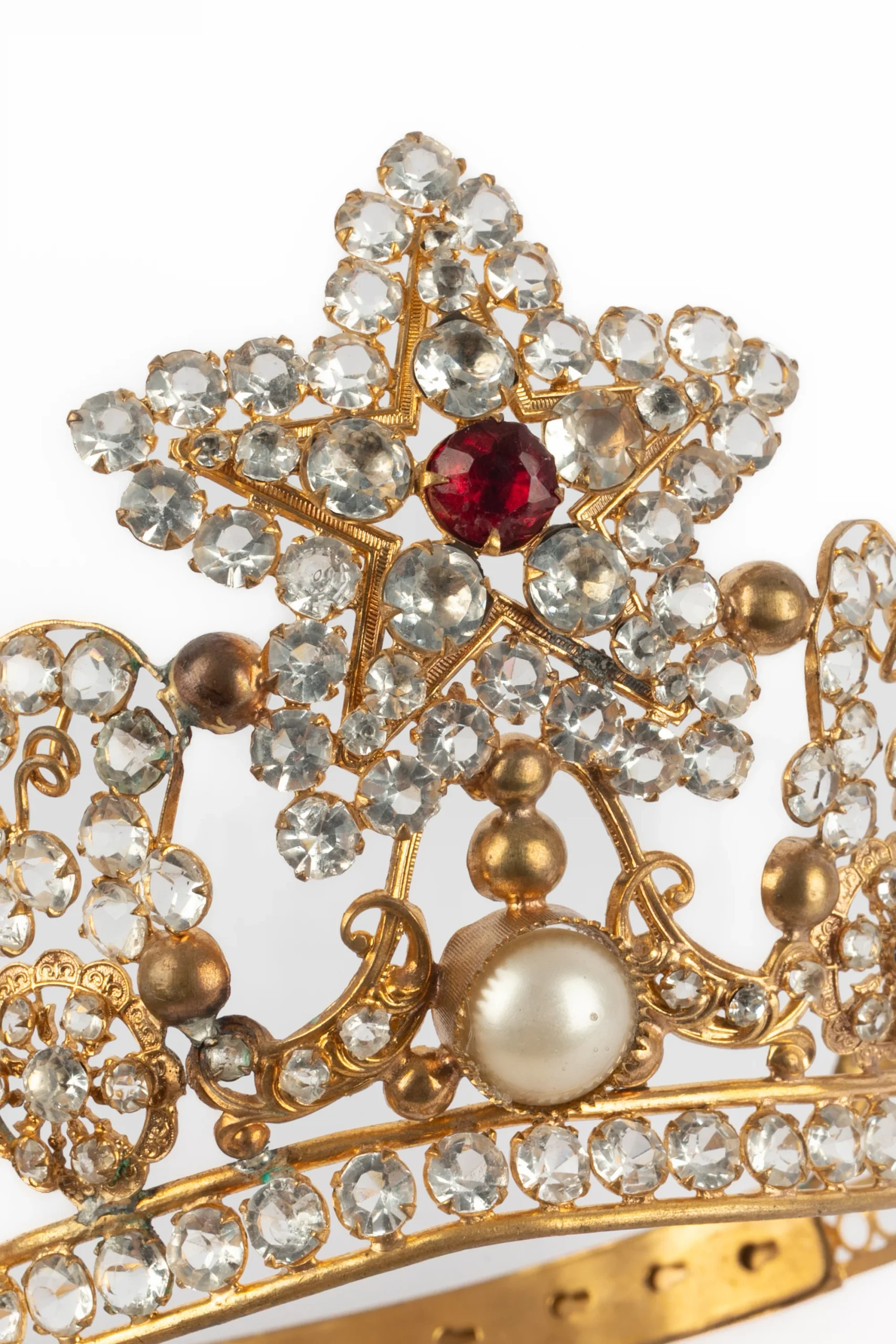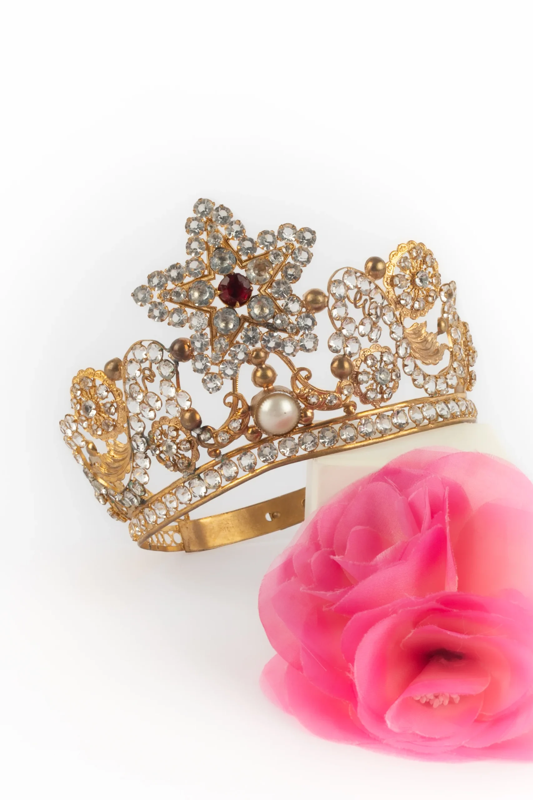 THÉÂTRE – Couronne de théâtre en métal doré, strass et cabochon nacré. Accessoire datant des années 1930.
