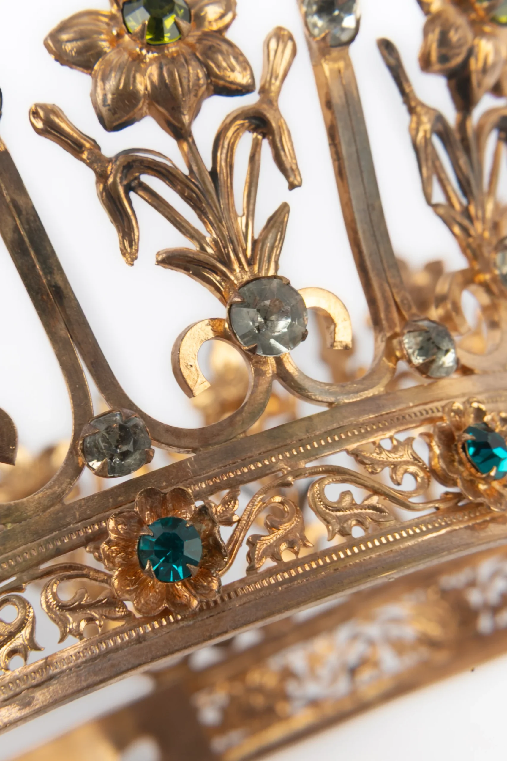 THÉÂTRE – (Made in France) Couronne en métal doré et strass colorés. Circonférence réglable. Accessoire datant des années 1920-1930.