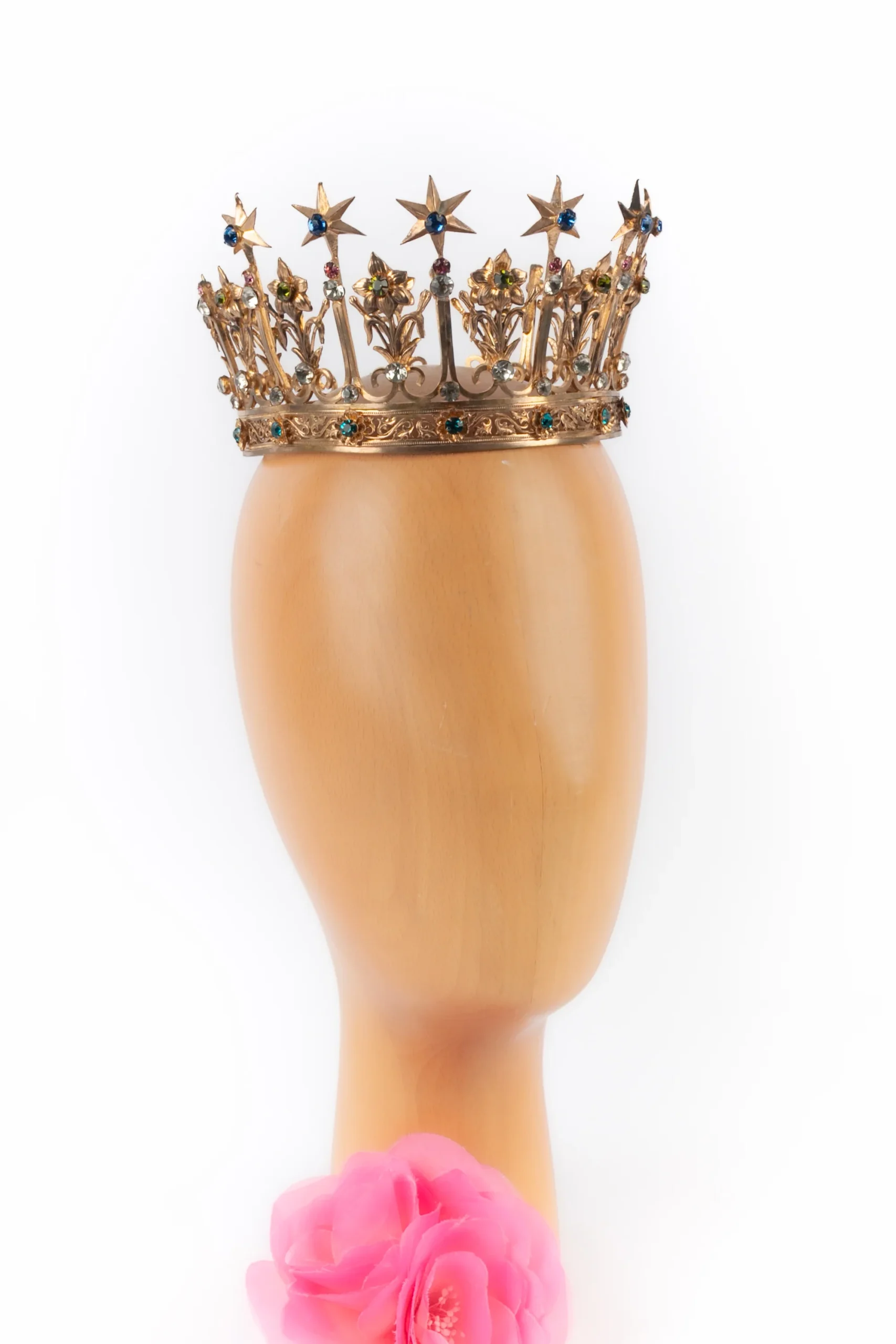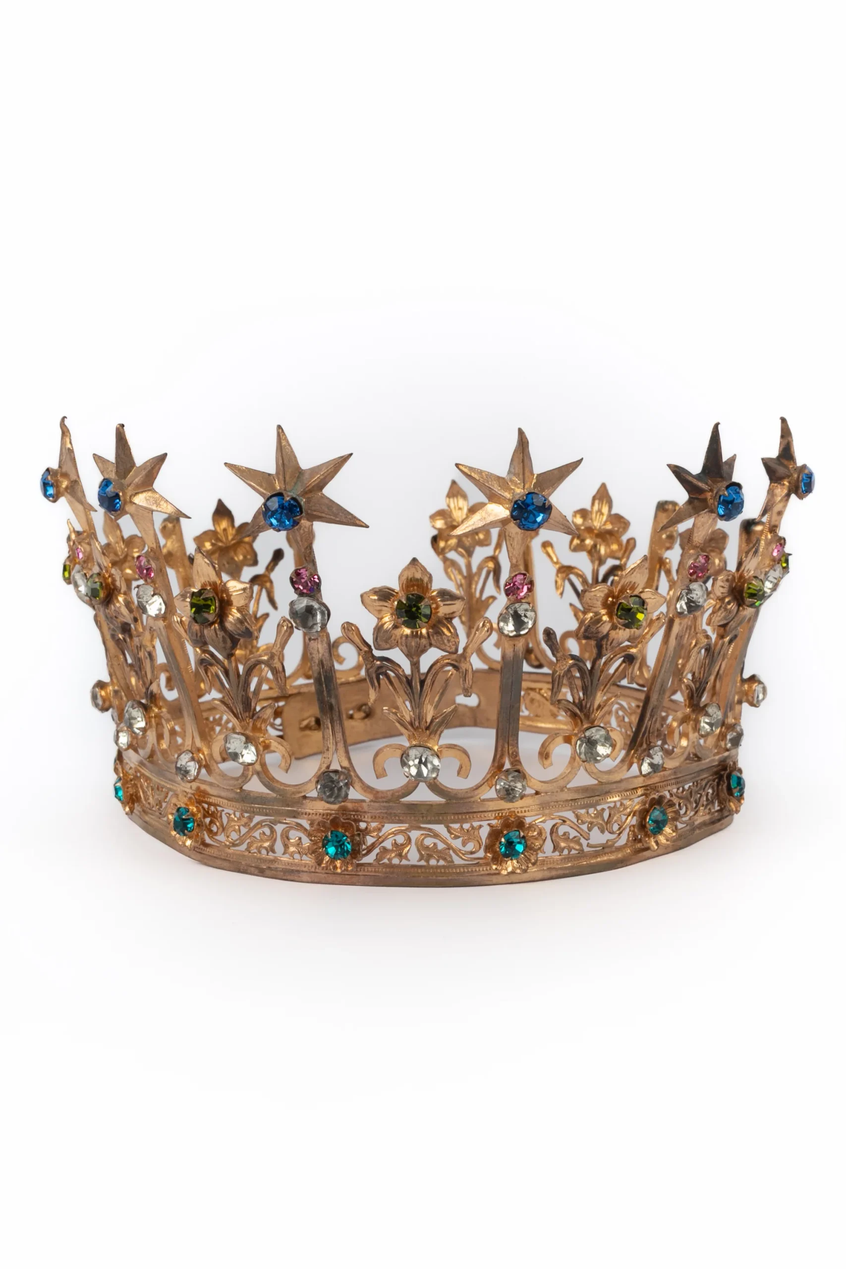 THÉÂTRE – (Made in France) Couronne en métal doré et strass colorés. Circonférence réglable. Accessoire datant des années 1920-1930. Condition : Bon état Dimensions : Circonférence : 30 cm