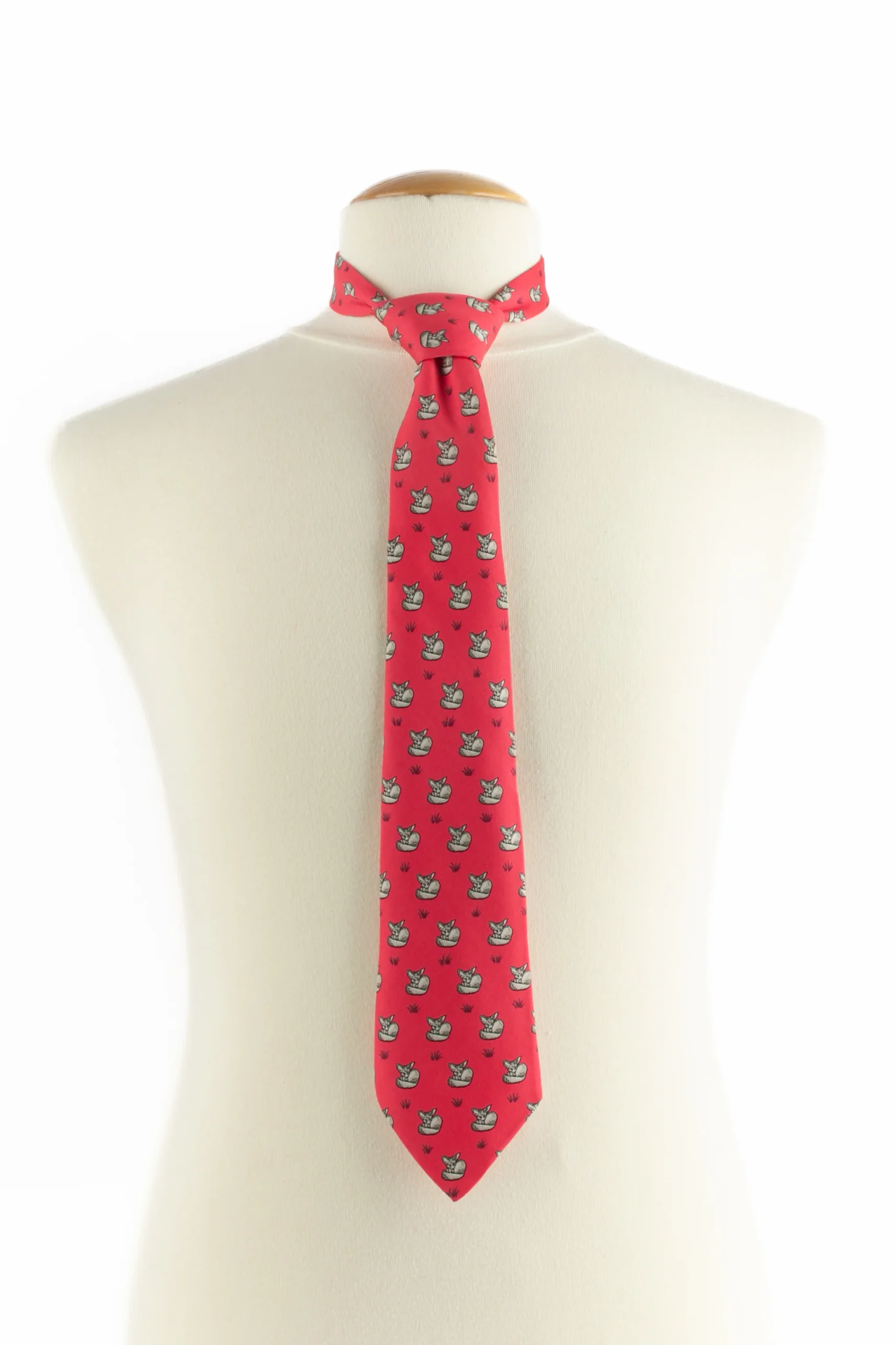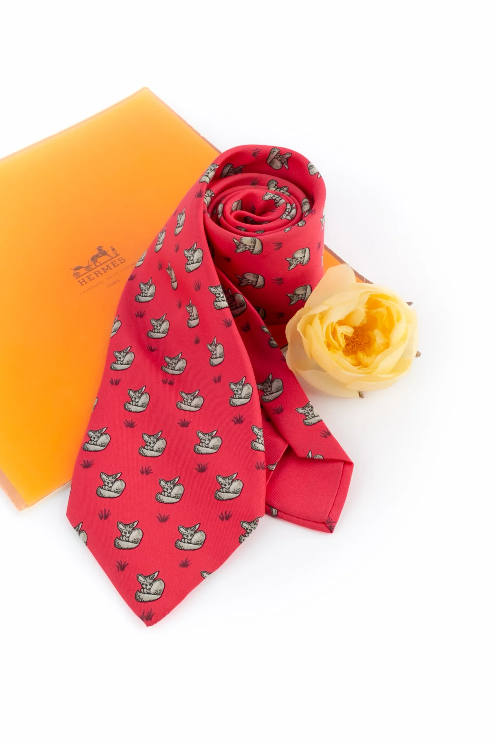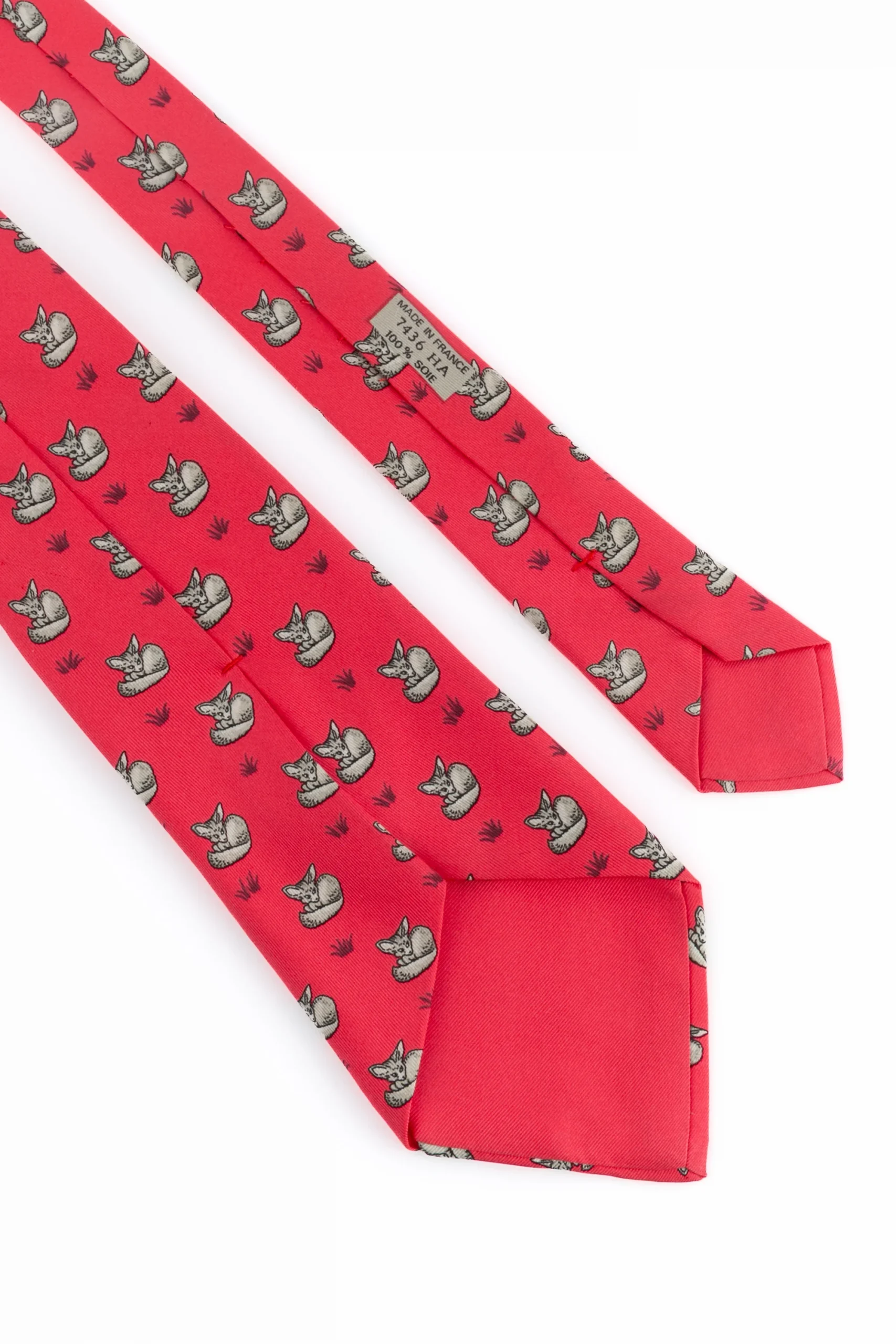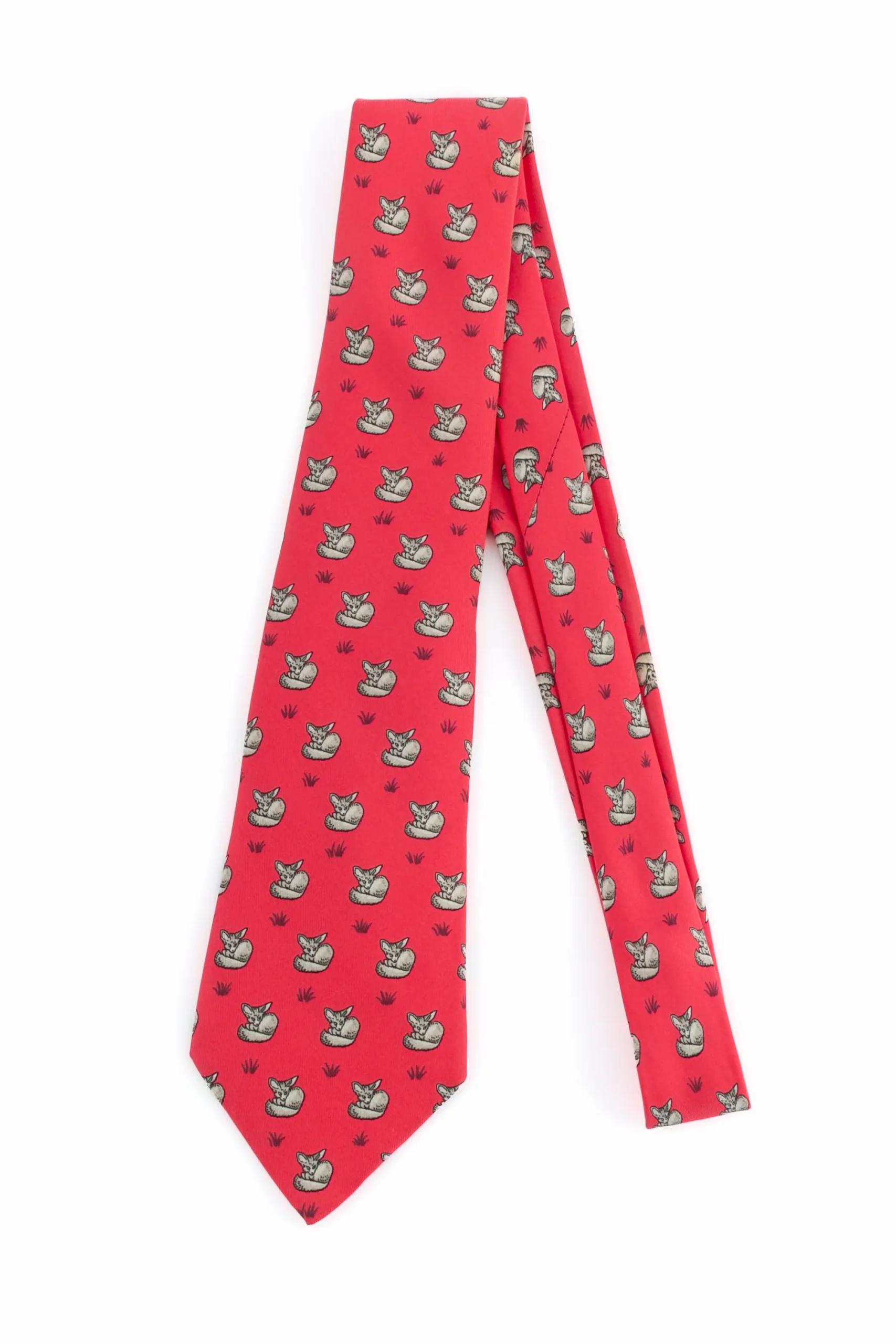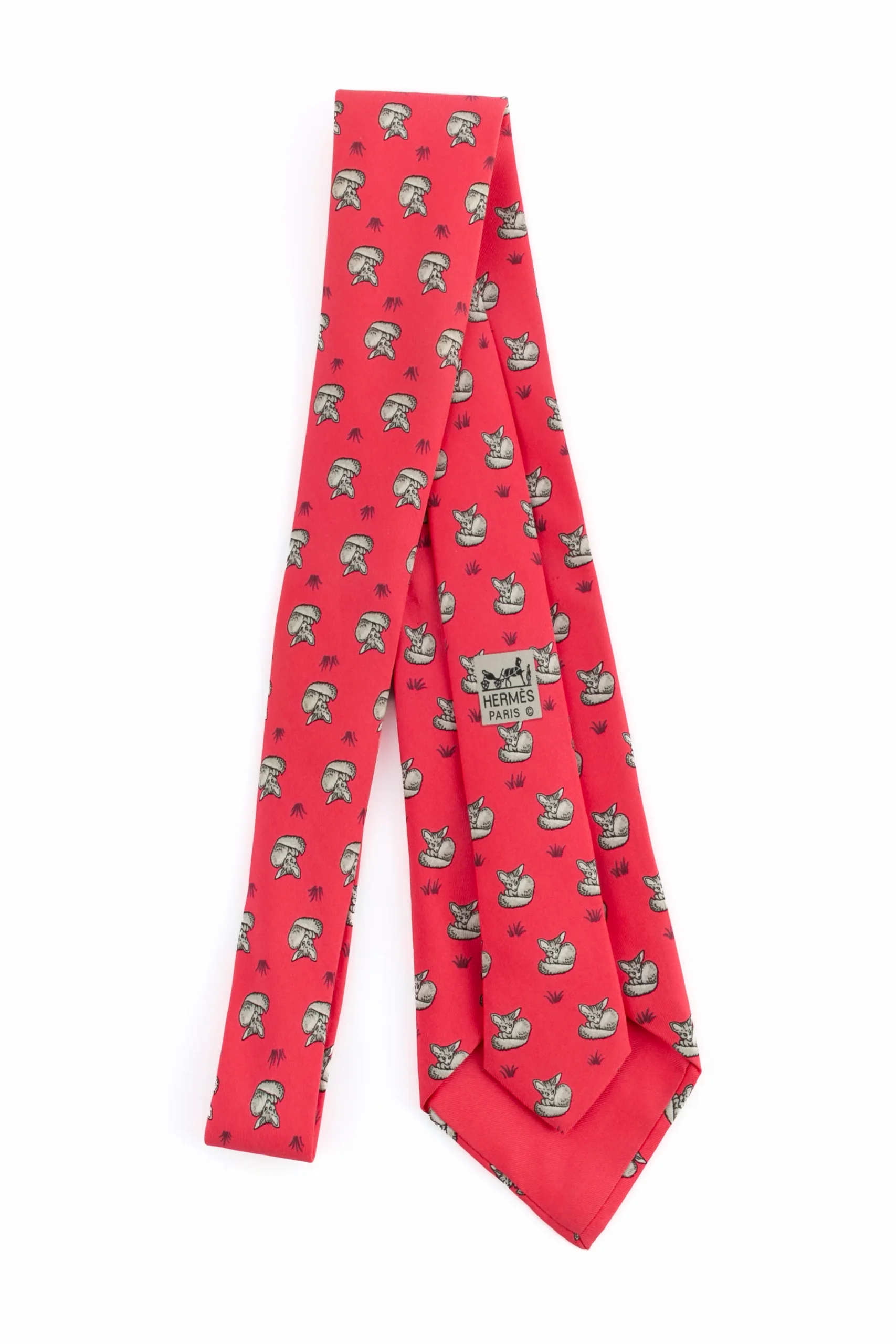 HERMÈS – (Made in France) Cravate en soie rouge/rose figurant des fennecs. Etiquette de marque décousue.