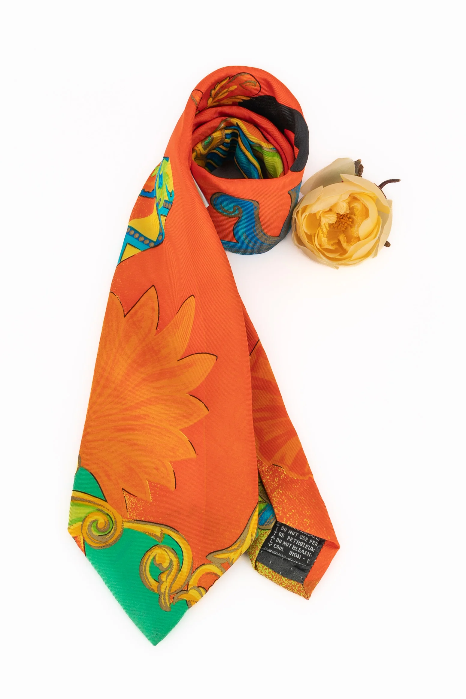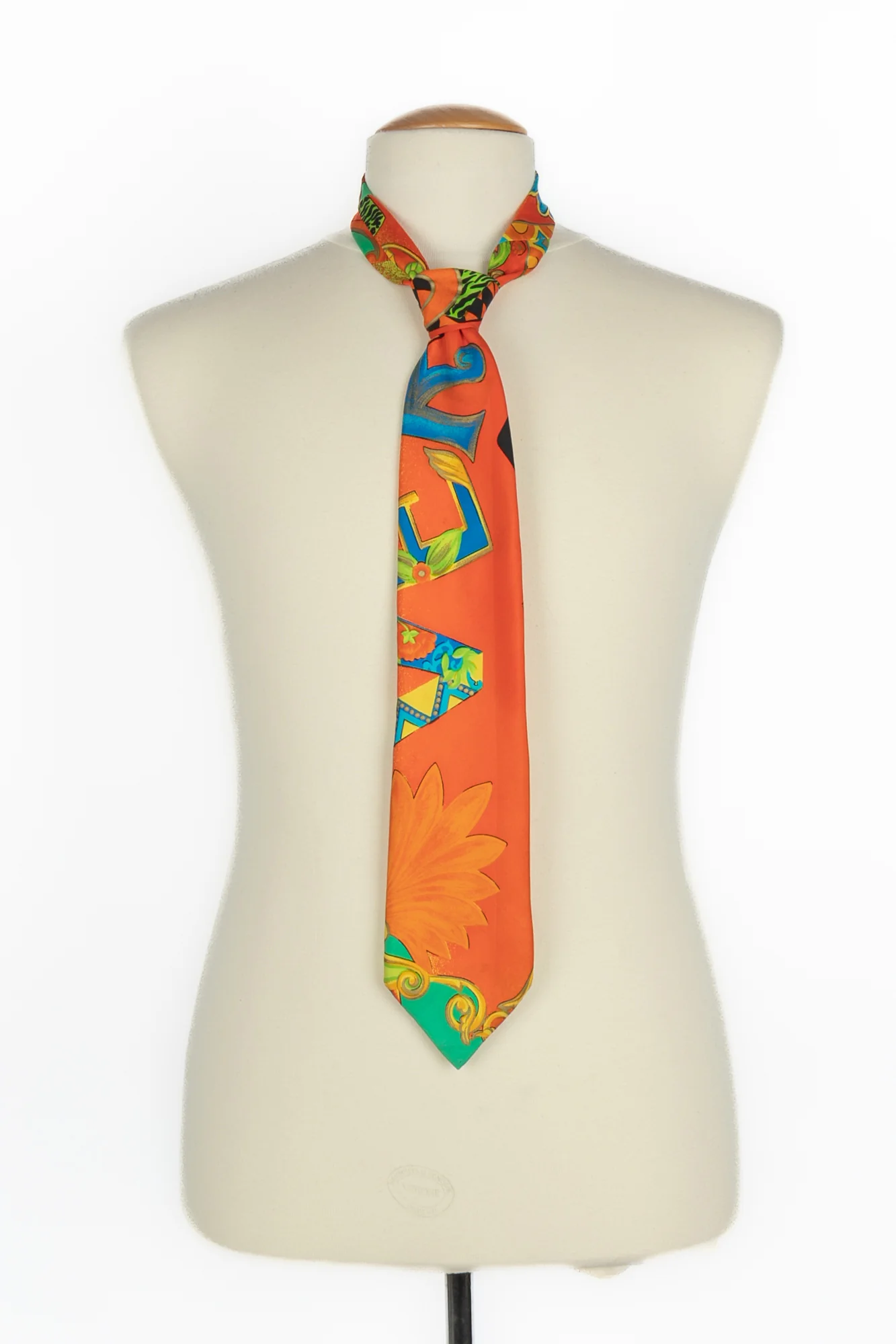 VERSACE – (Made in Italy) Cravate en soie orange. Condition : Très bon état Dimensions : Largeur : 9,5 cm