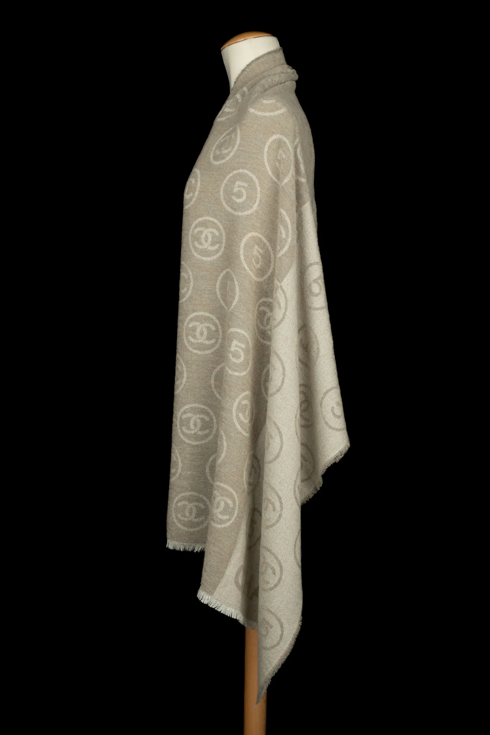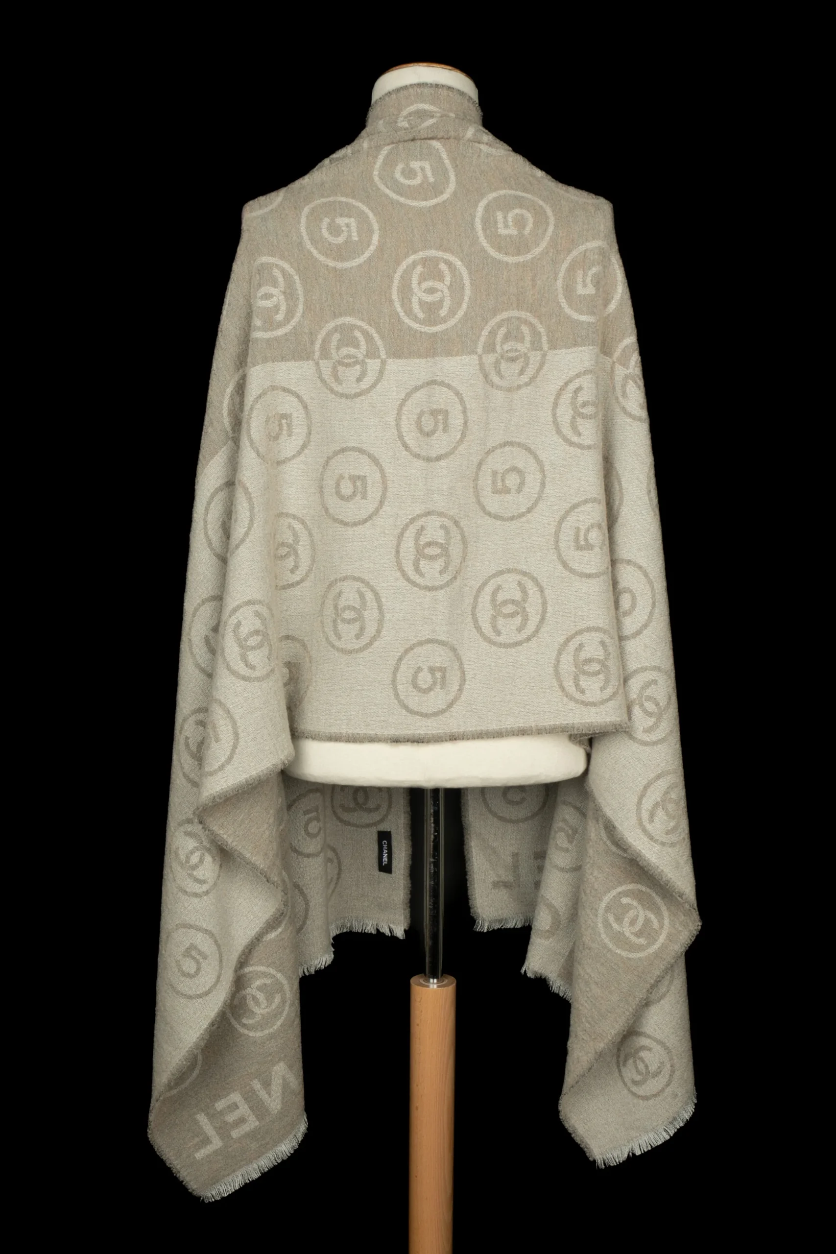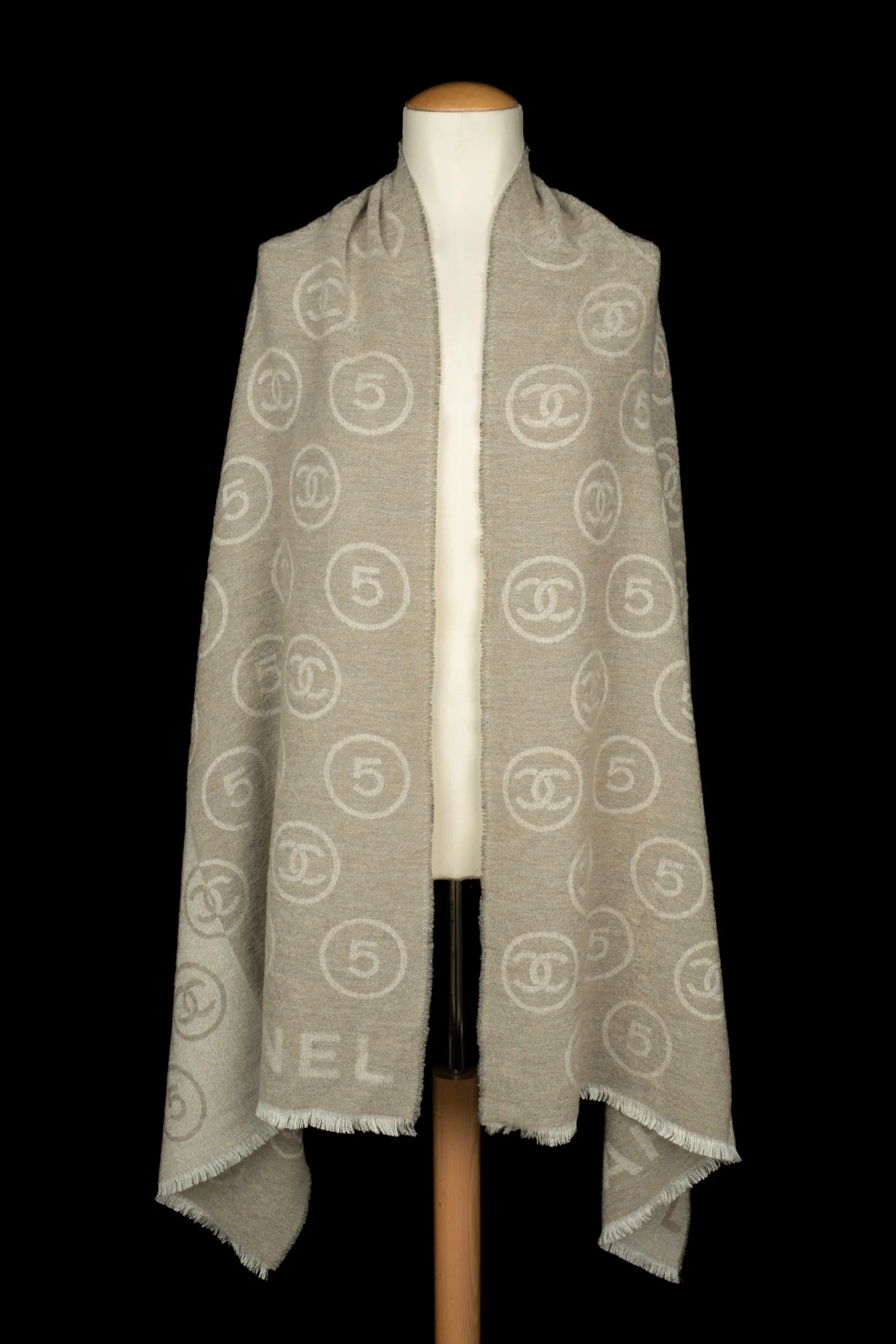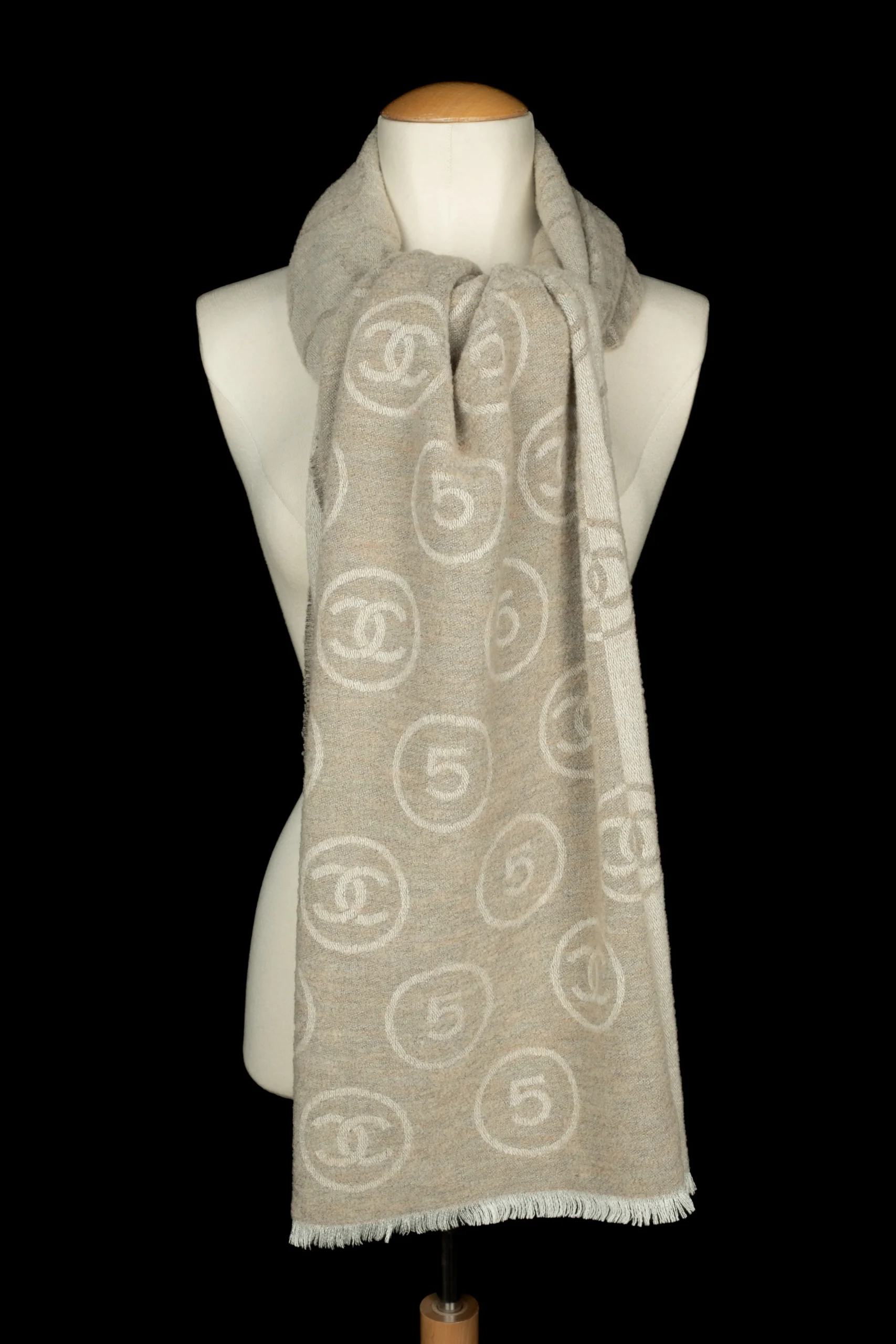 CHANEL – Écharpe en laine mélangée dans les tons de beige et de blanc décorée de numéros 5 et de multiples logos de la maison de couture.