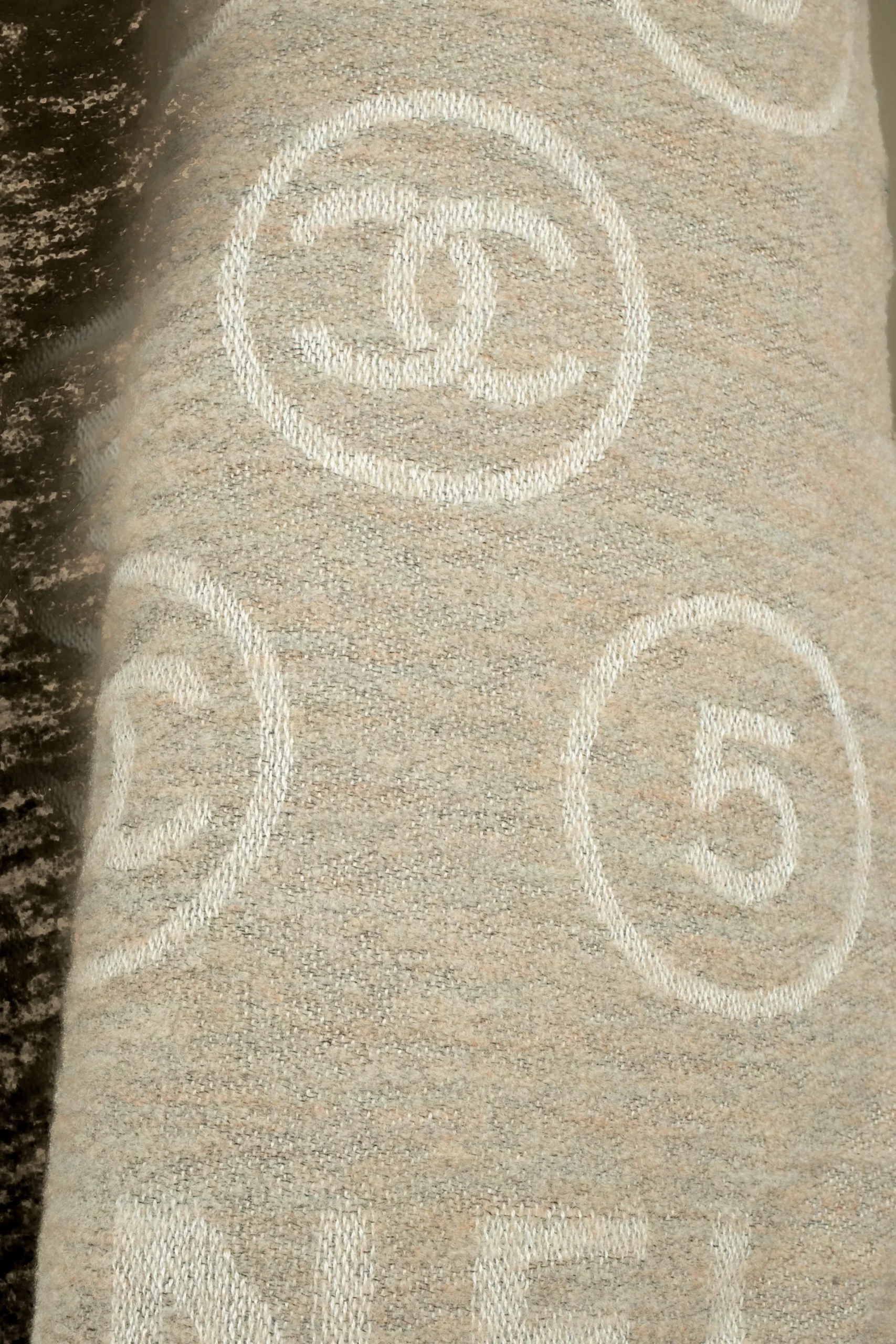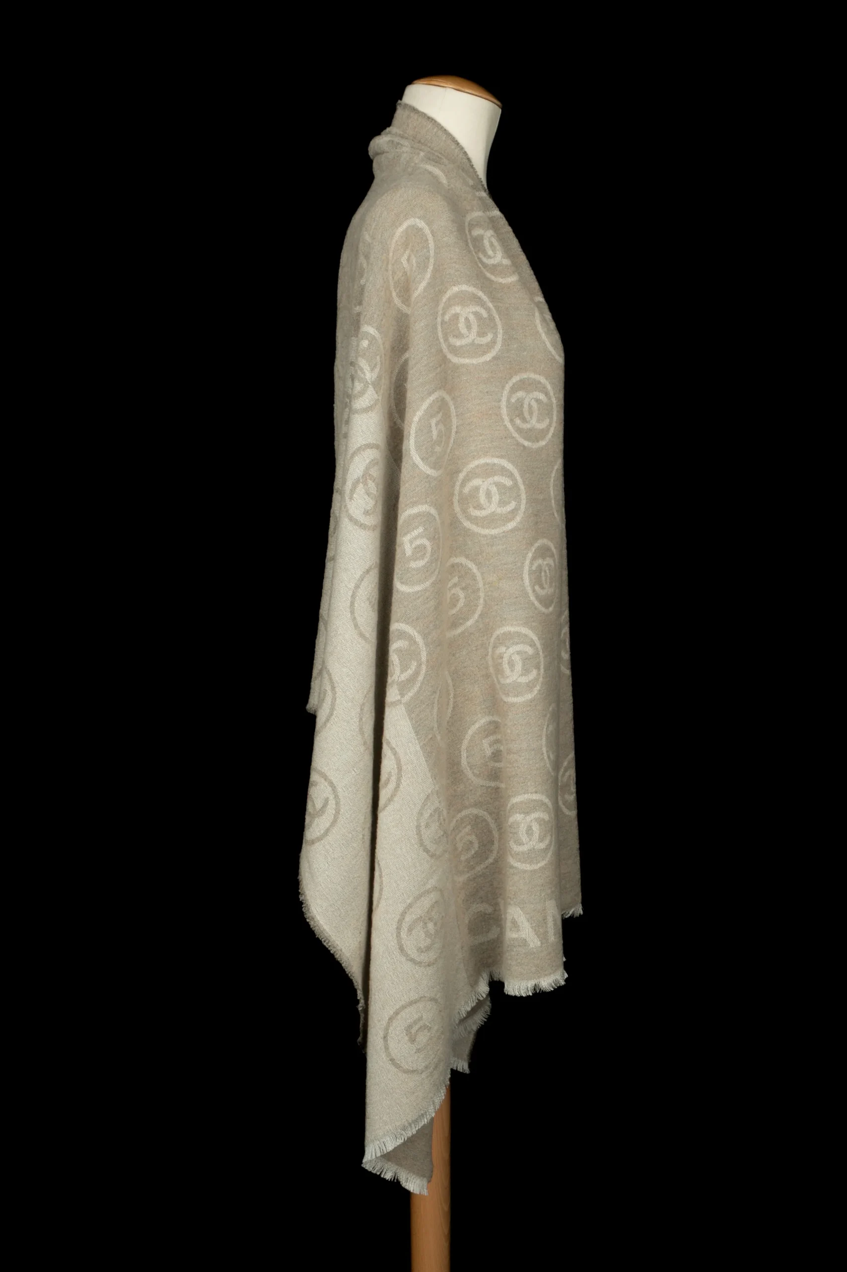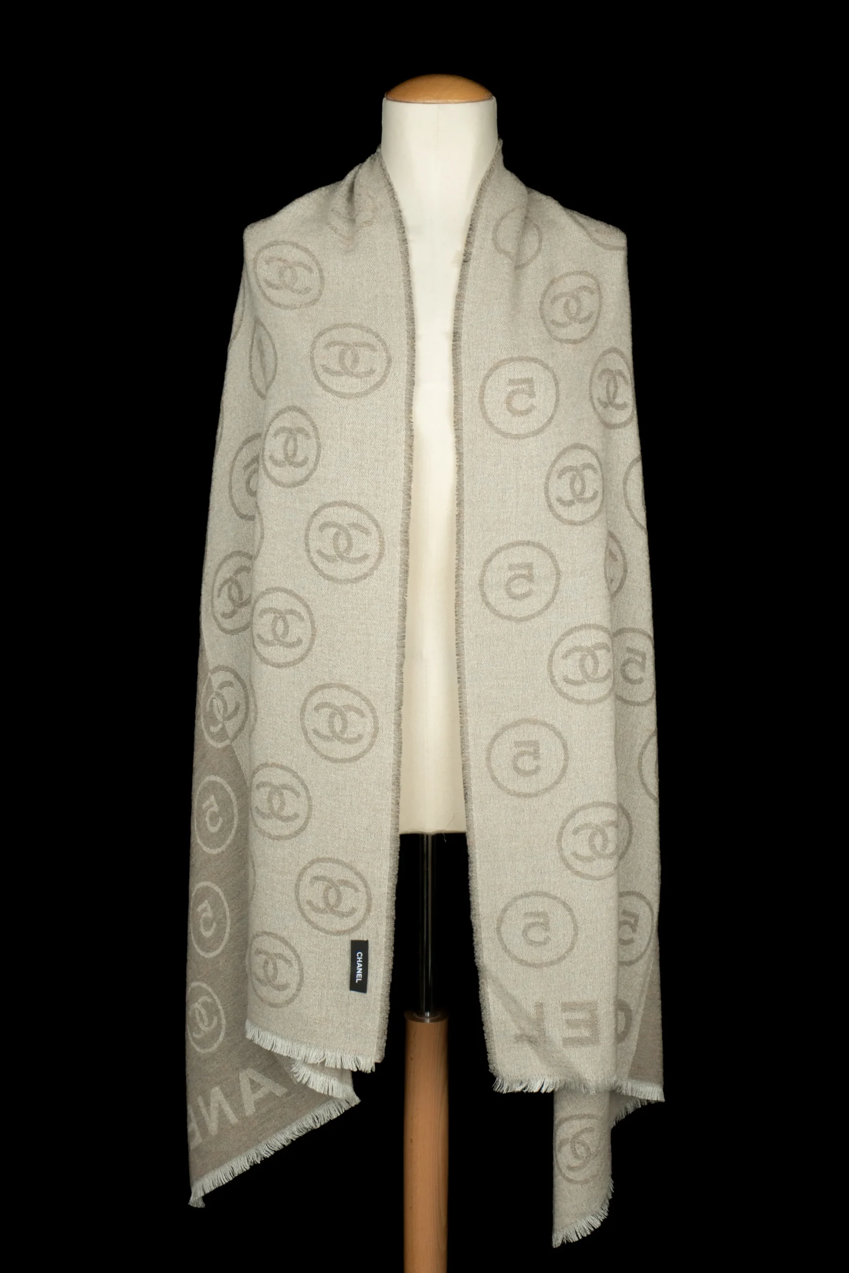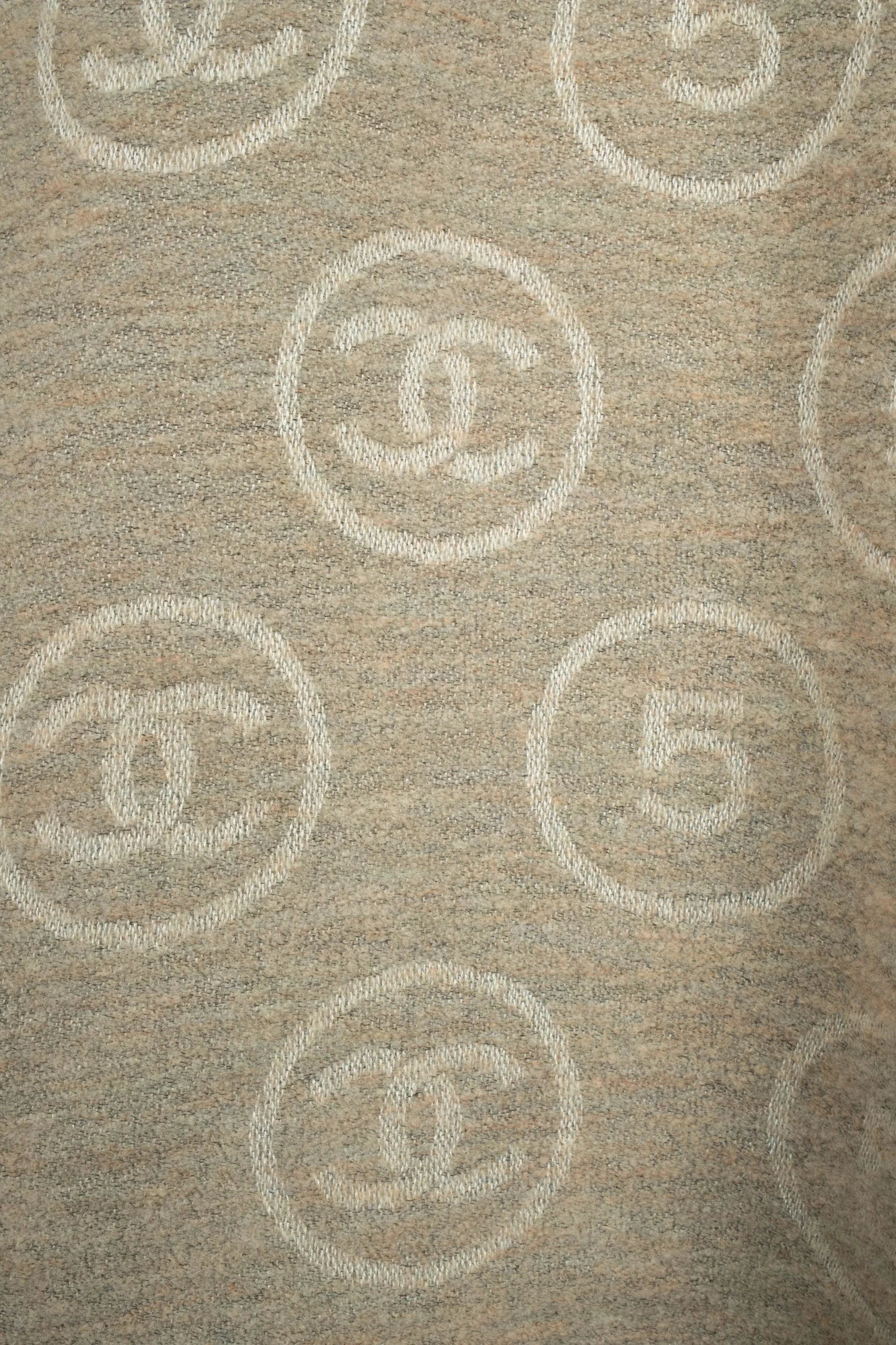CHANEL – Écharpe en laine mélangée dans les tons de beige et de blanc décorée de numéros 5 et de multiples logos de la maison de couture.