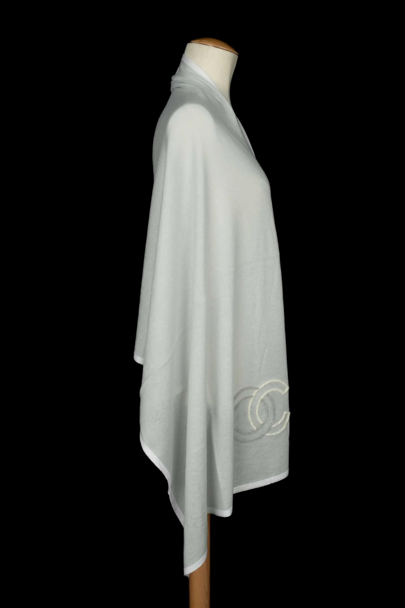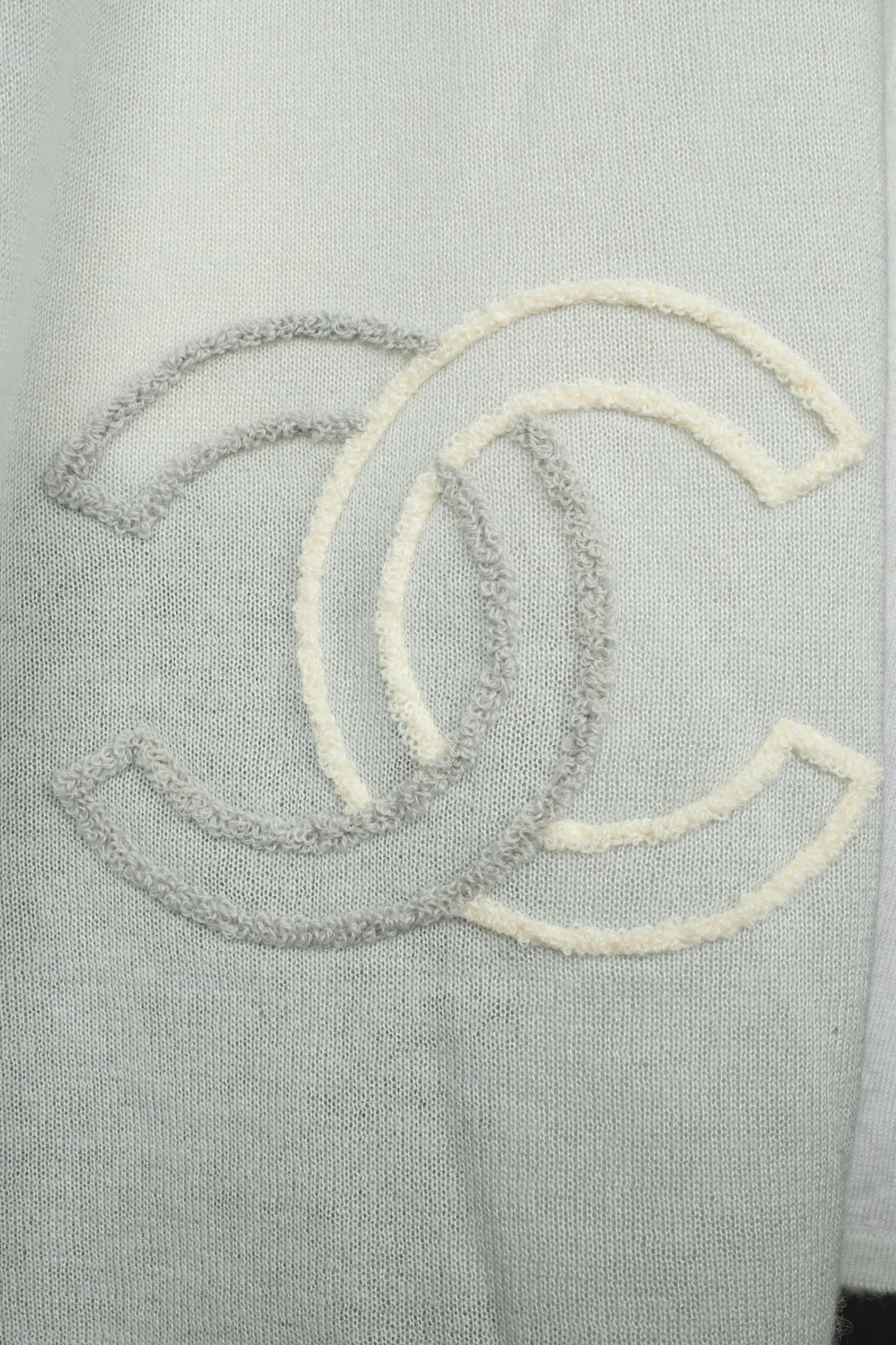 CHANEL – Écharpe en cachemire bicolore bleu pastel et beige décorée du logo de la maison.