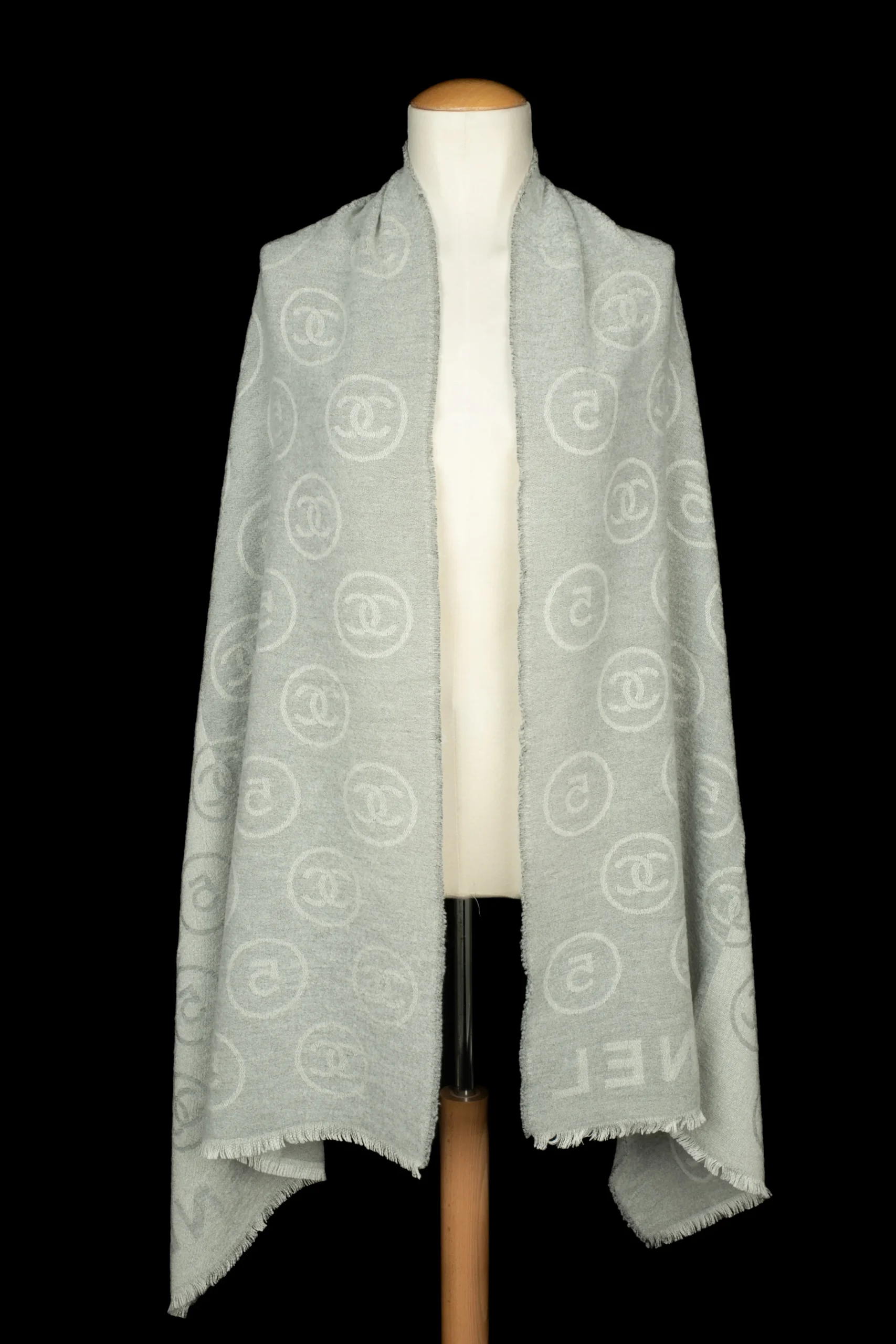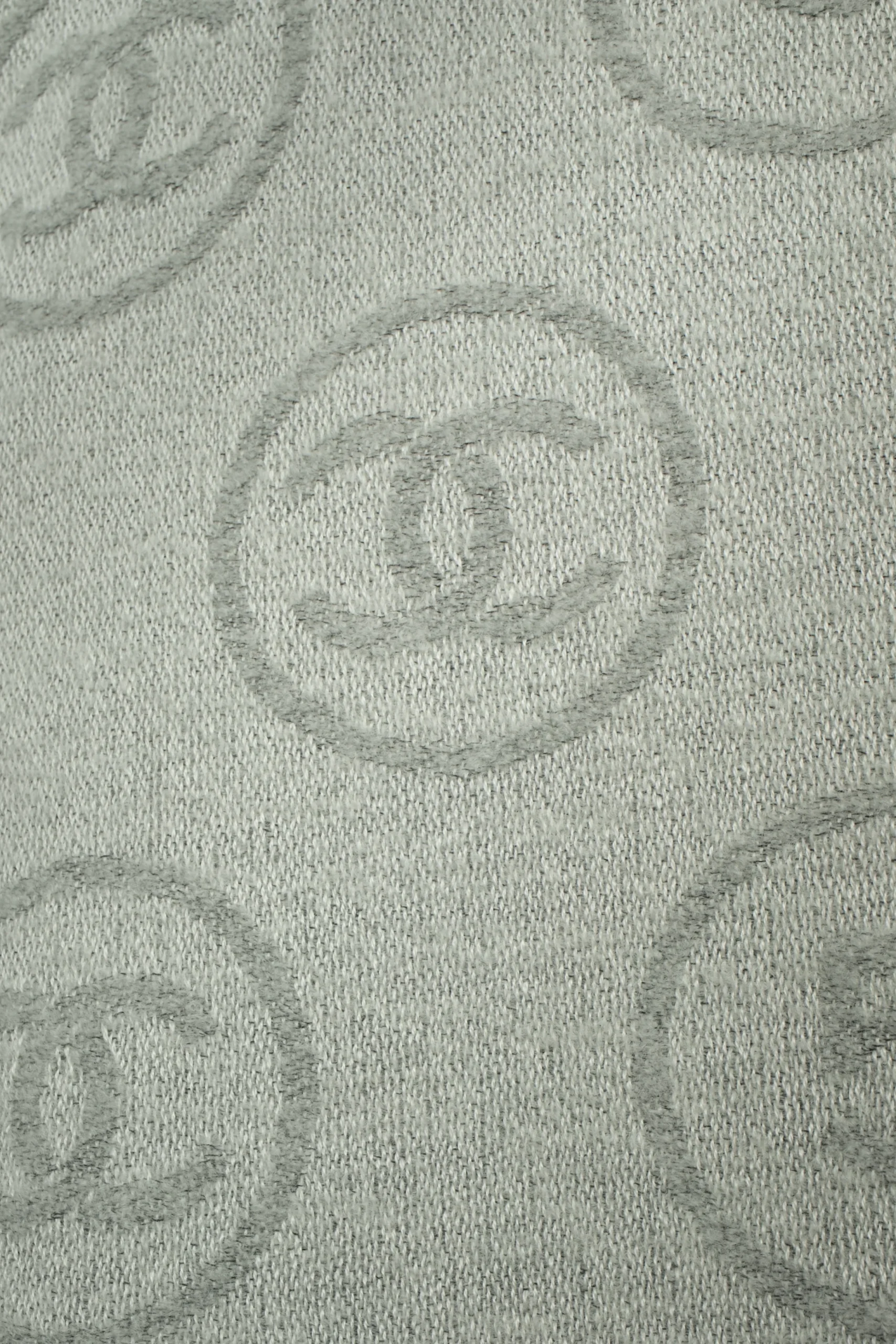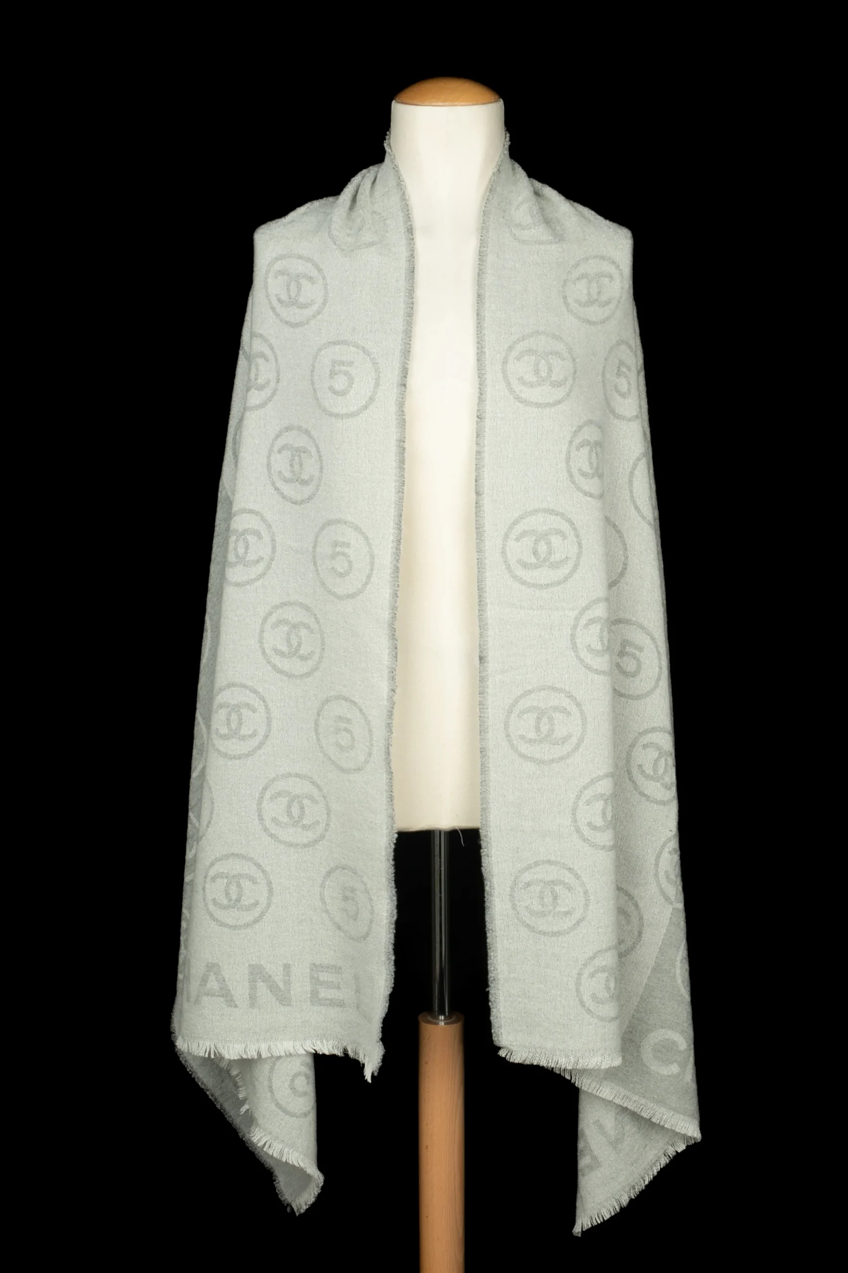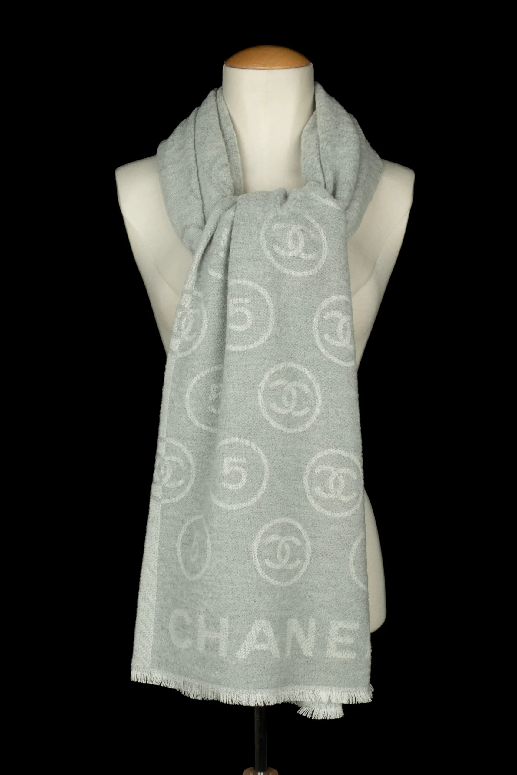 CHANEL – Écharpe en laine mélangée dans les tons de gris et de blanc.