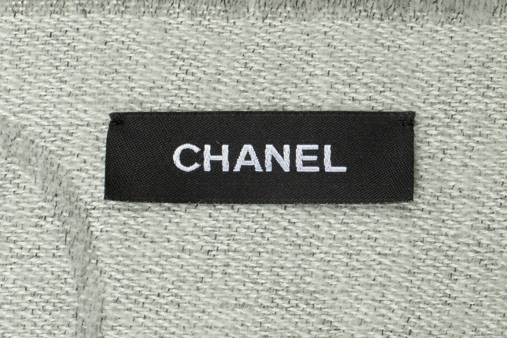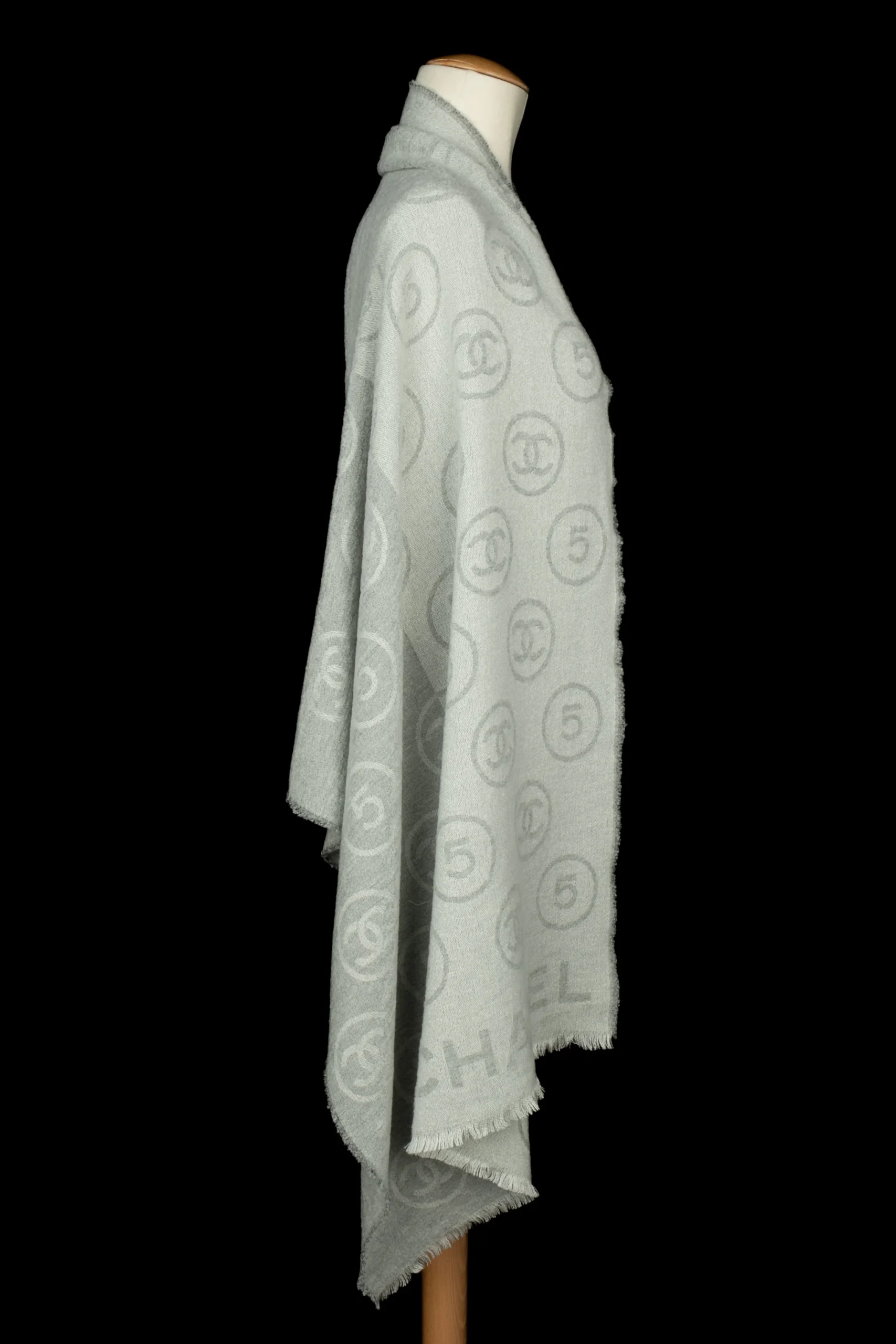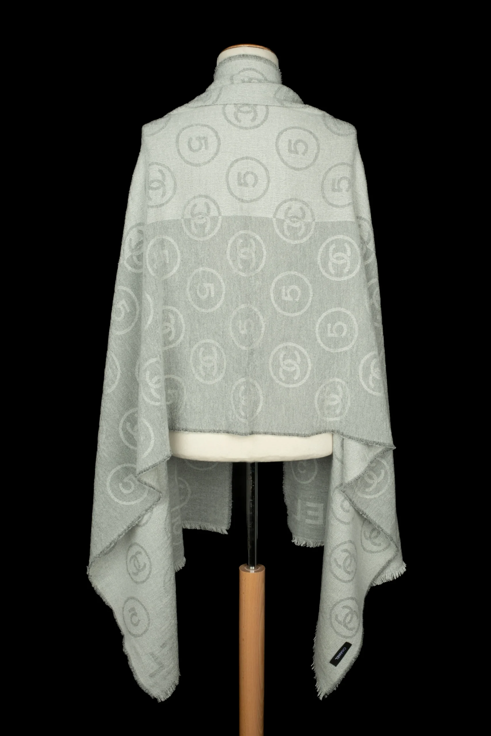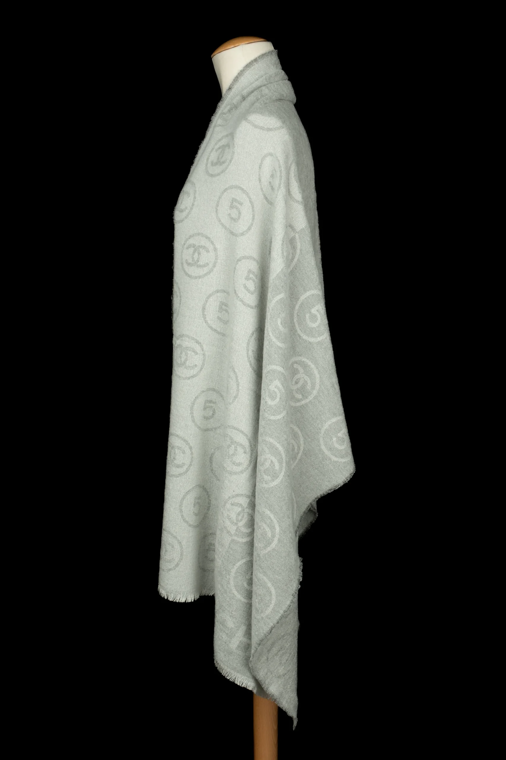 CHANEL – Écharpe en laine mélangée dans les tons de gris et de blanc.
