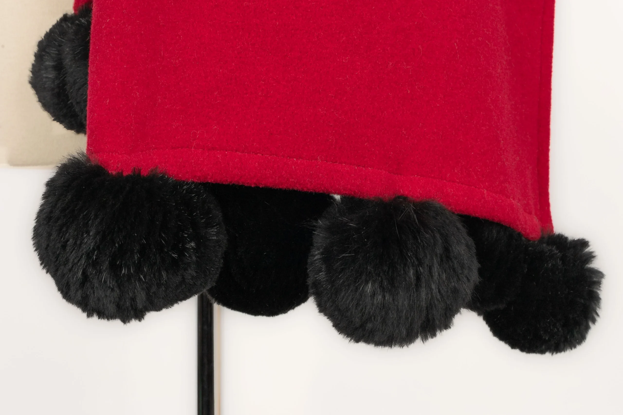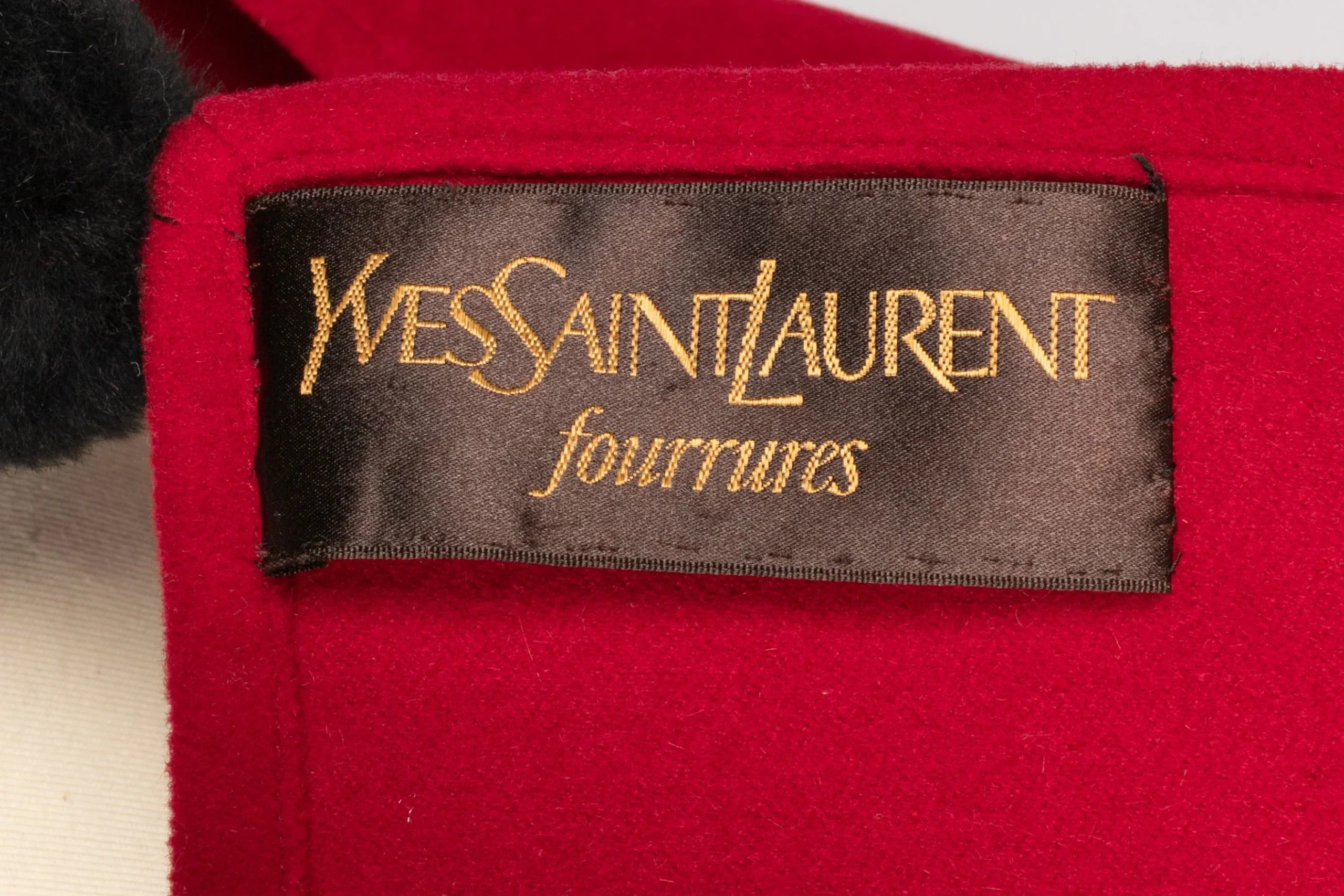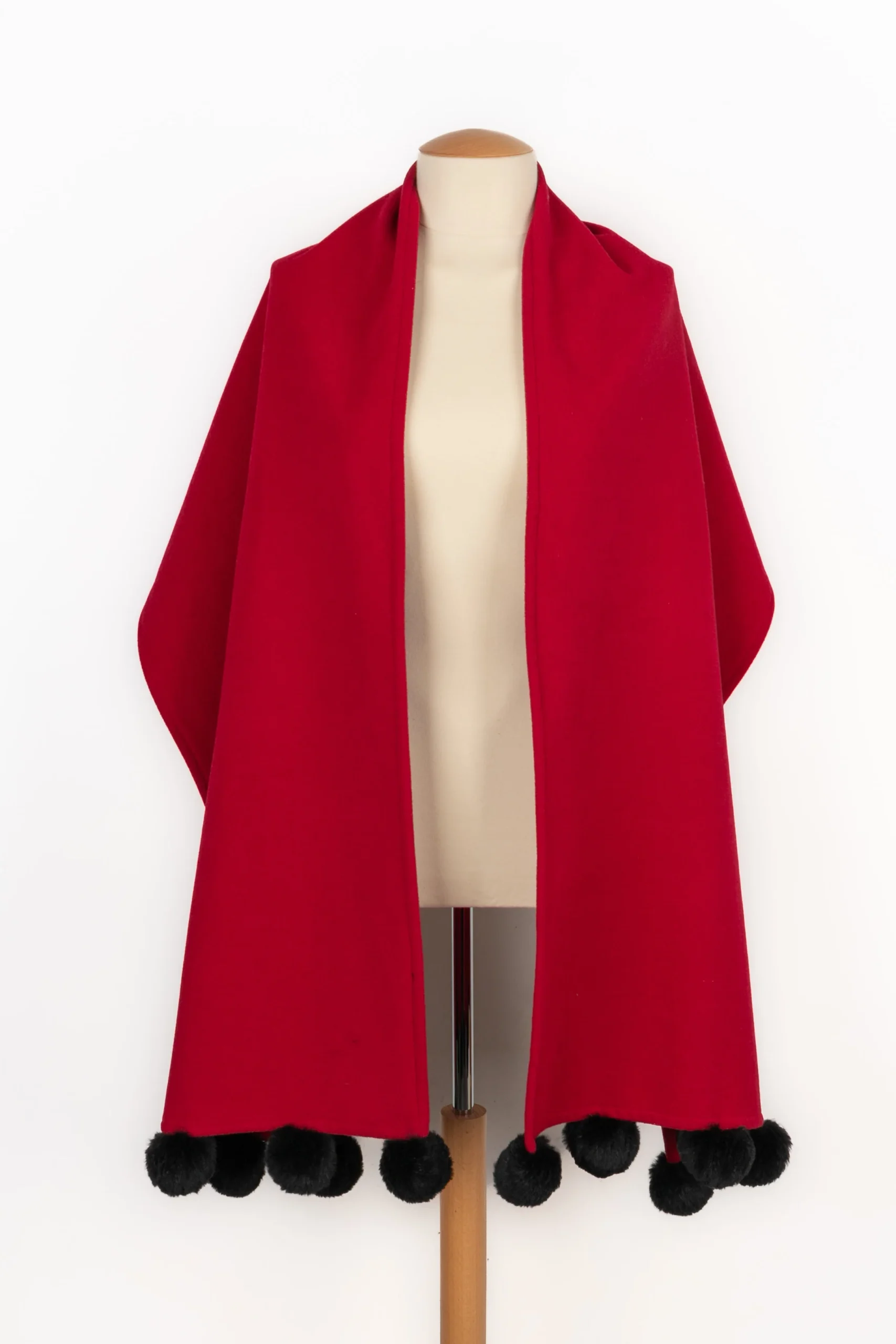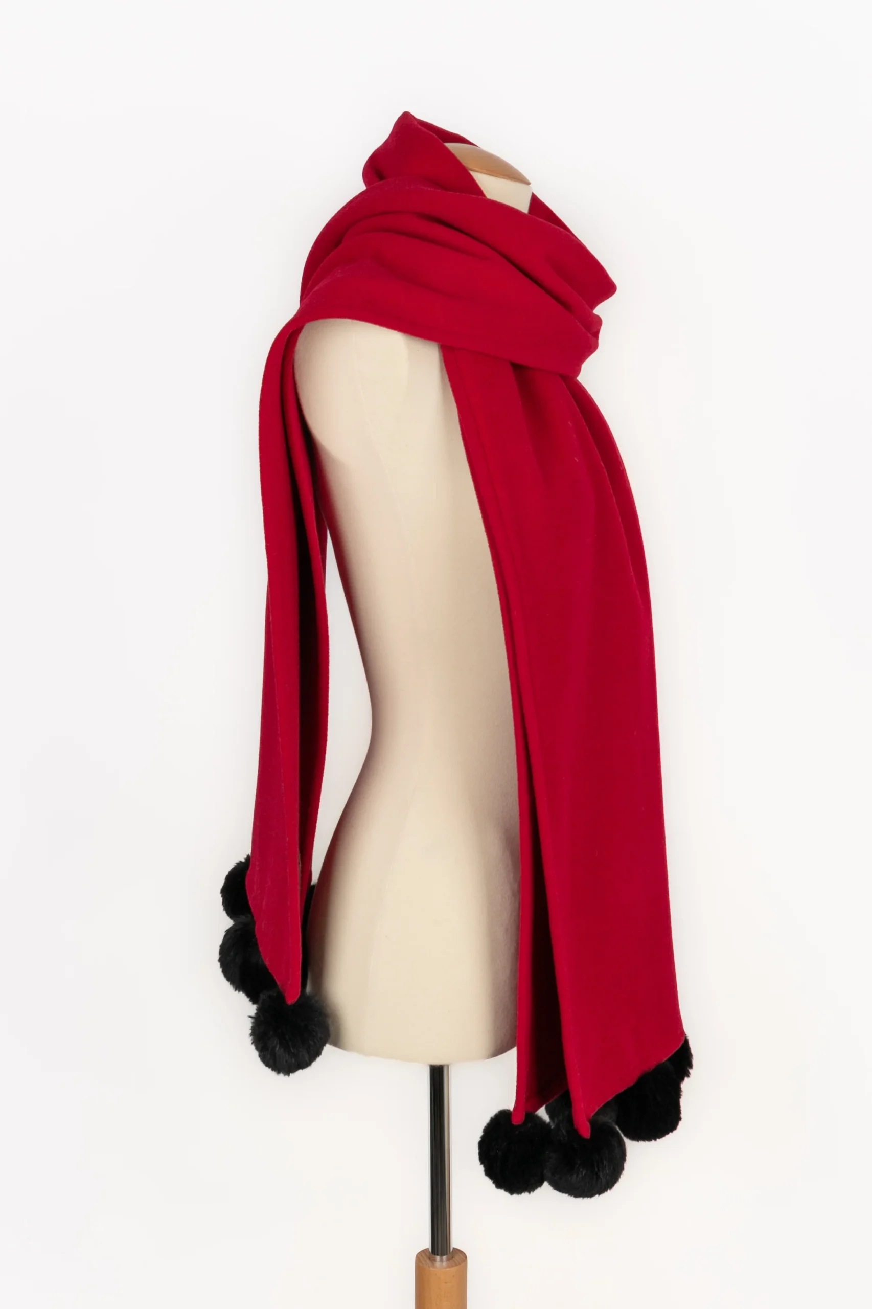 YVES SAINT LAURENT – (Made in France) Echarpe en laine rouge et pompon en fourrure noire.