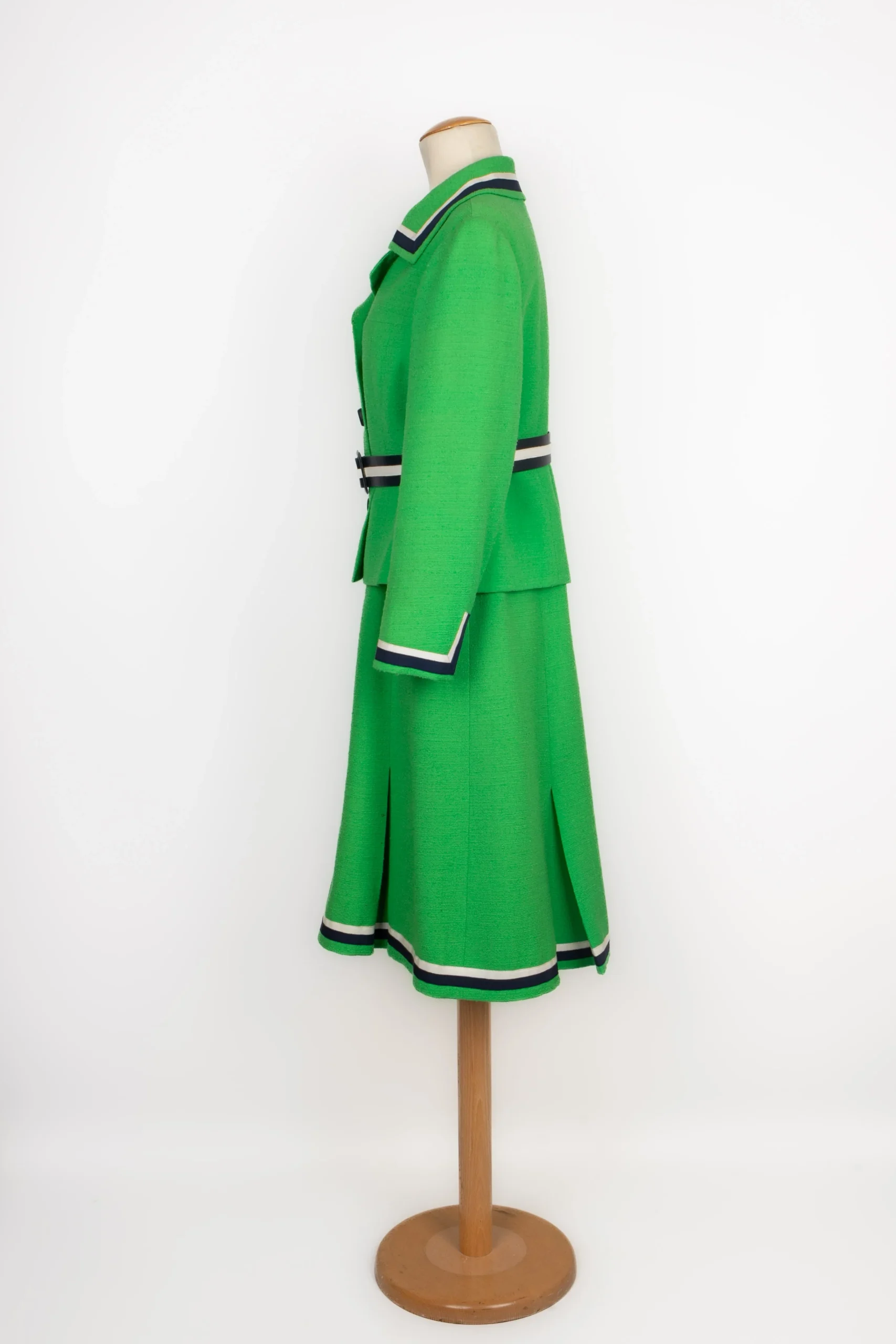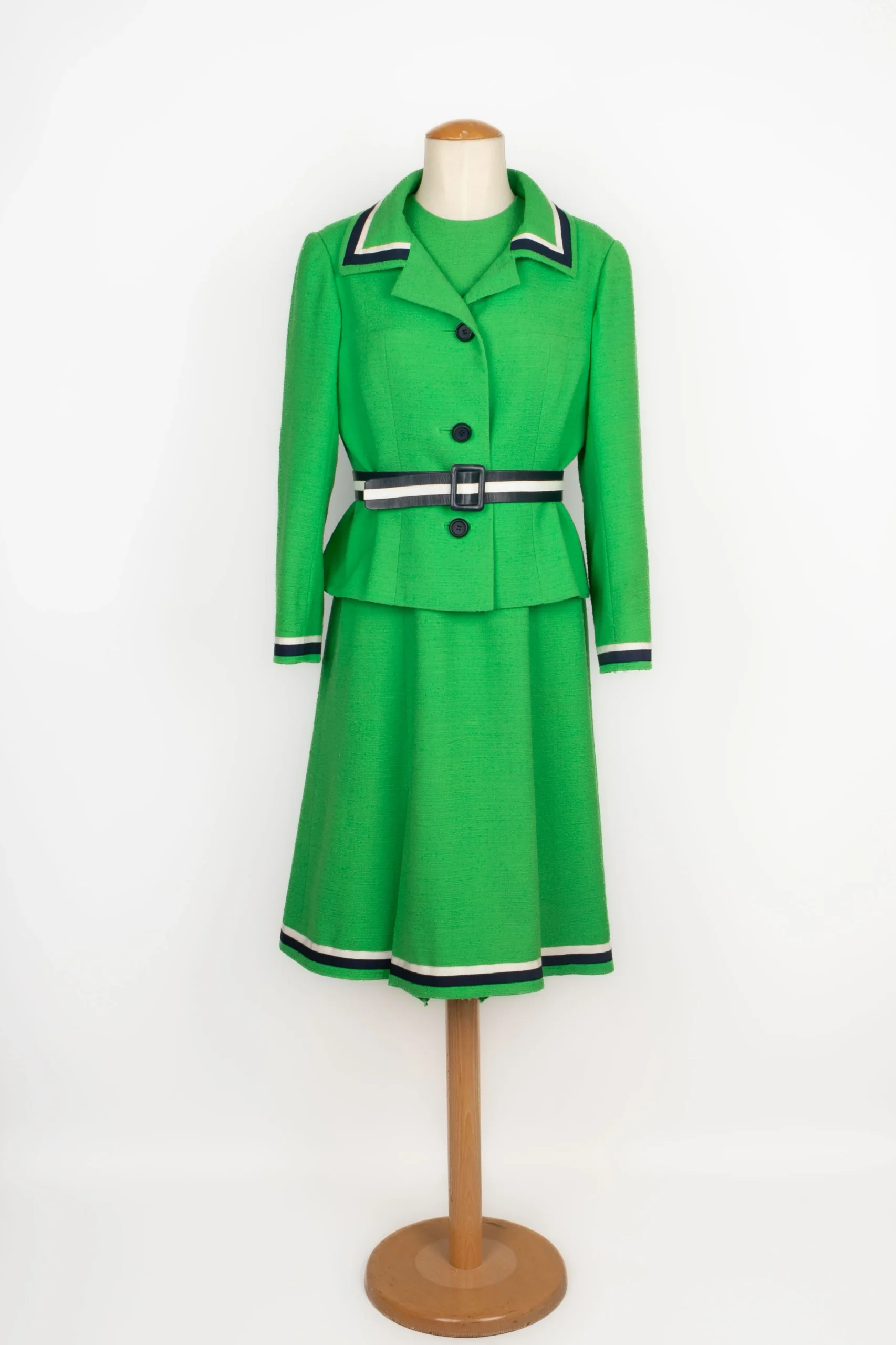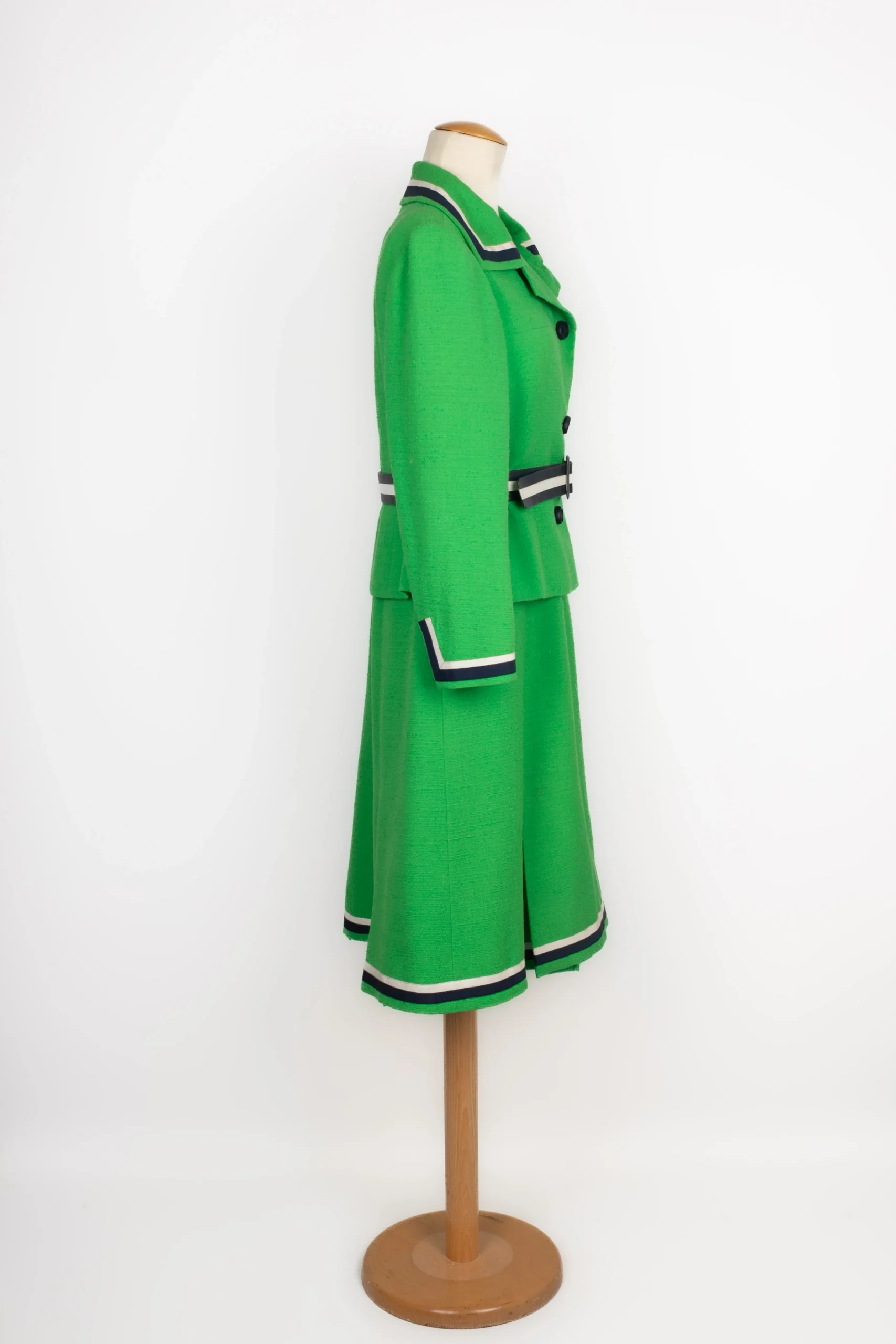 BALMAIN -(Made in France) Ensemble composé d’une veste et d’une robe en lainage vert, et parements à galon en gros grain marine et blanc. Etiquette de taille et de composition absentes, il convient à un 38FR.