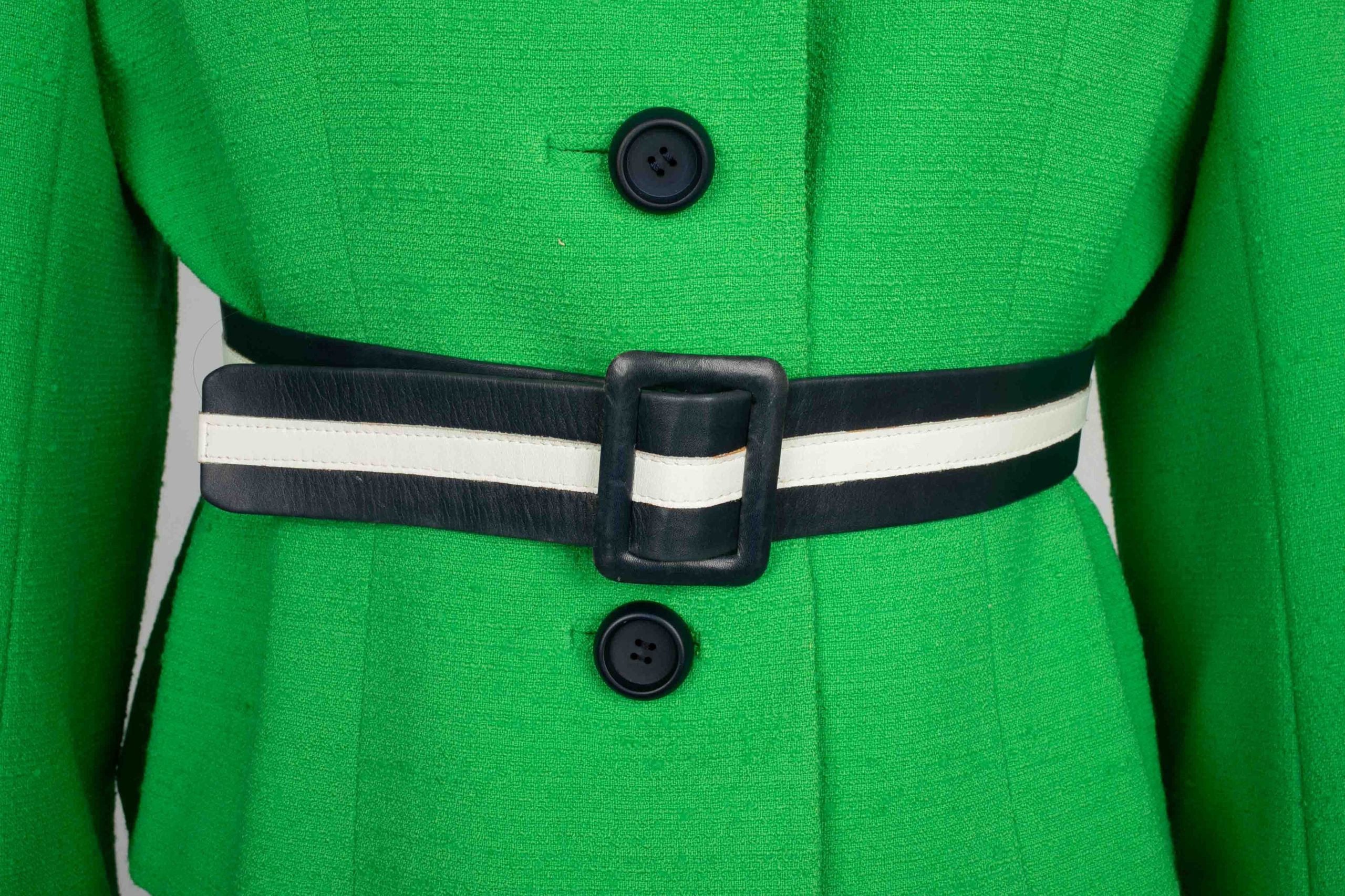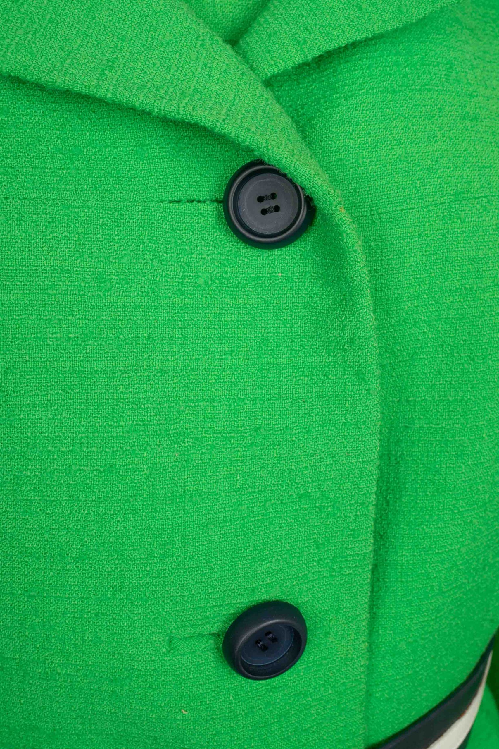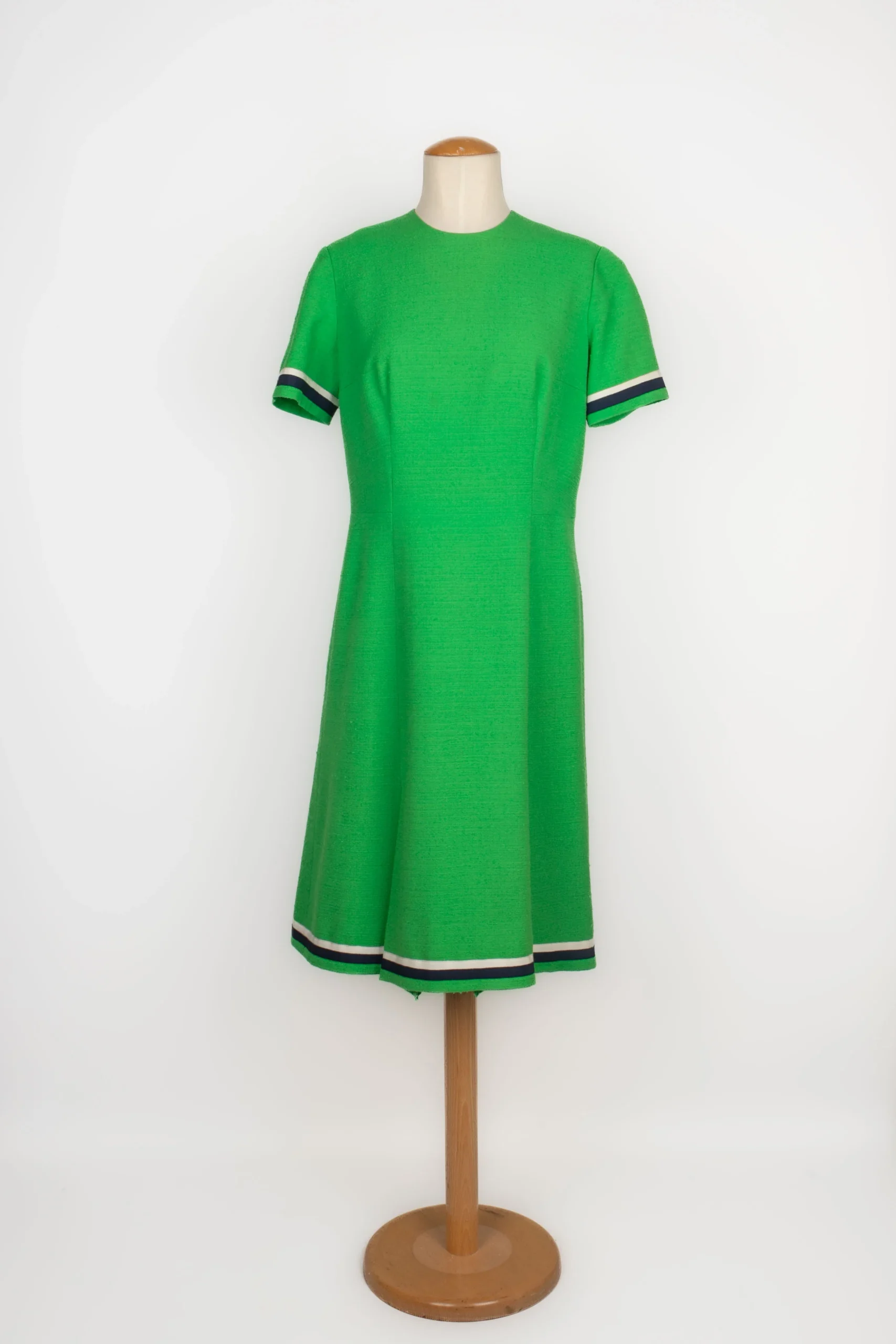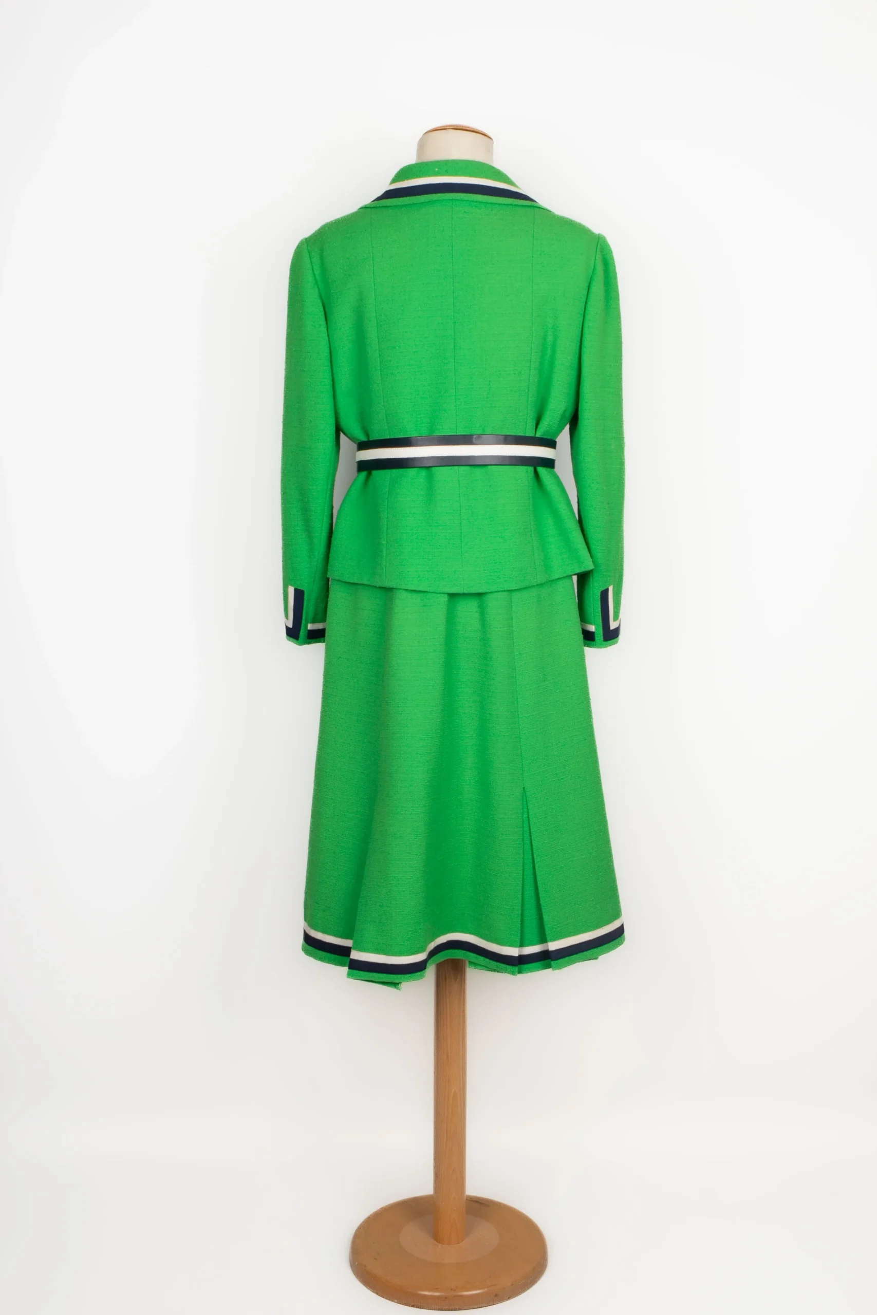 BALMAIN -(Made in France) Ensemble composé d’une veste et d’une robe en lainage vert, et parements à galon en gros grain marine et blanc. Etiquette de taille et de composition absentes, il convient à un 38FR.
